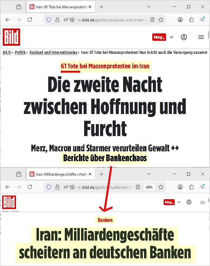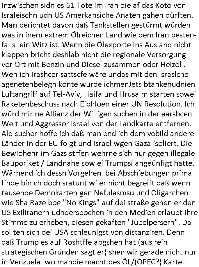 | Inzwischen sidn es 61 Tote im Iran die af das Koto von Israleischn udn US Amerkansiche Anaten gahen dürften. Man berichtet davon daß Tankstellen gestürmt würden was in inem extrem Ölreichen Land wie dem Iran besten-falls ein Witz ist. Wenn die Ölexporte ins Ausland nicht klappen bricht deshlab nicht die regionale Versorgung vor Ort mit Benzin und Diesel zusammen oder Heizöl . Wen ich irashcer sattscfe wäre undas mit den Israslche agenetenbelegn könte würde ichmenJets btankenudnien Luftangriff auf Tel-Aviv, Haifa und Hrusalm starten sowei Raketenbeschuss nach Eibhloen einer UN Resolution. Ich würd mir ne Allianz der Willigen suchen in der aarsbcen Welt und Aggressor Israel von der Landkarte entfernen. Ald sucher hoffe ich daß man endlich dem vobild andere Länder in der EU folgt und Israel wgen Gaza isoliert. Die Bewiohenr im Gazs strfen wehrne sich nur gegen illegale Bauporjket / Landnahe sow ei Trumpsi angeünfigt hatte. Wärhend ich dessn Vorgehen bei Abschiebungen prima finde bin ch doch sratunt wi er nicht begreift daß wenn tausende Demokarten gen Nefulasmsu und Oligarchen wie Sha Raze boe "No Kings" auf dei straße gehen er den US Exiliranern udnderspochen in den Medien erlaubt ihre Stimme zu erheben, diesen gekaften "Jubelpersern". Da sollten sich dei USA schleunigst von distanziren. Denn daß Trump es auf Roshtffe abgshen hat (aus rein strategischen Gründen sagt er) shen wir gerade nicht nur in Venzuela wo mandie macht des ÖL/(OPEC?) Kartell