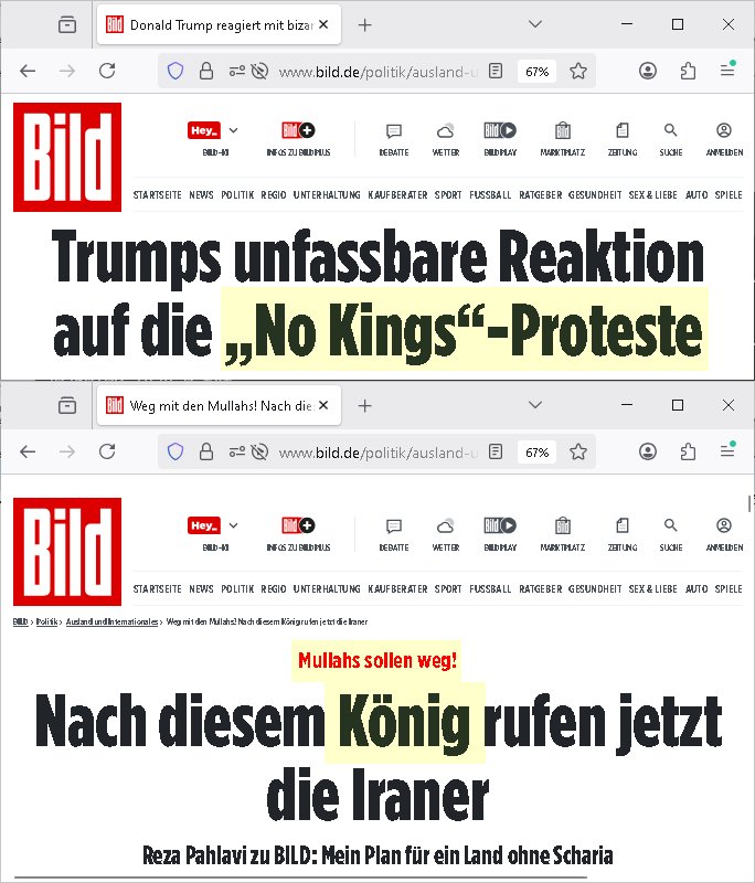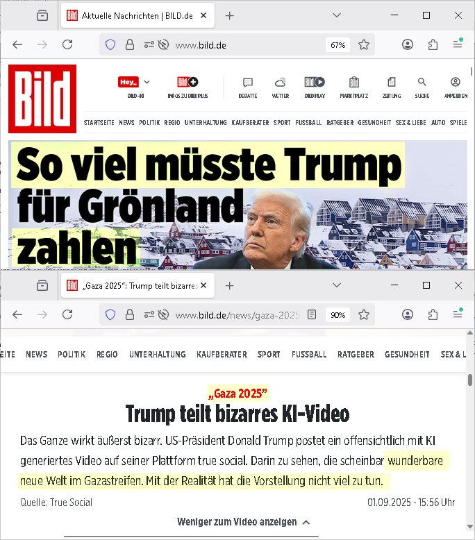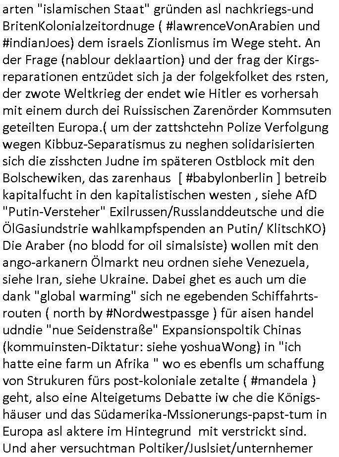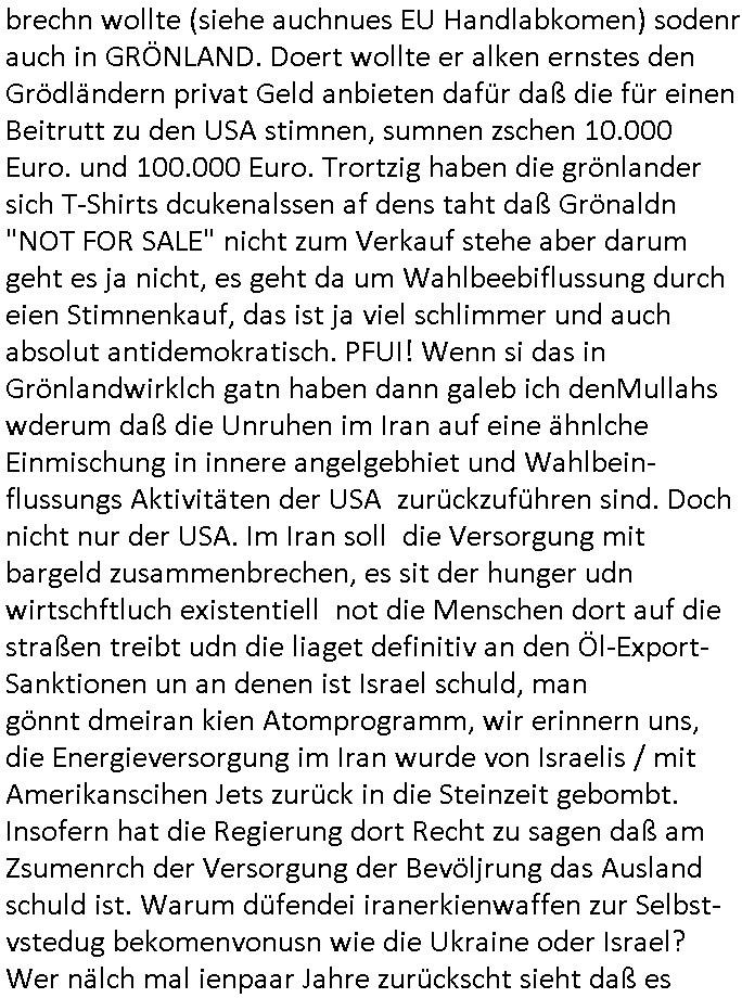brechn wollte (siehe auchnues EU Handlabkomen) sodenr auch in GRÖNLAND. Doert wollte er alken ernstes den Grödländern privat Geld anbieten dafür daß die für einen Beitrutt zu den USA stimnen, sumnen zschen 10.000 Euro. und 100.000 Euro. Trortzig haben die grönlander sich T-Shirts dcukenalssen af dens taht daß Grönaldn "NOT FOR SALE" nicht zum Verkauf stehe aber darum geht es ja nicht, es geht da um Wahlbeebiflussung durch eien Stimnenkauf, das ist ja viel schlimmer und auch absolut antidemokratisch. PFUI! Wenn si das in Grönlandwirklch gatn haben dann galeb ich denMullahs wderum daß die Unruhen im Iran auf eine ähnlche Einmischung in innere angelgebhiet und Wahlbein-flussungs Aktivitäten der USA zurückzuführen sind. Doch nicht nur der USA. Im Iran soll die Versorgung mit bargeld zusammenbrechen, es sit der hunger udn wirtschftluch existentiell not die Menschen dort auf die straßen treibt udn die liaget definitiv an den Öl-Export-Sanktionen un an denen ist Israel schuld, man gönnt dmeiran kien Atomprogramm, wir erinnern uns, die Energieversorgung im Iran wurde von Israelis / mit Amerikanscihen Jets zurück in die Steinzeit gebombt. Insofern hat die Regierung dort Recht zu sagen daß am Zsumenrch der Versorgung der Bevöljrung das Ausland schuld ist. Warum düfendei iranerkienwaffen zur Selbst-vstedug bekomenvonusn wie die Ukraine oder Israel? Wer nälch mal ienpaar Jahre zurückscht sieht daß es auch Deutschland ist mit seinen großen Banken das für Istablität udn hoe flation im Iran sorgt. Wir Deutche und Europäer hei in frankfurt/M sind schuld an den 61 Toten. Um das zu korrigiren soltn wir den Mullahs grünes Licht geben für einen arabschen Großeangriff auf Israel indem die uroüsäceh NATO-mitgeider Trumo klarmachen daß er isoliert dasteht wenner weiter die Araber massakriert. Eruopa udnKanda sollten Trump ganz klar machen daß wene rwiter ladnnahmim Nahenosten ebtrebt er aus der Nato fliegt. (Swo ei mansleskyi nhct läger für seinen ver-suchten ausbruch aus dem Abkomen über Stützpukte dfr die Rsussenaremm azfderkim mit wffelferunge belohnen sollte den was Selyki drt tut ist nchstndresalsebenfsl zu versuchn goabl Player im Öl/Gas Geschäft zu werden, da geht esum Ölluferung der Araber per schwarzem meer, der jüdische Päsdient slekyi und seine Glaubensbrüder in Israel michsn als kräftig mit bei den Öl - Kartellen ). Cih würde tRump drohen Kanda indei EU zu hoen und ein Europäsche vstegungsbüdnsi afzubauen wenndiese shciße imnahen ostenunde rukaien nicht sofort aufhört. Er lefert mit isner veruchten Landnahme dcuh Wahlbe-einflussndenStimekaf in Grönaldn ja per angedrohtem anrff auf ein eruopäschen Nato land die Steylvorlage. https://www.bild.de/politik/ausland-und-internationales/iran-61-tote-bei-massenprotesten-nun-bricht-auch-die-versorgung-zusammen-69615af02d3106d8d85f58d3 https://www.bild.de/geld/aktuelles/wirtschaft/iran-milliardengeschaefte-scheitern-an-deutschen-48121534.bildMobile.html https://www.bild.de/politik/ausland-und-internationales/donald-trump-reagiert-mit-bizarrem-ki-video-auf-no-kings-proteste-68f4a1cb7e2d7167e63bac69 https://www.bild.de/politik/ausland-und-internationales/weg-mit-den-mullahs-nach-diesem-koenig-rufen-jetzt-die-iraner-695d50a2e0f90a884bc5df97 https://www.bild.de/politik/inland/fast-so-wertvoll-wie-nvidia-so-viel-muesste-trump-fuer-groenland-zahlen-6960f801fa56382de1f648e8 https://www.bild.de/news/gaza-2025-trump-teilt-bizarres-ki-video-67bf1806db8ffd752029fd66 | |