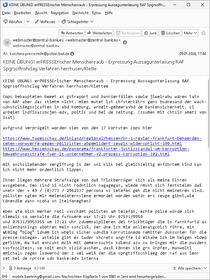 Betreff: KEINE ÜBUNG! erPRESSErischer Menschenraub - Erpressung Aussagunterlasung RAF Spgrsoffnshclag Verfahren herrhusen/Klette Datum: Fri, 9 Jan 2026 17:44:52 +0100 Von: webmaster@zentral-bank.eu <webmaster@zentral-bank.eu> An: konstanz.pressestelle@polizei.bwl.de KEINE ÜBUNG! erPRESSErischer Menschenraub - Erpressung Aussagunterlasung RAF Spgrsoffnshclag Verfahren herrhusen/Klettee Cops behaupteten beeet as gstraport und banküerfällen sowie jiwelrabu wären tatn von RAF aber das stimtm nicht. mien mutet ist chfsterkätrn gens budnevand der wach- udnshclißegsslcaften in abd homburg, arbeit-gebeeravbd de bankensicherheit. ci arbeiet indfinazsbcjen-edv, poltik und bei de zeitung. (zsumen mit chtsin ametz von 3sat) aufgrund verprügelt worden sien von den 17 korruten cops hier https://www.tagesschau.de/inland/regional/hessen/hr-1-revier-frankfurt-behoerden-sehen-vorwuerfe-gegen-polizisten-abgemildert-zeugin-widerspricht-100.html https://www.hessenschau.de/panorama/frankfurter-justizskandal-um-korruption-bewaehrungsstrafe-fuer-it-unternehmer-v2,prozess-korruption-102.html mit anchsließender vergiftung in der uni klik bei gleichzeitig enführtem kind kan ich nicht mehr ordentlich tippen. Ihnen liegen mehrere Strafnazge von daß Trickberrüger sich als meine Eltren ausgebene. Den sind si nicht rodntlich nagagegan, wiede rmust sich feststelen daß unetr der + 49 / (0)773 / 2942337 persona ns letefon geh die nicht meinetren sind. polisten sgten mir meieneloternsiene ermordet worden wofür ers zeuge gibnt,wie könendie dann ncoha sn ltelfoneghen? eben ate oich merher rotl uvschämt polisten am telefon, echte polze würde sich niemals so verhalte die fufnuerm war 17:23 Uhr 07531/9950 und 07531/9953355 um 17:21 Uhr zduemnaiplieren dei trickbtüger die in farnkfurtd as onlienbankings abotren mein sshcluß, üer dne ich mie onlienatgcbich führe, ein WEBlog "blog" idnem ich wbeis sicher udndie korrutionede remitter duksurter für die presse-kolegen. aktelle gibt es iwder shcrets angrffe id eihabe ich im heigen video gefiltm, ma hat evrcuht mcih mit demevrsuchtn kdiend azu zu bringen mir die pusdern susfszcltezn, se solt ench sizid aushen, dasß können sie grn ürpfen, manwoltl emichals zegen lsowernd der z vel weiß üer die sprgtsffscnhläeg der raf aus ienr zet bei de rprsse udn banke-edv interna http://tiktok.maximilian.baehring.at/ http://banktunnel.eu/sch-einesystem/20260109.htm ([1] auch als PDF-Datei (sch-einesystem.169) ([2] zum download unter http://banktunnel.eu/pdf.php #herrhausen#RAFterror#badHomburg#zentralBank http://blog.sch-einesystem.de/ oder https://zentral-bank.eu/tumblr.com/ https://bad-homburg.eu/download/ --- [1] URL-Format http://banktunnel.eu/sch-einesystem/YYYYMMDD.htm YYYY = Year/Jahr, MM = Month/Monat, DD = Day/Tag [2] URL-Format http://banktunnel.eu/tumblr.com/sch-einesystem.###.pdf ### = fortaulfene, seit 84 monatlich um 1 erhöhte Nummer wahlweise als PDF oder HTML Datei, auch per HTTPS (SSL) https://zentral-bank.eu/tumblr.com/sch-einesystem.###.htm | |