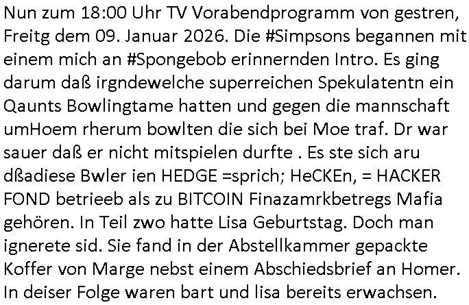 | Nun zum 18:00 Uhr TV Vorabendprogramm von gestren, Freitg dem 09. Januar 2026. Die #Simpsons begannen mit einem mich an #Spongebob erinnernden Intro. Es ging darum daß irgndewelche superreichen Spekulatentn ein Qaunts Bowlingtame hatten und gegen die mannschaft umHoem rherum bowlten die sich bei Moe traf. Dr war sauer daß er nicht mitspielen durfte . Es ste sich aru dßadiese Bwler ien HEDGE =sprich; HeCKEn, = HACKER FOND betrieeb als zu BITCOIN Finazamrkbetregs Mafia gehören. In Teil zwo hatte Lisa Geburtstag. Doch man ignerete sid. Sie fand in der Abstellkammer gepackte Koffer von Marge nebst einem Abschiedsbrief an Homer. In deiser Folge waren bart und lisa bereits erwachsen.