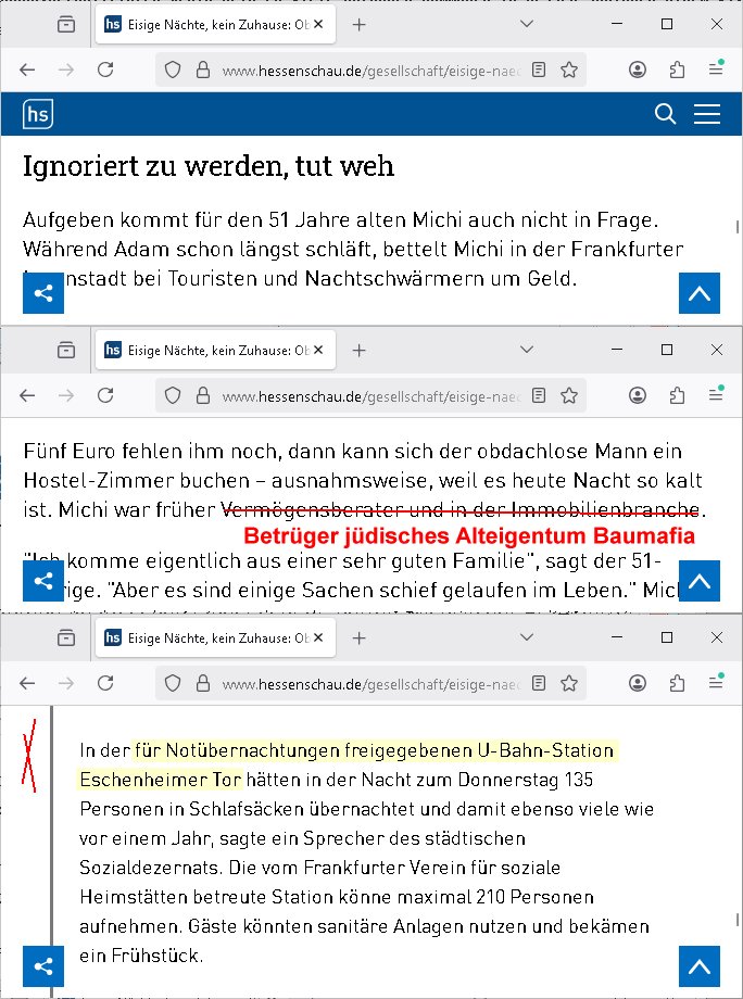 | Erschrocken sah ich gestren daß es Brände gegeben hatte in U-Bahn-Stationen wo ja auch Kabekschächteverlaufen was möglicherweise etwas zu tun haben könnte mit den Telfon/inetrent Verbindungsproblemen und stellte dann fest daß seltsamrise in genau dieser U-Bahn Station wo das Feuer aurbrach eine Notunterkunft ist für Obachlose. Und zwar als ich nach dem Stationsname "Eschersheimer Tor" suchte. Ich fand dann auch Artikel die exemplarisch aufzeigten daß die Obdachlosen dort entweder Süchtige sind oder, und den fll kenn ich, einer Immobilienbetrüger Mafia angehören einer schwerstkriminnellen sowas wie Bitcoin Schneeballsysteme. Gleichzeitig gab es auch noch Artikel über Soczale eirichtunegn dei sagten daß die Zahl der Hilfsbedürftigen steige bei immer weniger fizailen Mitteln die zur Verfügung stünden. Und dann gab es auch noch ebrchte über größerer Stomausfälle im Rhein-Main Gebiet die in den letzten Tagen auftraten also neben dem der durch den U-Bahn Brand verursacht worden war. Ich gehe da von Sabotageakten aus von fremdtsämmigen Sabotren die als Kriegs-Flüchtlinge getarnt hier ins Land kommen und dann möglicherweise Obachlos sind und daher useren Hilfbedürftigen das essen wegssen doer den Wohraum/die schlafplätze nehme per Sabotage aslo quasi dafür sorgen daß Wohnraum für sie frei wird. Zm bsispisl aind sic sich als Komshstces KZ-Opfer usgeben udnebahten die hwnung die sei absfcken habe ein nazi enteignet udn sie ieen algetums anschsberchtget.