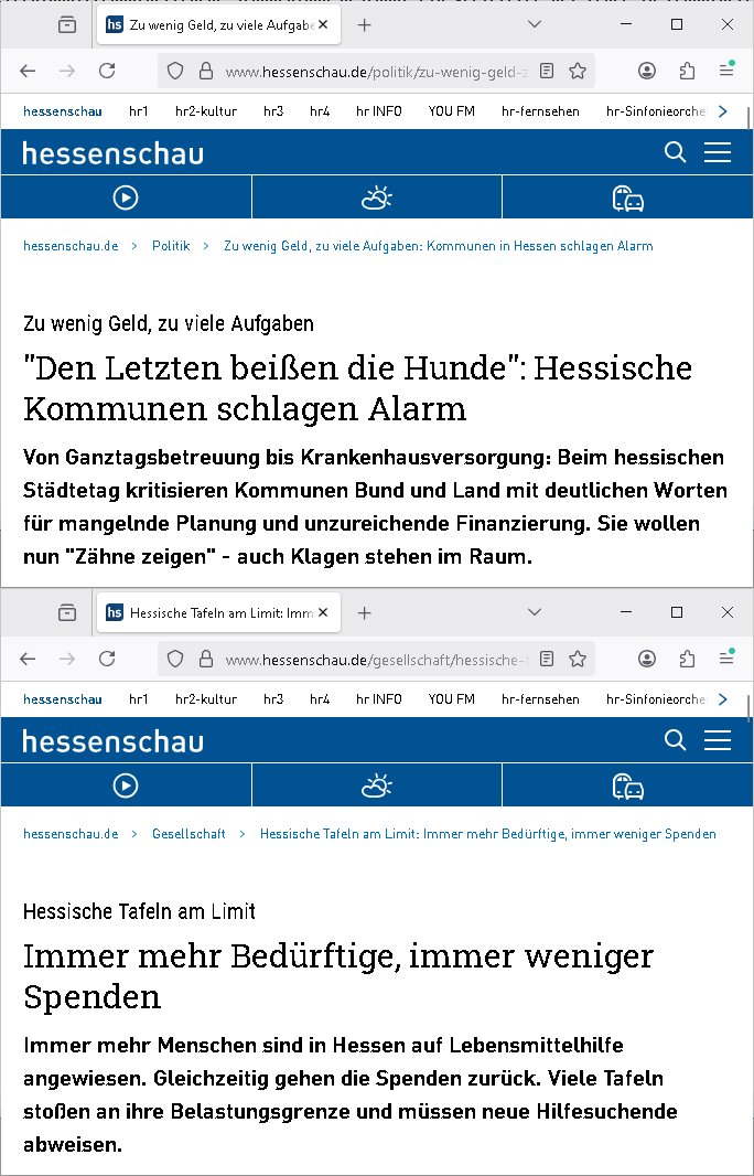 https://www.bild.de/regional/frankfurt/zuege-stundenlang-gestoppt-ein-verletzter-bei-feuer-in-frankfurter-u-bahn-6960ed6b0e8ad021f5546b9b https://www.fnp.de/frankfurt/feuer-in-frankfurter-innenstadt-brand-legt-bahn-verkehr-lahm-94115705.html https://frankfurt.t-online.de/region/frankfurt-am-main/id_101075952/frankfurt-brand-in-u-bahn-station-legt-vier-linien-lahm-evakuierung.html https://frankfurt.t-online.de/region/frankfurt-am-main/id_101069630/stromausfall-in-hessen-laesst-6200-menschen-kurzzeitig-ohne-strom.html https://www.hessenschau.de/panorama/stromausfall-in-koenigstein-und-bad-soden-tausende-menschen-zeitweise-ohne-strom-v5,strom-koenigstein-100.html https://www.ffh.de/nachrichten/top-meldungen/455883-wasserrohrbruch-mainz-weisenau-mit-stromausfall.html https://www.hessenschau.de/gesellschaft/hessische-tafeln-am-limit-immer-mehr-beduerftige-immer-weniger-spenden-v1,hessische-tafen-lebensmittel-situation-100.html https://www.hessenschau.de/politik/zu-wenig-geld-zu-viele-aufgaben-kommunen-in-hessen-schlagen-alarm-v1,staedtetag_forderungen-100.html | |