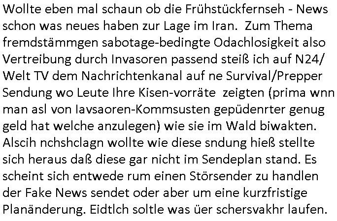 | Wollte eben mal schaun ob die Frühstückfernseh - News schon was neues haben zur Lage im Iran. Zum Thema fremdstämmgen sabotage-bedingte Odachlosigkeit also Vertreibung durch Invasoren passend steiß ich auf N24/ Welt TV dem Nachrichtenkanal auf ne Survival/Prepper Sendung wo Leute Ihre Kisen-vorräte zeigten (prima wnn man asl von Iavsaoren-Kommsusten gepüdenrter genug geld hat welche anzulegen) wie sie im Wald biwakten. Alscih nchshclagn wollte wie diese sndung hieß stellte sich heraus daß diese gar nicht im Sendeplan stand. Es scheint sich entwede rum einen Störsender zu handlen der Fake News sendet oder aber um eine kurzfristige Planänderung. Eidtlch soltle was üer schersvakhr laufen.
