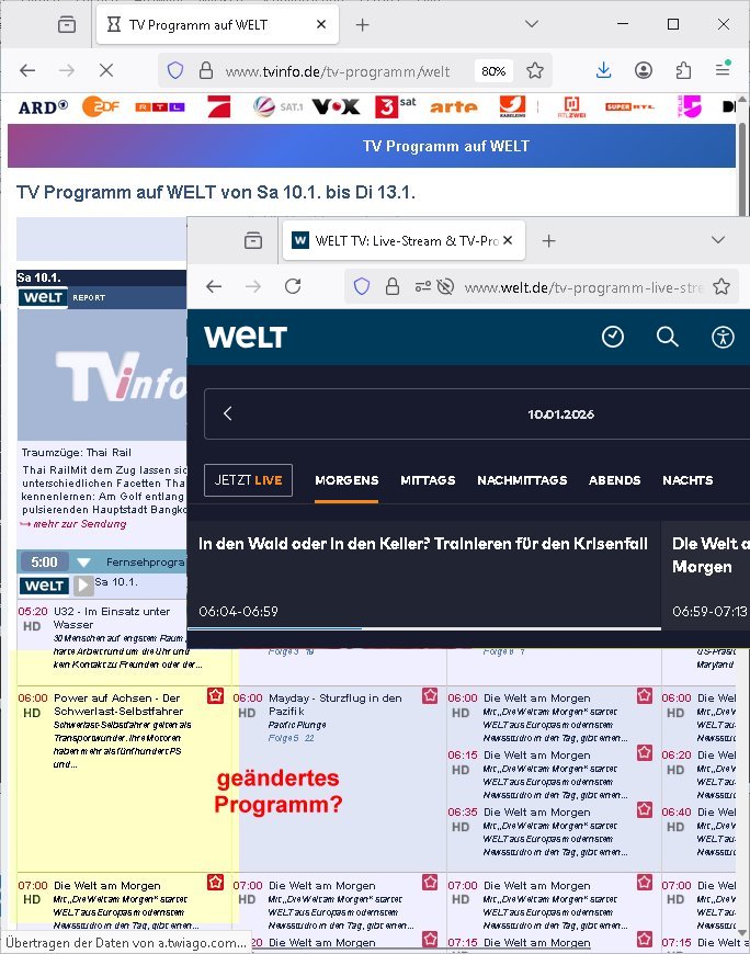 https://www.welt.de/mediathek/reportage/gesellschaft/sendung248937962/In-den-Wald-oder-in-den-Keller-Trainieren-fuer-den-Krisenfall.html Sendung taucht hier (wo sie stehen müsste) nicht auf https://www.tvinfo.de/tv-programm/welt/10.01.2026 ist das irgendwie kurzfristig geändertes programm | |