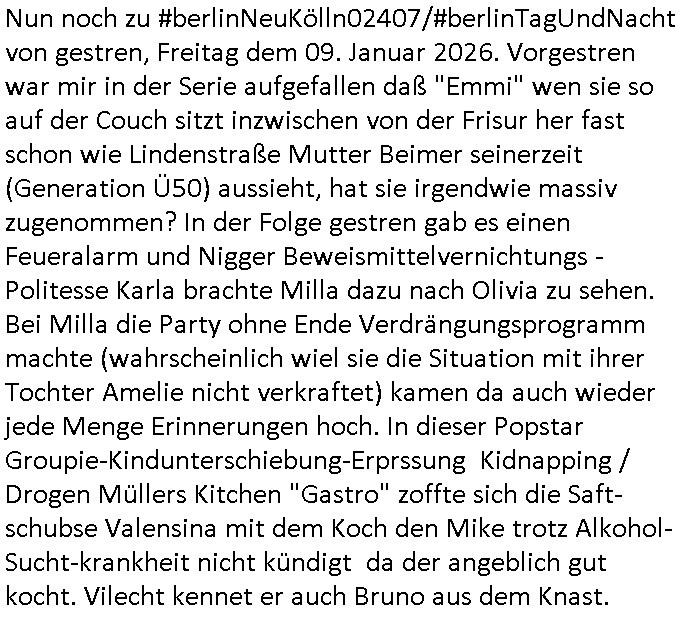 | Nun noch zu #berlinNeuKölln02407/#berlinTagUndNacht von gestren, Freitag dem 09. Januar 2026. Vorgestren war mir in der Serie aufgefallen daß "Emmi" wen sie so auf der Couch sitzt inzwischen von der Frisur her fast schon wie Lindenstraße Mutter Beimer seinerzeit (Generation Ü50) aussieht, hat sie irgendwie massiv zugenommen? In der Folge gestren gab es einen Feueralarm und Nigger Beweismittelvernichtungs - Politesse Karla brachte Milla dazu nach Olivia zu sehen. Bei Milla die Party ohne Ende Verdrängungsprogramm machte (wahrscheinlich wiel sie die Situation mit ihrer Tochter Amelie nicht verkraftet) kamen da auch wieder jede Menge Erinnerungen hoch. In dieser Popstar Groupie-Kindunterschiebung-Erprssung Kidnapping / Drogen Müllers Kitchen "Gastro" zoffte sich die Saft-schubse Valensina mit dem Koch den Mike trotz Alkohol-Sucht-krankheit nicht kündigt da der angeblich gut kocht. Vilecht kennet er auch Bruno aus dem Knast.