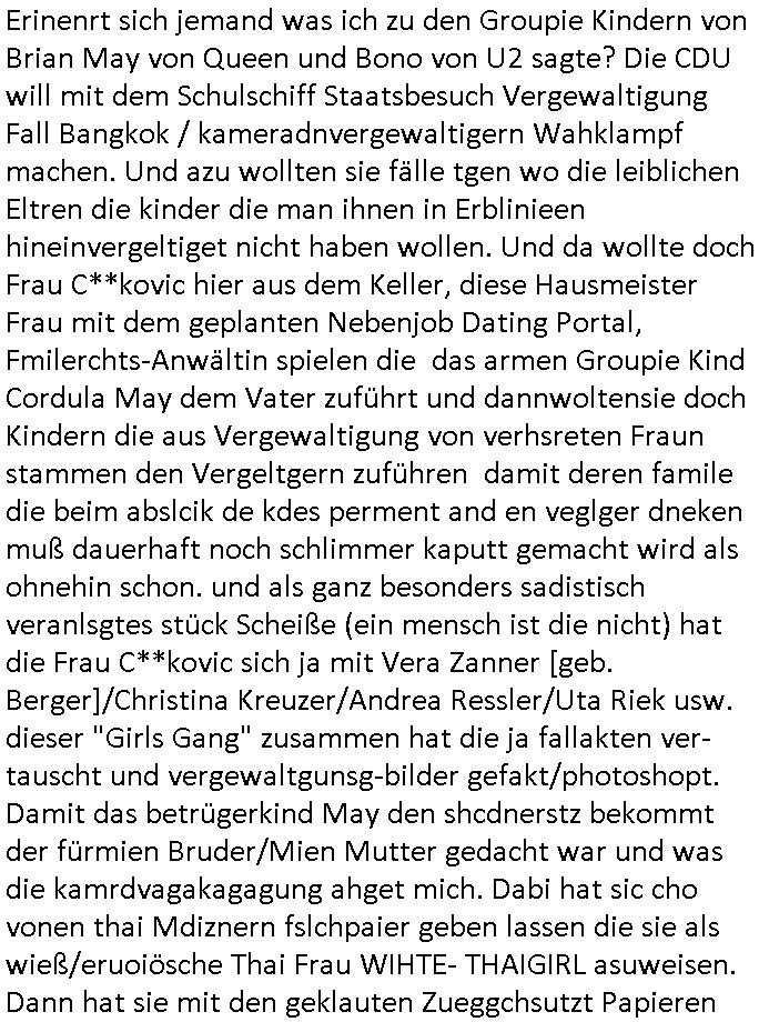 | Erinenrt sich jemand was ich zu den Groupie Kindern von Brian May von Queen und Bono von U2 sagte? Die CDU will mit dem Schulschiff Staatsbesuch Vergewaltigung Fall Bangkok / kameradnvergewaltigern Wahklampf machen. Und azu wollten sie fälle tgen wo die leiblichen Eltren die kinder die man ihnen in Erblinieen hineinvergeltiget nicht haben wollen. Und da wollte doch Frau C**kovic hier aus dem Keller, diese Hausmeister Frau mit dem geplanten Nebenjob Dating Portal, Fmilerchts-Anwältin spielen die das armen Groupie Kind Cordula May dem Vater zuführt und dannwoltensie doch Kindern die aus Vergewaltigung von verhsreten Fraun stammen den Vergeltgern zuführen damit deren famile die beim abslcik de kdes perment and en veglger dneken muß dauerhaft noch schlimmer kaputt gemacht wird als ohnehin schon. und als ganz besonders sadistisch veranlsgtes stück Scheiße (ein mensch ist die nicht) hat die Frau C**kovic sich ja mit Vera Zanner [geb. Berger]/Christina Kreuzer/Andrea Ressler/Uta Riek usw. dieser "Girls Gang" zusammen hat die ja fallakten ver-tauscht und vergewaltgunsg-bilder gefakt/photoshopt. Damit das betrügerkind May den shcdnerstz bekommt der fürmien Bruder/Mien Mutter gedacht war und was die kamrdvagakagagung ahget mich. Dabi hat sic cho vonen thai Mdiznern fslchpaier geben lassen die sie als wieß/eruoiösche Thai Frau WIHTE- THAIGIRL asuweisen. Dann hat sie mit den geklauten Zueggchsutzt Papieren