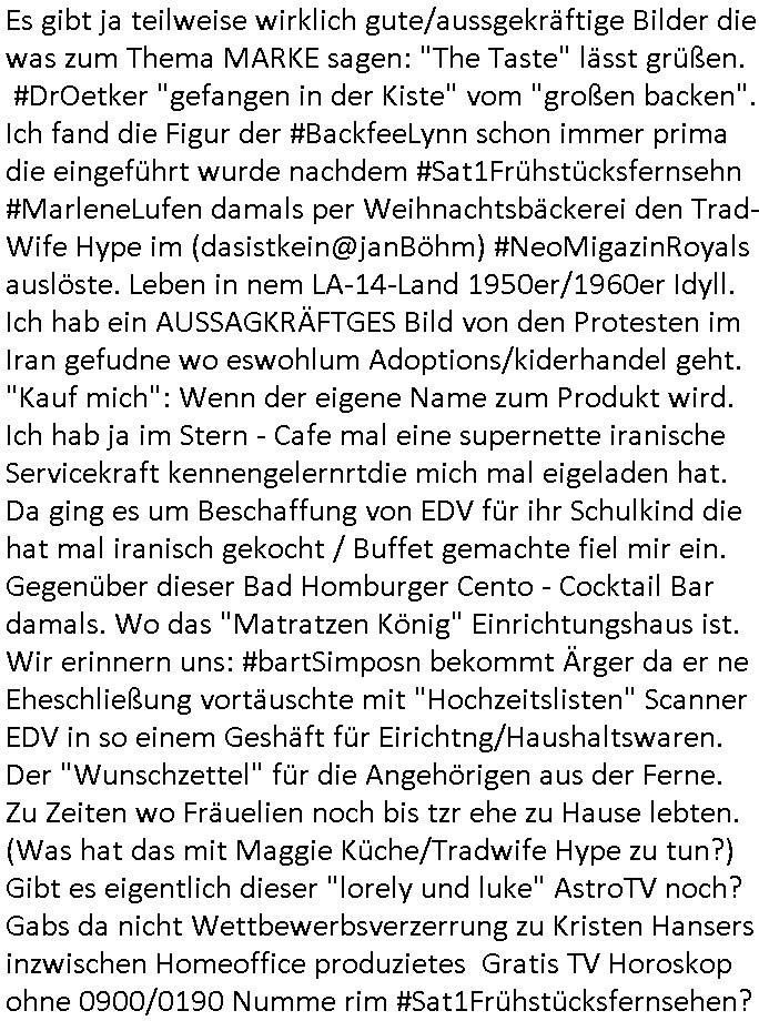 | Es gibt ja teilweise wirklich gute/aussgekräftige Bilder die was zum Thema MARKE sagen: "The Taste" lässt grüßen. #DrOetker "gefangen in der Kiste" vom "großen backen". Ich fand die Figur der #BackfeeLynn schon immer prima die eingeführt wurde nachdem #Sat1Frühstücksfernsehn #MarleneLufen damals per Weihnachtsbäckerei den Trad- Wife Hype im (dasistkein@janBöhm) #NeoMigazinRoyals auslöste. Leben in nem LA-14-Land 1950er/1960er Idyll. Ich hab ein AUSSAGKRÄFTGES Bild von den Protesten im Iran gefudne wo eswohlum Adoptions/kiderhandel geht. "Kauf mich": Wenn der eigene Name zum Produkt wird. Ich hab ja im Stern - Cafe mal eine supernette iranische Servicekraft kennengelernrtdie mich mal eigeladen hat. Da ging es um Beschaffung von EDV für ihr Schulkind die hat mal iranisch gekocht / Buffet gemachte fiel mir ein. Gegenüber dieser Bad Homburger Cento - Cocktail Bar damals. Wo das "Matratzen König" Einrichtungshaus ist. Wir erinnern uns: #bartSimposn bekommt Ärger da er ne Eheschließung vortäuschte mit "Hochzeitslisten" Scanner EDV in so einem Geshäft für Eirichtng/Haushaltswaren. Der "Wunschzettel" für die Angehörigen aus der Ferne. Zu Zeiten wo Fräuelien noch bis tzr ehe zu Hause lebten. (Was hat das mit Maggie Küche/Tradwife Hype zu tun?) Gibt es eigentlich dieser "lorely und luke" AstroTV noch? Gabs da nicht Wettbewerbsverzerrung zu Kristen Hansers inzwischen Homeoffice produzietes Gratis TV Horoskop ohne 0900/0190 Numme rim #Sat1Frühstücksfernsehen?