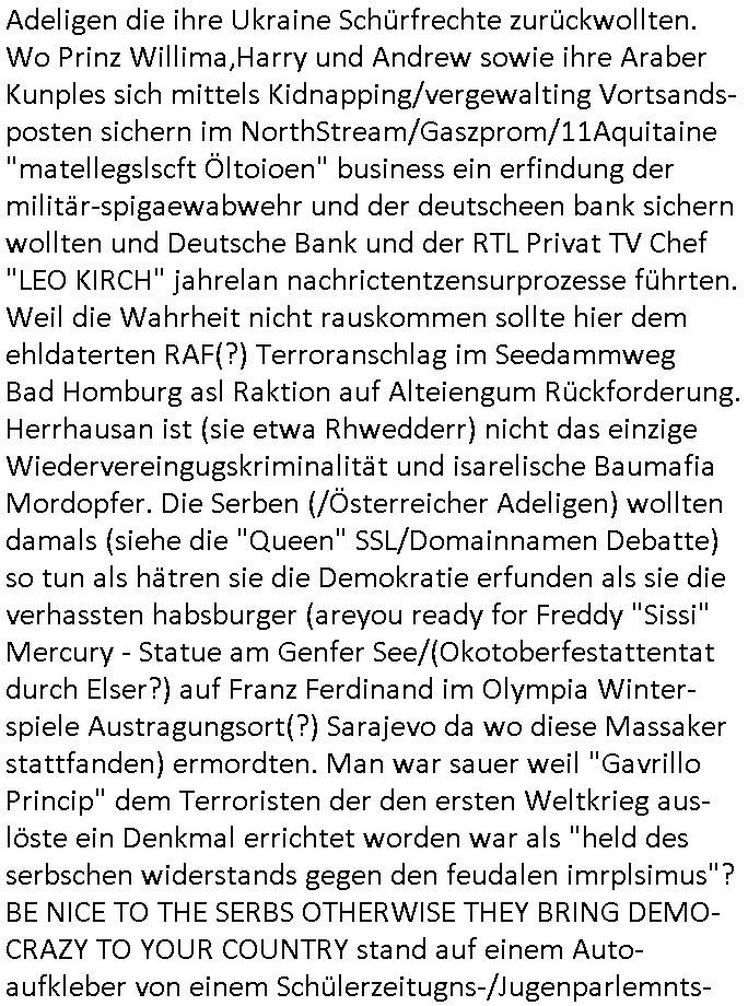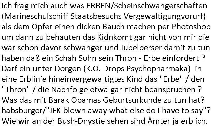 | Ich frag mich auch was ERBEN/Scheinschwangerschaften (Marineschulschiff Staatsbesuchs Vergewaltigungvorurf) als dem Opfer einen dicken Bauch machen per Photoshop um dann zu behauten das Kidnkomt gar nicht von mir die war schon davor schwanger und Jubelperser damit zu tun haben daß ein Schah Sohn sein Thron - Erbe einfordert ? Darf ein unter Dorgen (K.O. Drops Psychopharmaka) in eine Erblinie hineinvergewaltigtes Kind das "Erbe" / den "Thron" / die Nachfolge etwa gar nicht beanspruchen ? Was das mit Barak Obamas Geburtsurkunde zu tun hat? habsburger/"JFK blown away what else do I have to say"? Wie wir an der Bush-Dnystie sehen sind Ämter ja erblich. Eswürde coh niemdn jamdn denren srüzen/emroden nur um über dessen land / besitz vefügen zu können, oder?