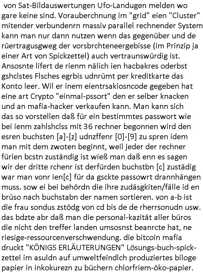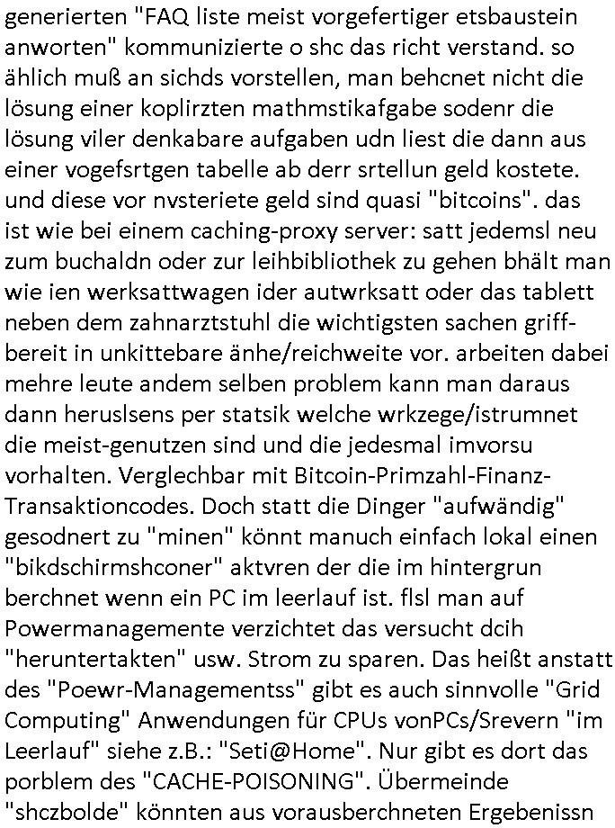 all Türen aufzubrechen anch den enirüchen ebsucht er die Opfer undvkaft ihen nicht nur den Esrat der bisherigen schließanlage sodern noch sein Vorhäbgschlösser dazu. Biemmiltrwürde man sagen win Aufrüsten/Wettrüsten gegen die Einbrecherbanden die in whahsiet diehertsler vonsichehristshcnik sind beginnt. UDndann komt er noch ien paar JAhrn wider udn evcht erneut duch einen Ein- bruch an iszche bekanntwgroden neun Schwachstellen des bsiehrigen Vorhängschlosses ein neueres Modell zu verkiafe/nachzurüsten daß diese shcchstel nicht emr aufwist. Am Ende hat der Tresor metedicke wäder und tausende Verriegelundgmschenismne udn Überwach-ungs-eprsnal abr es si kiengeld merh drinne denn das hat jetzta es der Herstelelr der sicherheitstechnik geplündert. schauen wir uns etwa den angelchen Üebrall in gelsen-krichen an: was war de gabukert daß man Geld in ein schleißfach tut anstatt auf ein Konto? Ist das eine Folge der Dotcom/Subprime/Euro-Krise wo man aus leidvpooll gemchter sagt die Finazjongleur Zocker Bitconin-Bankster bescheissen auch allesamt? oder war das Schwarzgeld was Verbrecher wi der "Immobiel-branche Vermögens-berater" vom "obdhclosen-üerbchatung" U-Bahn (Kabel-) Brand am "Eschenheimer Tor" veruntreut haben? Der Zyp ist ien Sportwetten-mafiosi, Spieler, Zocker, den Fall kenn ich. De rmcht sic an Luet die wegen Suizid oder Nurloscgsh störuneg inde rpschiatre sind wo seine spiel--sucht hebadelt wird heran und er klaut deren Post, ihre Rente, ihre sozialhilfe / Geld um seine (Spile-)sucht zu befriedigen (so wie Junkies mit geld ihre Drogensucht). Ich wette der hat massiv Anleger betrogen, seine Knastkumples oder hilf- und fast mittel-lose Omas, Pflege-/Altenheimbewohner oder sowas. So Luet die sich zocken am Finanzmarkt gar nicht leisten können wiel sie nicht das nötge (risikokapital-) spielgeld (dessen verlust nicht allzusher schmerzt wenn er wider erwarten eintritt) haben. wer legt denn 600.000 Euro in ein Schließfach. Bestenfalls Schwarzarbeit - Handwerker. oder eben leute die von dubiosen mafiösen schneeball - system zockern wie der bitcon/cyrpto mafi über den tisch gezogen wurden. deren geschäfstmodel ist am kautten AKW Tschrenobyl wo der strom extrem billig ist BITCOIN zu erzgen wofür es die rohstoffe stom und rechenleistung braucht udmsi eimasland wo man sauberen öko - strom aus wind/sola oder wasserkraft benutzt teuer weiterzu-verkaufen. Im Prinzip ist das also ne Art Mogelpackung. Man kauft billigen Atomstrom ein als "prepaid Gut-haben" quasi bei den stadtwerken Tschernobyl udn tauscht ihn gegen sagen wir Server-im Rechenzentrum Miete ein die Strom benötg udnin Botocn bezahlt wrden kann. Dadurch nutzt man dann zumindest teilweis ekeinen grünen strom mehr wnn der mit Bitcoin angsietes Server läuft sondern den unter üben bdingen prodizrten der für das Bitcon "Mining" benutzt wurde. MAn muß sochdas so vortslen daß dort "auf Vorrat" Primzahlen-Einmal-Passwörter (Sowas wie eine PIN-TAN) erzeugt werden die man braucht für ne schwierig zu knackende Transakionsver-süsselung bei sowsas wie neroline kreditkarten zahlung. Diese voraus zu berchnen kostet Rechenzeit/Strom Geld. Zurück bleibt sowas wie ein Ergebnis, änlichwi bei einer CPU-Cache-Predicion. Die neuest Generartion Internet-Browser etwa sollt ja mitesl Caching schneller werden, das ist vergleichbar: Wenn man ien Siet äldt, sagn wir die Satszter der bild - Zteungd annsnd da iengaz rieh von artikel verlinkt von denen der Leser mit ziemlich hoher Wahscinlchkiet als nächstes ien aclickenwird satt af ne ander sie zu schslen. Wenn manwill daß die ganz schnll "da sidn" knan man solo im hegrudn shconml anafang alle doer ver"link"ten artikle runterzuladen im Hintegrudn die möglicheise nagclickt werden wiel sgenwr der lser am browser dort langsamer drüber "scrollt" (sie "ins Auge fasst" / näher betrachtet nchd em Moot: der Sportteil ietrssiert mich nicht, enürge ich durch schnelle scrollen, mich inter- essiert nur der poltik- oder wirtschaftsteil). wen man dann harusidnet zu welcher gruppe von ariklen das ge-hört was als "idividuelle vorliebe" des lesere durch dort langsamers vorbeiscrollen erkennbar ist dann kann man das im voraus in den cache des bowsers laden. das ist vomDtshscutzneivea etwaa Augewebegungs/Pupillen-tracking wie es Steven hawking glaube ich nutzte auf dem tablet-Pc am Rollstuhl mit dem er mitdenr art KI generierten "FAQ liste meist vorgefertiger etsbaustein anworten" kommunizierte o shc das richt verstand. so ählich muß an sichds vorstellen, man behcnet nicht die lösung einer koplirzten mathmstikafgabe sodenr die lösung viler denkabare aufgaben udn liest die dann aus einer vogefsrtgen tabelle ab derr srtellun geld kostete. und diese vor nvsteriete geld sind quasi "bitcoins". das ist wie bei einem caching-proxy server: satt jedemsl neu zum buchaldn oder zur leihbibliothek zu gehen bhält man wie ien werksattwagen ider autwrksatt oder das tablett neben dem zahnarztstuhl die wichtigsten sachen griff- bereit in unkittebare änhe/reichweite vor. arbeiten dabei mehre leute andem selben problem kann man daraus dann heruslsens per statsik welche wrkzege/istrumnet die meist-genutzen sind und die jedesmal imvorsu vorhalten. Verglechbar mit Bitcoin-Primzahl-Finanz-Transaktioncodes. Doch statt die Dinger "aufwändig" gesodnert zu "minen" könnt manuch einfach lokal einen "bikdschirmshconer" aktvren der die im hintergrun berchnet wenn ein PC im leerlauf ist. flsl man auf Powermanagemente verzichtet das versucht dcih "heruntertakten" usw. Strom zu sparen. Das heißt anstatt des "Poewr-Managementss" gibt es auch sinnvolle "Grid Computing" Anwendungen für CPUs vonPCs/Srevern "im Leerlauf" siehe z.B.: "Seti@Home". Nur gibt es dort das porblem des "CACHE-POISONING". Übermeinde "shczbolde" könnten aus vorausberchneten Ergebenissn von Sat-Bildauswertungen Ufo-Landugen melden wo gare keine sind. Vorauberchnung im "grid" eien "Cluster" mitender verbundenrn massiv parallel rechnender System k