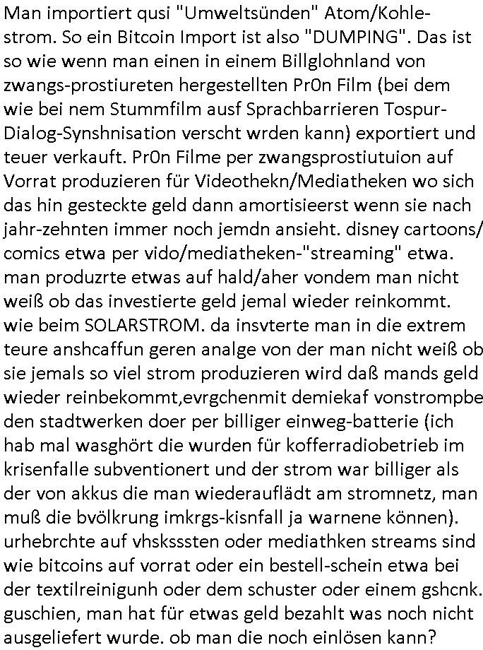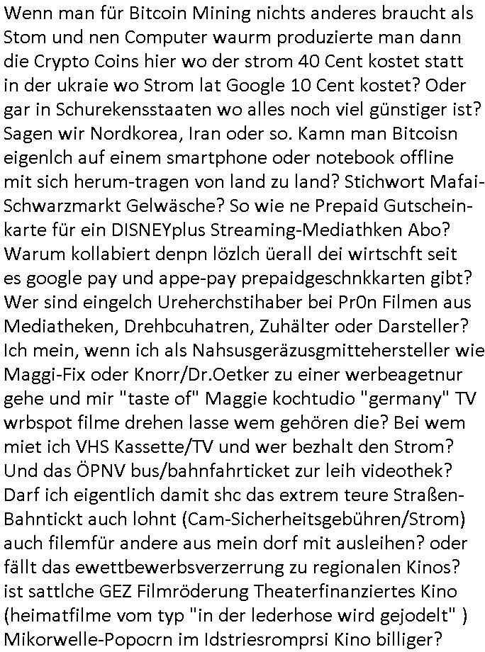 | Wenn man für Bitcoin Mining nichts anderes braucht als Stom und nen Computer waurm produzierte man dann die Crypto Coins hier wo der strom 40 Cent kostet statt in der ukraie wo Strom lat Google 10 Cent kostet? Oder gar in Schurekensstaaten wo alles noch viel günstiger ist? Sagen wir Nordkorea, Iran oder so. Kamn man Bitcoisn eigenlch auf einem smartphone oder notebook offline mit sich herum-tragen von land zu land? Stichwort Mafai-Schwarzmarkt Gelwäsche? So wie ne Prepaid Gutschein- karte für ein DISNEYplus Streaming-Mediathken Abo? Warum kollabiert denpn lözlch üerall dei wirtschft seit es google pay und appe-pay prepaidgeschnkkarten gibt? Wer sind eingelch Ureherchstihaber bei Pr0n Filmen aus Mediatheken, Drehbcuhatren, Zuhälter oder Darsteller? Ich mein, wenn ich als Nahsusgeräzusgmittehersteller wie Maggi-Fix oder Knorr/Dr.Oetker zu einer werbeagetnur gehe und mir "taste of" Maggie kochtudio "germany" TV wrbspot filme drehen lasse wem gehören die? Bei wem miet ich VHS Kassette/TV und wer bezhalt den Strom? Und das ÖPNV bus/bahnfahrticket zur leih videothek? Darf ich eigentlich damit shc das extrem teure Straßen-Bahntickt auch lohnt (Cam-Sicherheitsgebühren/Strom) auch filemfür andere aus mein dorf mit ausleihen? oder fällt das ewettbewerbsverzerrung zu regionalen Kinos? ist sattlche GEZ Filmröderung Theaterfinanziertes Kino (heimatfilme vom typ "in der lederhose wird gejodelt" ) Mikorwelle-Popocrn im Idstriesromprsi Kino billiger?