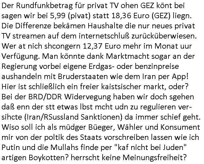 Der Rundfunkbetrag für privat TV ohen GEZ könt bei sagen wir bei 5,99 (pivat) statt 18,36 Euro (GEZ) liegn. Die Differenze bekämen Haushalte die nur neues privat TV streamen auf dem internetschluß zurücküberwiesen. Wer at nich shcongern 12,37 Euro mehr im Monat zur Verfügung. Man könnte dank Marktmacht sogar an der Regierung vorbei eigene Erdgas- oder benzinpreise aushandeln mit Bruderstaaten wie dem Iran per App! Hier ist schließlich ein freier kaistsischer markt, oder? Bei der BRD/DDR Widervegung haben wir doch sgehen daß enn der stt etwas lbst mcht udn zu regulieren ver-sihcte (Iran/RSussland Sanktionen) da immer schief geht. Wiso soll ich als müdger Büeger, Wähler und Konsument mir von der poltik des Staats vorschreiben lassen wie ich Putin und die Mullahs finde per "kaf nicht bei Juden" artigen Boykotten? herrscht keine Meinungsfreiheit? | |