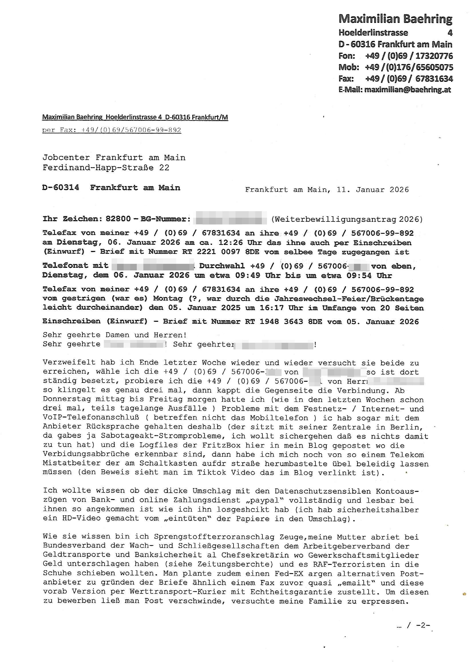 per Fax: +49/(0)69/567006-99-892 Jobcenter Frankfurt am Main Ferdinand-Happ-Straße 22 D-60314 Frankfurt am Main Frankfurt am Main, 11. Januar 2026 Ihr Zeichen: 82800 – BG-Nummer: *** (Weiterbewilligungsantrag 2026) Telefax von meiner +49 / (0)69 / 67831634 an ihre +49 / (0)69 / 567006-99-892 am Dienstag, 06. Januar 2026 am ca. 12:26 Uhr das ihne auch per Einschreiben (Einwurf) – Brief mit Nummer RT 2221 0097 8DE vom selbee Tage zugegangen ist Telefonat mit *** Durchwahl +49 / (0)69 / 567006-*** von eben, Dienstag, dem 06. Januar 2026 um etwa 09:49 Uhr bis um etwa 09:54 Uhr Telefax von meiner +49 / (0)69 / 67831634 an ihre +49 / (0)69 / 567006-99-892 vom gestrigen (war es) Montag (?, war durch die Jahreswechsel-Feier/Brückentage leicht durcheinander) den 05. Januar 2025 um 16:17 Uhr im Umfange von 20 Seiten Einschreiben (Einwurf) – Brief mit Nummer RT 1948 3643 8DE vom 05. Januar 2026 Sehr geehrte Damen und Herren! Sehr geehrte ***! Sehr geehrte ***! Verzweifelt hab ich Ende letzter Woche wieder und wieder versucht sie beide zu erreichen, wähle ich die +49 / (0)69 / 567006-*** von *** so ist dort ständig besetzt, probiere ich die +49 / (0)69 / 567006-*** von Herrn *** so klingelt es genau drei mal, dann kappt die Gegenseite die Verbindung. Ab Donnerstag mittag bis Freitag morgen hatte ich (wie in den letzten Wochen schon drei mal, teils tagelange Ausfälle ) Probleme mit dem Festnetz- / Internet- und VoIP-Telefonanschluß ( betreffen nicht das Mobiltelefon ) ic hab sogar mit dem Anbieter Rücksprache gehalten deshalb (der sitzt mit seiner Zentrale in Berlin, da gabes ja Sabotageakt-Stromprobleme, ich wollt sichergehen daß es nichts damit zu tun hat) und die Logfiles der FritzBox hier in mein Blog gepostet wo die Verbidungsabbrüche erkennbar sind, dann habe ich mich noch von so einem Telekom Mistatbeiter der am Schaltkasten aufdr straße herumbastelte übel beleidig lassen müssen (den Beweis sieht man im Tiktok Video das im Blog verlinkt ist). Ich wollte wissen ob der dicke Umschlag mit den Datenschutzsensiblen Kontoaus-zügen von Bank- und online Zahlungsdienst „paypal“ vollständig und lesbar bei ihnen so angekommen ist wie ich ihn losgeshcikt hab (ich hab sicherheitshalber ein HD-Video gemacht vom „eintüten“ der Papiere in den Umschlag). Wie sie wissen bin ich Sprengstoffterroranschlag Zeuge,meine Mutter abriet bei Bundesverband der Wach- und Schließgesellschaften dem Arbeitgeberverband der Geldtransporte und Banksicherheit al Chefsekretärin wo Gewerkschaftsmitglieder Geld unterschlagen haben (siehe Zeitungsberchte) und es RAF-Terroristen in die Schuhe schieben wollten. Man plante zudem einen Fed-EX argen alternativen Post-anbieter zu gründen der Briefe ähnlich einem Fax zuvor quasi „emailt“ und diese vorab Version per Werttransport-Kurier mit Echtheitsgarantie zustellt. Um diesen zu bewerben ließ man Post verschwinde, versuchte meine Familie zu erpressen. Die Gewerkschaftler waren der Meinung bei normalen Schreiben seien die Gebühren und Versicherungsgarantiesummen wen mal Post wegkommen viele zu niedrig. Wie sie vielleicht gesehen haben hat jetzt in Nähe der EZB tatsächlich ein alternativer Postdienstleister sein Ladengeschäft eröffnete mit (soweit ich das gesehen habe) Spezialgebiet „Versand Ukraine“. Ich bin aus diesen Zusteller Kreisen ganz massiv bedroht worden beschwere mich schon seit Jahren immer wieder über verschwindende Post, bemerkt habe ich das bei Wahlbenachrichtigungen, später bestätigten Post/Bank auf meine schriftlichen Beschwerden hin daß sie ermittelt hätten daß es tatsächlich Postunterschlagung gegeben habe. Daher bin ich was das angeht so sensibel. Ich werde die nächsten (Werk-)tage (heute ist Sonntag) nochmal probieren sie auf telefonischem Wege zu erreichen, vielleicht ist es aber einfacher wenn sie parallel dazu versuchen mich unter der +49 / (0)69 / 17320776 (Festnetz) oder +49 / (0)176 / 65605075 (Mobil) zu erreichen. Vielleicht können sie dann auch bereits sagen ob sie wider erwarten noch weitre Unterlagen von mir benötigen. Letztes Jahr musste ich weil bei ihnen niemand zu erreichen war und mir an der Rezeption in der Ferdinand-Happ-Straße 22, 60314 Frankfurt /M. niemand sagen konnte welche Post eingegangen war gleich mehrfach persönlich vorbeischauen und Dokumente doppelt und dreifach einreichen. In ganz ähnlicher Situation habe ich in der Vergangenheit vor Verzweiflung auch schon Suizidversuche unternommen weil ich behördlich mehrfache „verarscht“ wurde. Auch das ist bestens dokumentiert und Bestandteil strafrechtlicher Aufarbeitung. Wie sie wissen hat man mich im Krankenhaus mit falschen Medikamenten vergiftet um so zu verhindern daß ich vor Gericht aussagen kann, da geht es auch um Korruption im Medizinbereich (unter andrem im Zeugenschutz,ich hab ja auch mal Zivildienst geleistet). Gezielt versucht man mich zu demoralisieren nicht gegen korrupte Kollegen auszusagen. In meinem als PDF ausgedruckt über 35.000 DIN A4 Seiten umfassenden Blog kann man das alles nachlesen wie ich etwa vor Gericht kämpfe. Die Korruption der Kartelle hindert mich ja daran arbeiten zu können. Sie wissen ja daß ich meiner (auch aufgrund des sorgerechtstechnisch entführten Kindes) Suizidalität wegen mehr-fach mit Mitarbeitern der Suizid-prävention des Stadt- Gesundheitsamtes bei ihnen im Hause vorstellig geworden war. Auch das ist aus dem Online-Tagebuch / Blog ersichtlich. Das führe ich ja genau zu dem Zwecke. Dßa man nachsehen kann wie der Stand der Verfahren ist und wie es mir geht, ganz einfach wegen der mehreren Anschläge auf mich und um trotz mit Gerichtsbeschcluß abgehörter Telefonie mit führen Kollegen aus meiner Zeit bei der Presse und in der Politik oder (Finanz)EDV/IT-Branche kommunizieren zu können so „Onkel Dagobert grüßt seine Neffen per Liveübertragung vom Geiseldrama in Gladbeck als seit # Tagen Gefangener der RAF“ artig. Die Terrorabwehr der Amerikaner hat sogar Hausdurchsuchungen hier