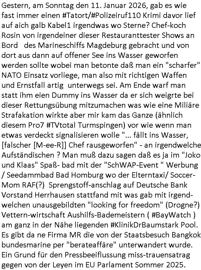 | Gestern, am Sonntag den 11. Januar 2026, gab es wie fast immer einen #Tatort/#Polizeiruf110 Krimi davor lief auf aich galb Kabel1 irgendwas wo Sterne? Chef-koch Rosin von irgendeiner dieser Restauranttester Shows an Bord des Marineschiffs Magdeburg gebracht und von dort aus dann auf offener See ins Wasser geworfen werden sollte wobei man betonte daß man ein "scharfer" NATO Einsatz vorliege, man also mit richtigen Waffen und Ernstfall artig unterwegs sei. Am Ende warf man statt ihm eien Dummy ins Wasser da er sich weigrte bei dieser Rettungsübung mitzumachen was wie eine Miliäre Strafakation wirkte aber mir kam das Ganze (ähnlich diesem Pro7 #TVtotal Turmspingen) vor wie wenn man etwas verdeckt signalisieren wolle "... fällt ins Wasser, [falscher [M-ee-R]] Chef rausgeworfen" - an irgendwelche Aufständischen ? Man muß dazu sagen daß es ja im "Joko und Klaas" Spaß- bad mit der "SchWAP-Event " Werbung / Seedammbad Bad Homburg wo der Elterntaxi/ Soccer-Mom RAF(?) Sprengstoff-anschlag auf Deutsche Bank Vorstand Herrhausen stattfand mit was gab mit irgend-welchen unausgebildten "looking for freedom" (Drogne?) Vettern-wirtschaft Aushilfs-Bademeistern ( #BayWatch ) am ganz in der Nähe liegenden #KlinikDrBaumstark Pool. Es gibt da ne Firma MR die von der Staatsbesuch Bangkok bundesmarine per "berateaffäre" unterwandert wurde. Ein Grund für den Pressbeeiflussung miss-trauensatrag gegen von der Leyen im EU Parlament Sommer 2025.