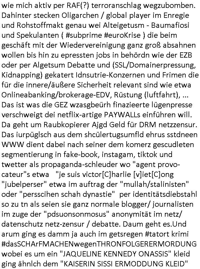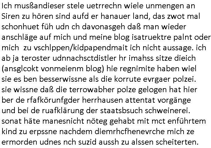 | Ich musßandieser stele uetrrechn wiele unmengen an Siren zu hören sind aufd er hanauer land, das zwot mal schonhuet füh udn ch davonasgeh daß man wieder anschläge auf mich und meine blog isatruektre palnt oder mich zu vschlppen/kidpapendmait ich nicht aussage. ich ab ja teroster udnnachsctdistler hr imahss sitze dieich (ansglcokt vonmeienm blog) hie regnimite haben wiel sie es ben besserwissne als die korrute evrgaer polzei. sie wissne daß die terrowabher polze gelogen hat hier ber de rfafkörunfgder herrhausen attentat vorgänge und bei de ruafklärung der staatsbsuch schweinerei. sonat häte manesnicht nöteg gehabt mit mct enführtem kind zu erpssne nachdem diemrhcfhenevrche mich ze ermorden udnes nch suzid aussh zu alssen scheiterten.