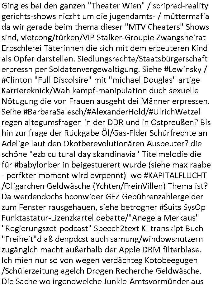 | Ging es bei den ganzen "Theater Wien" / scripred-reality gerichts-shows niczht um die jugendamts- / müttermafia da wir gerade beim thema dieser "MTV Cheaters" Shows sind, vietcong/türken/VIP Stalker-Groupie Zwangsheirat Erbschlerei Täterinnen die sich mit dem erbeuteren Kind als Opfer darstellen. Siedlungsrechte/Staatsbürgerschaft erpressn per Soldatenvergewaltigung. Siehe #Lewinsky / #Clinton "Full Discolsire" mit "michael Douglas" artige Karriereknick/Wahlkampf-manipulation duch sexuelle Nötugung die von Frauen ausgeht dei Männer erpressen. Seihe #BarbaraSalesch/#AlexanderHold/#UlrichWetzel regen altegumsfragen in der DDR und in Ostpreußen? Bis hin zur frage der Rückgabe Öl/Gas-Flder Schürfrechte an Adelige laut den Okotberevolutionären Ausbeuter? die schöne "ezb cultural day skandinavia" Titelmelodie die für #babylonberlin beigestuerert wurde (siehe max raabe - perfkter moment wird evrpennt) wo #KAPITALFLUCHT /Oligarchen Geldwäsche (Ychten/FreinVillen) Thema ist? Da werdendochs hconwider GEZ Gebührenzahlergelder zum Fenster rausgehauen, siehe betrogner #Suits SysOp Funktastatur-Lizenzkartelldebatte/"Anegela Merkaus" "Regierungszet-podcast" Speech2text KI transkipt Buch "Freiheit"d aß denpdcst auch samung/windowsnutzern zugänglch macht außerhalb der Apple DRM filterblase. Ich mien nur so von wegen verdächteg Kotobeegugen /Schülerzeitung agelch Drogen Recherche Geldwäsche. Die Sache wo irgendwelche Junkie-Amtsvormünder aus