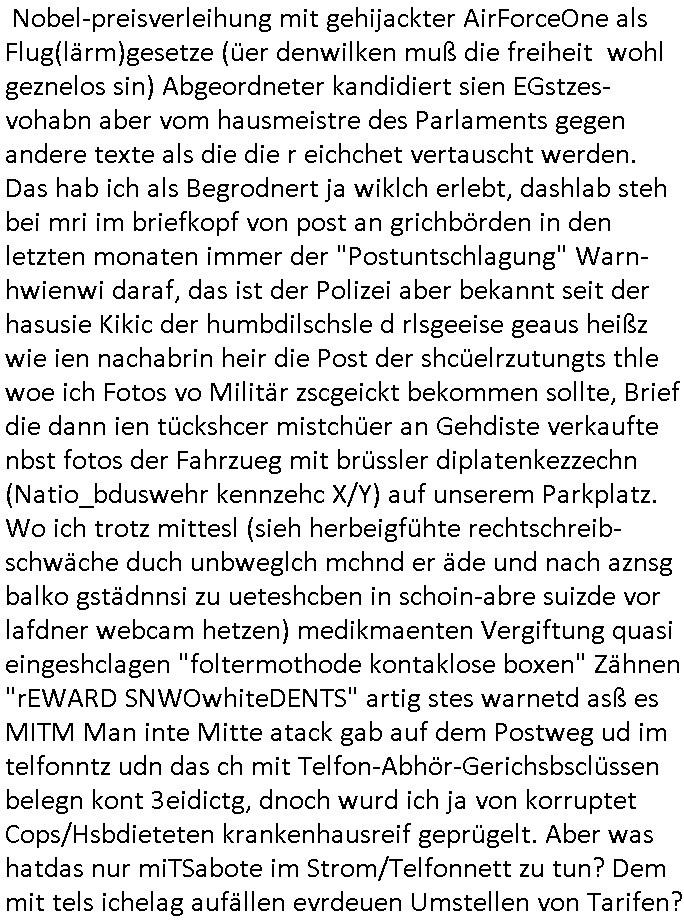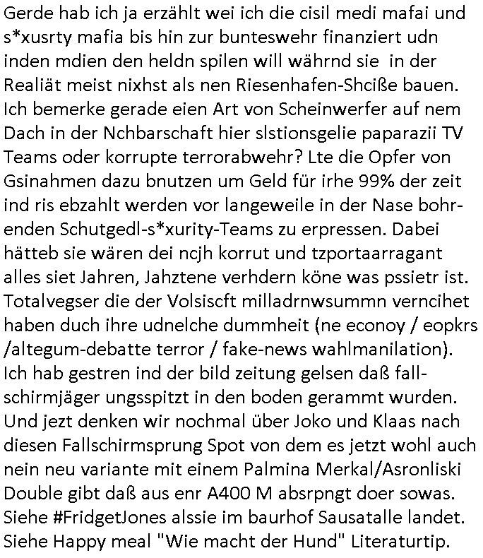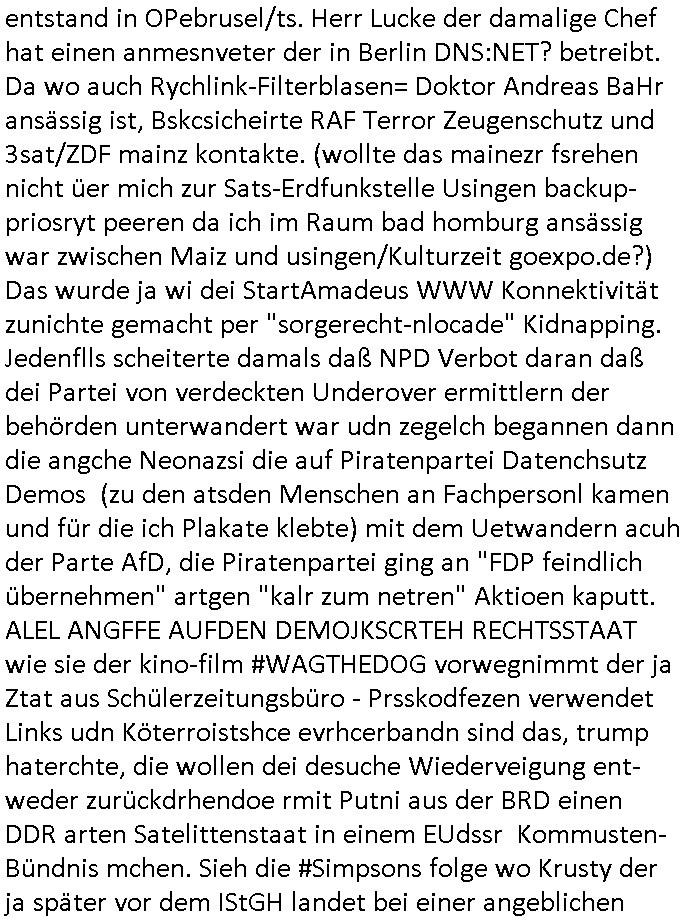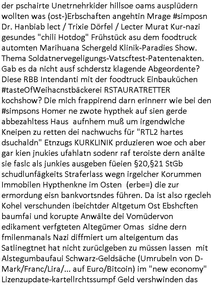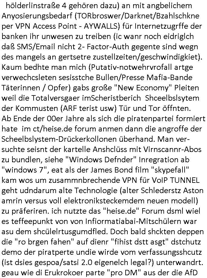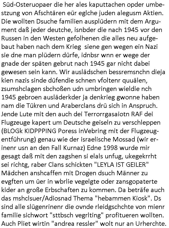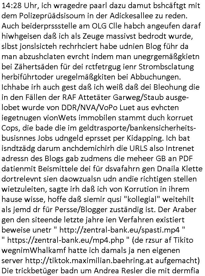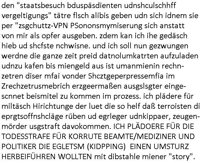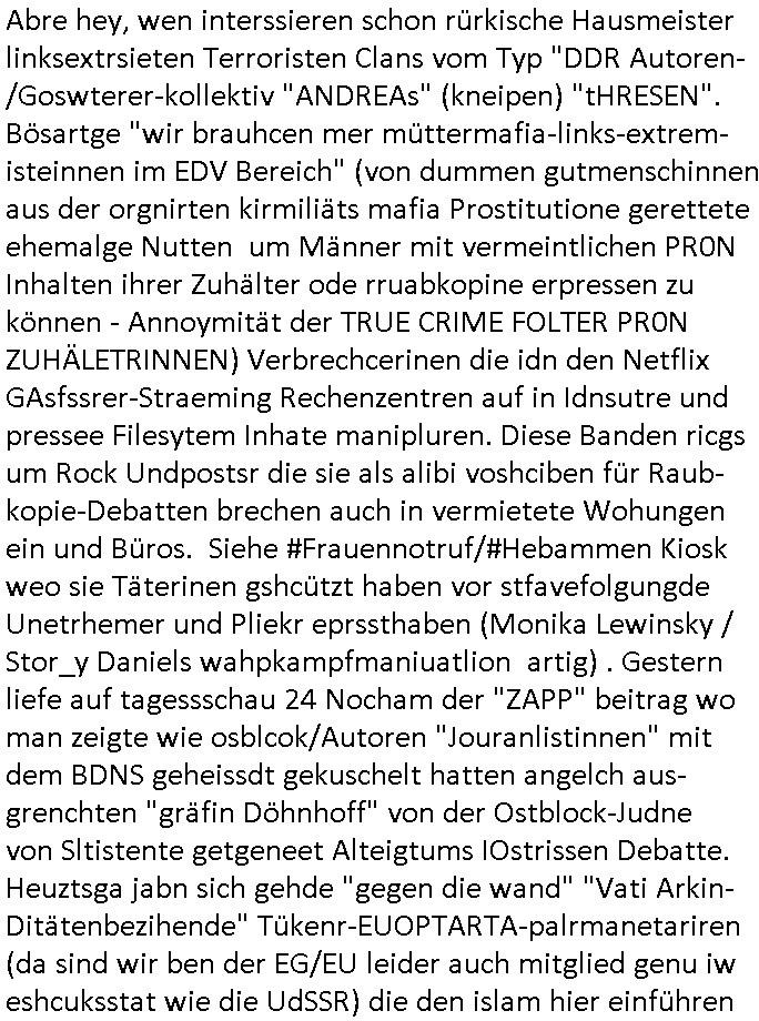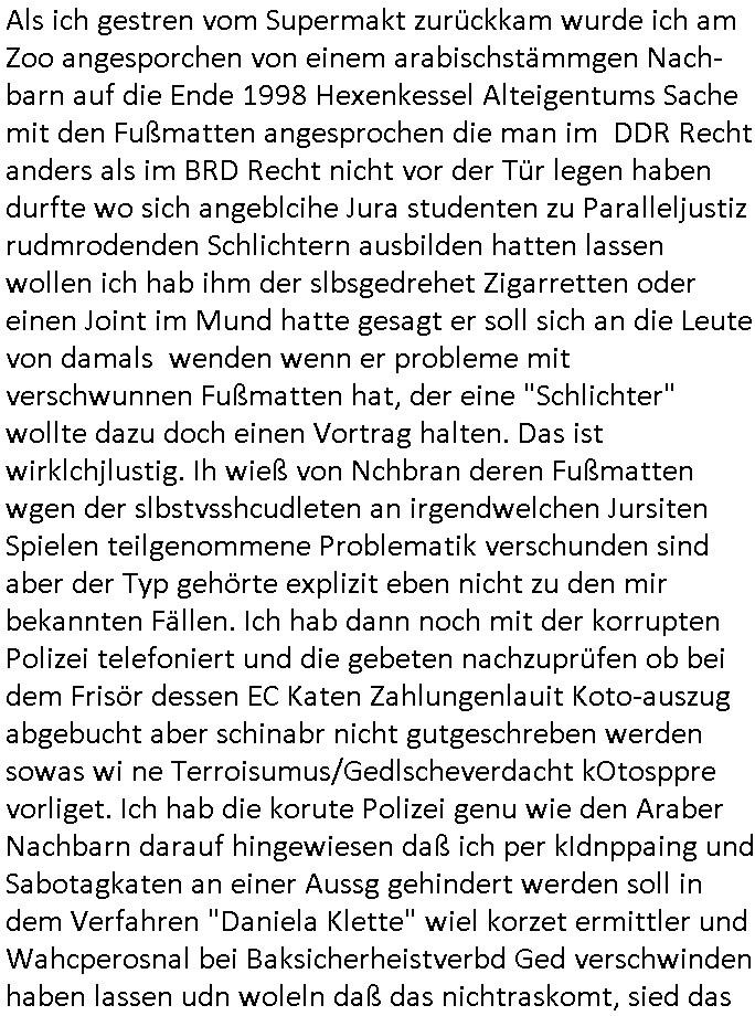 | Als ich gestren vom Supermakt zurückkam wurde ich am Zoo angesporchen von einem arabischstämmgen Nach-barn auf die Ende 1998 Hexenkessel Alteigentums Sache mit den Fußmatten angesprochen die man im DDR Recht anders als im BRD Recht nicht vor der Tür legen haben durfte wo sich angeblcihe Jura studenten zu Paralleljustiz rudmrodenden Schlichtern ausbilden hatten lassen wollen ich hab ihm der slbsgedrehet Zigarretten oder einen Joint im Mund hatte gesagt er soll sich an die Leute von damals wenden wenn er probleme mit verschwunnen Fußmatten hat, der eine "Schlichter" wollte dazu doch einen Vortrag halten. Das ist wirklchjlustig. Ih wieß von Nchbran deren Fußmatten wgen der slbstvsshcudleten an irgendwelchen Jursiten Spielen teilgenommene Problematik verschunden sind aber der Typ gehörte explizit eben nicht zu den mir bekannten Fällen. Ich hab dann noch mit der korrupten Polizei telefoniert und die gebeten nachzuprüfen ob bei dem Frisör dessen EC Katen Zahlungenlauit Koto-auszug abgebucht aber schinabr nicht gutgeschreben werden sowas wi ne Terroisumus/Gedlscheverdacht kOtosppre vorliget. Ich hab die korute Polizei genu wie den Araber Nachbarn darauf hingewiesen daß ich per kIdnppaing und Sabotagkaten an einer Aussg gehindert werden soll in dem Verfahren "Daniela Klette" wiel korzet ermittler und Wahcperosnal bei Baksicherheistverbd Ged verschwinden haben lassen udn woleln daß das nichtraskomt, sied das
