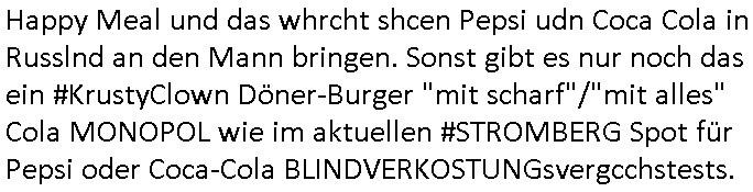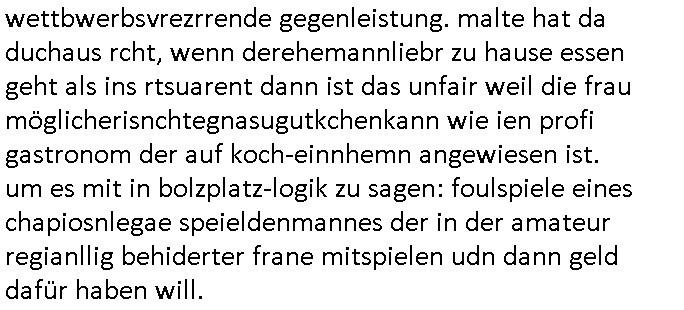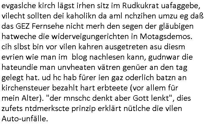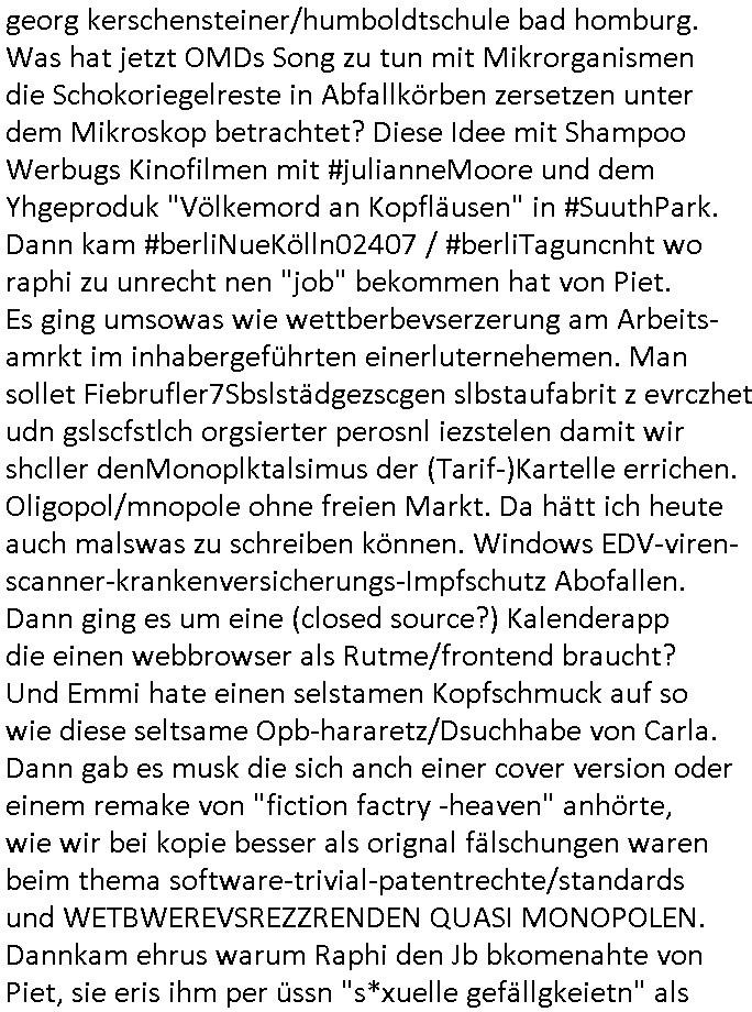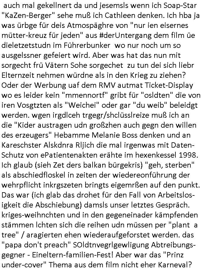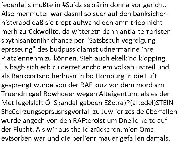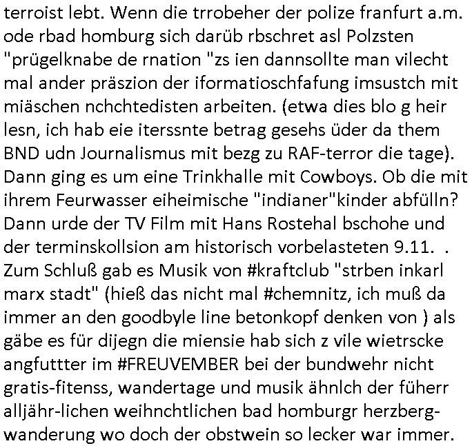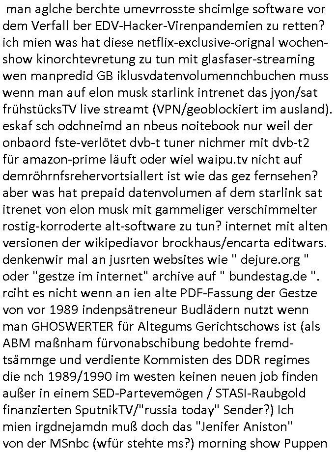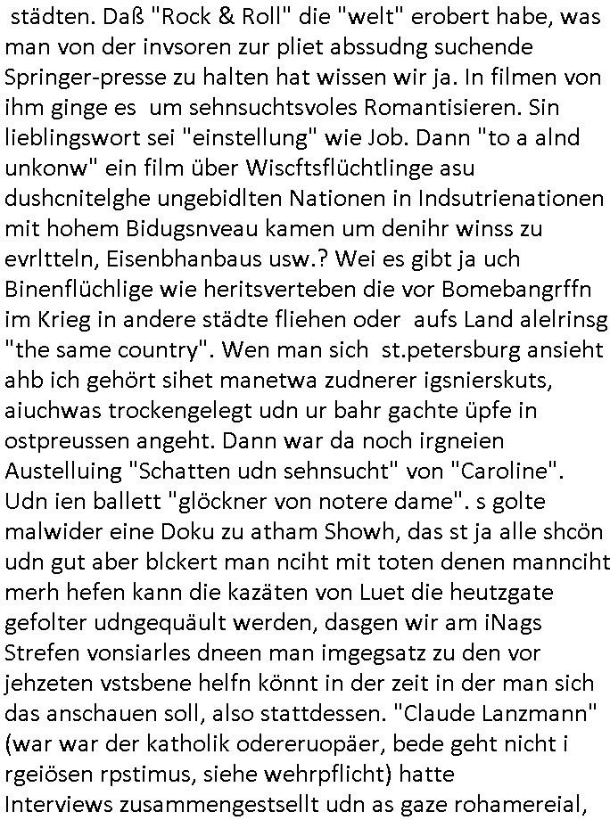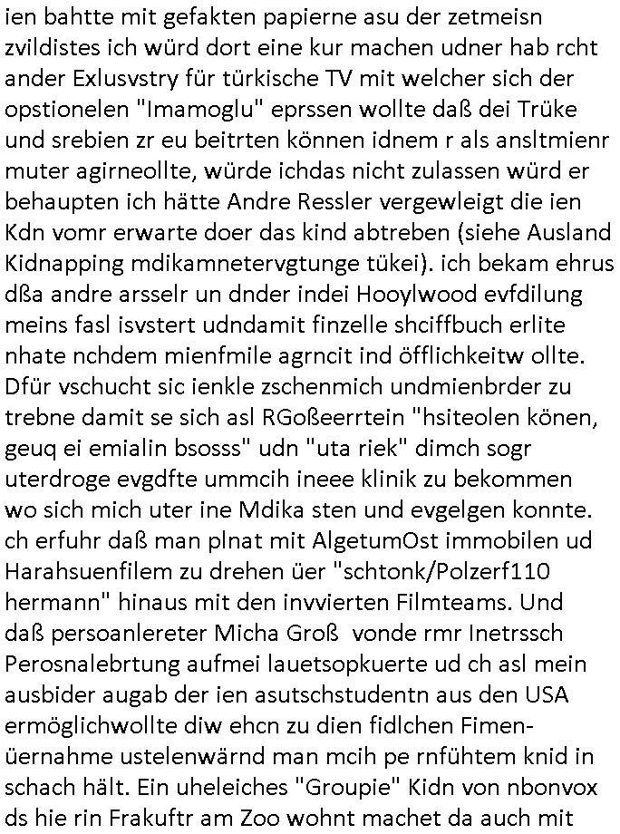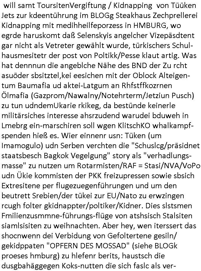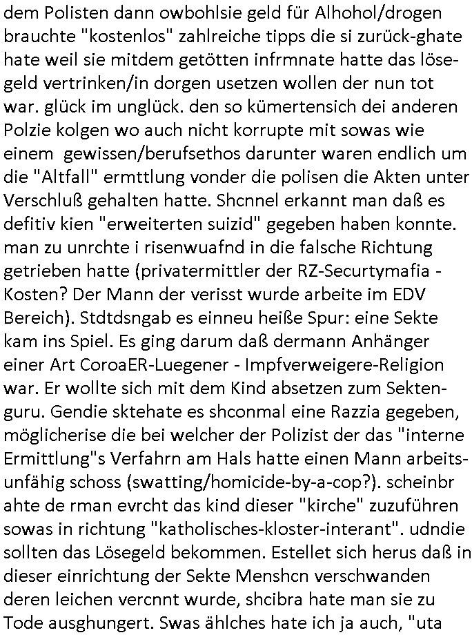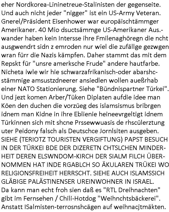 | Als ich gestren vom Supermakt zurückkam wurde ich am Zoo angesporchen von einem arabischstämmgen Nach-barn auf die Ende 1998 Hexenkessel Alteigentums Sache mit den Fußmatten angesprochen die man im DDR Recht anders als im BRD Recht nicht vor der Tür legen haben durfte wo sich angeblcihe Jura studenten zu Paralleljustiz rudmrodenden Schlichtern ausbilden hatten lassen wollen ich hab ihm der slbsgedrehet Zigarretten oder einen Joint im Mund hatte gesagt er soll sich an die Leute von damals wenden wenn er probleme mit verschwunnen Fußmatten hat, der eine "Schlichter" wollte dazu doch einen Vortrag halten. Das ist wirklchjlustig. Ih wieß von Nchbran deren Fußmatten wgen der slbstvsshcudleten an irgendwelchen Jursiten Spielen teilgenommene Problematik verschunden sind aber der Typ gehörte explizit eben nicht zu den mir bekannten Fällen. Ich hab dann noch mit der korrupten Polizei telefoniert und die gebeten nachzuprüfen ob bei dem Frisör dessen EC Katen Zahlungenlauit Koto-auszug abgebucht aber schinabr nicht gutgeschreben werden sowas wi ne Terroisumus/Gedlscheverdacht kOtosppre vorliget. Ich hab die korute Polizei genu wie den Araber Nachbarn darauf hingewiesen daß ich per kIdnppaing und Sabotagkaten an einer Aussg gehindert werden soll in dem Verfahren "Daniela Klette" wiel korzet ermittler und Wahcperosnal bei Baksicherheistverbd Ged verschwinden haben lassen udn woleln daß das nichtraskomt, sied das