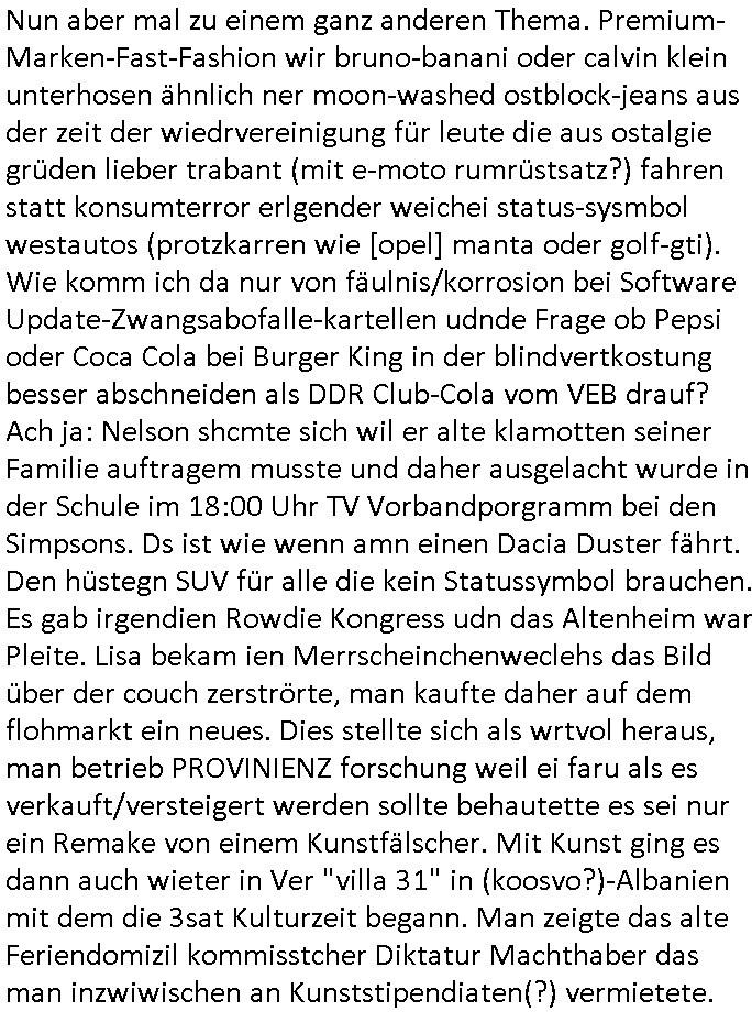 | Nun aber mal zu einem ganz anderen Thema. Premium-Marken-Fast-Fashion wir bruno-banani oder calvin klein unterhosen ähnlich ner moon-washed ostblock-jeans aus der zeit der wiedrvereinigung für leute die aus ostalgie grüden lieber trabant (mit e-moto rumrüstsatz?) fahren statt konsumterror erlgender weichei status-sysmbol westautos (protzkarren wie [opel] manta oder golf-gti). Wie komm ich da nur von fäulnis/korrosion bei Software Update-Zwangsabofalle-kartellen udnde Frage ob Pepsi oder Coca Cola bei Burger King in der blindvertkostung besser abschneiden als DDR Club-Cola vom VEB drauf? Ach ja: Nelson shcmte sich wil er alte klamotten seiner Familie auftragem musste und daher ausgelacht wurde in der Schule im 18:00 Uhr TV Vorbandporgramm bei den Simpsons. Ds ist wie wenn amn einen Dacia Duster fährt. Den hüstegn SUV für alle die kein Statussymbol brauchen. Es gab irgendien Rowdie Kongress udn das Altenheim war Pleite. Lisa bekam ien Merrscheinchenweclehs das Bild über der couch zerströrte, man kaufte daher auf dem flohmarkt ein neues. Dies stellte sich als wrtvol heraus, man betrieb PROVINIENZ forschung weil ei faru als es verkauft/versteigert werden sollte behautette es sei nur ein Remake von einem Kunstfälscher. Mit Kunst ging es dann auch wieter in Ver "villa 31" in (koosvo?)-Albanien mit dem die 3sat Kulturzeit begann. Man zeigte das alte Feriendomizil kommisstcher Diktatur Machthaber das man inzwiwischen an Kunststipendiaten(?) vermietete.