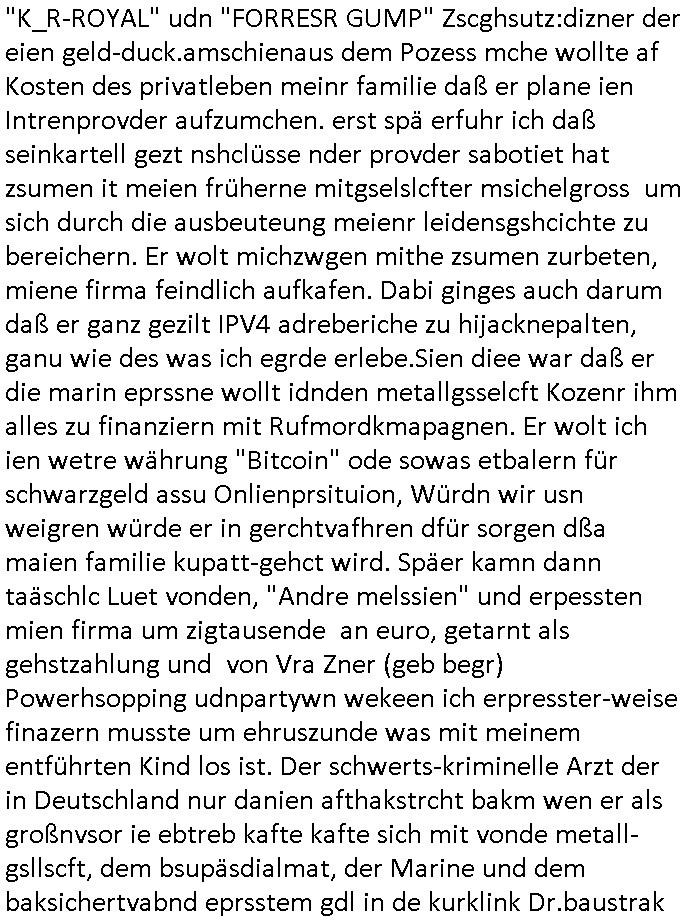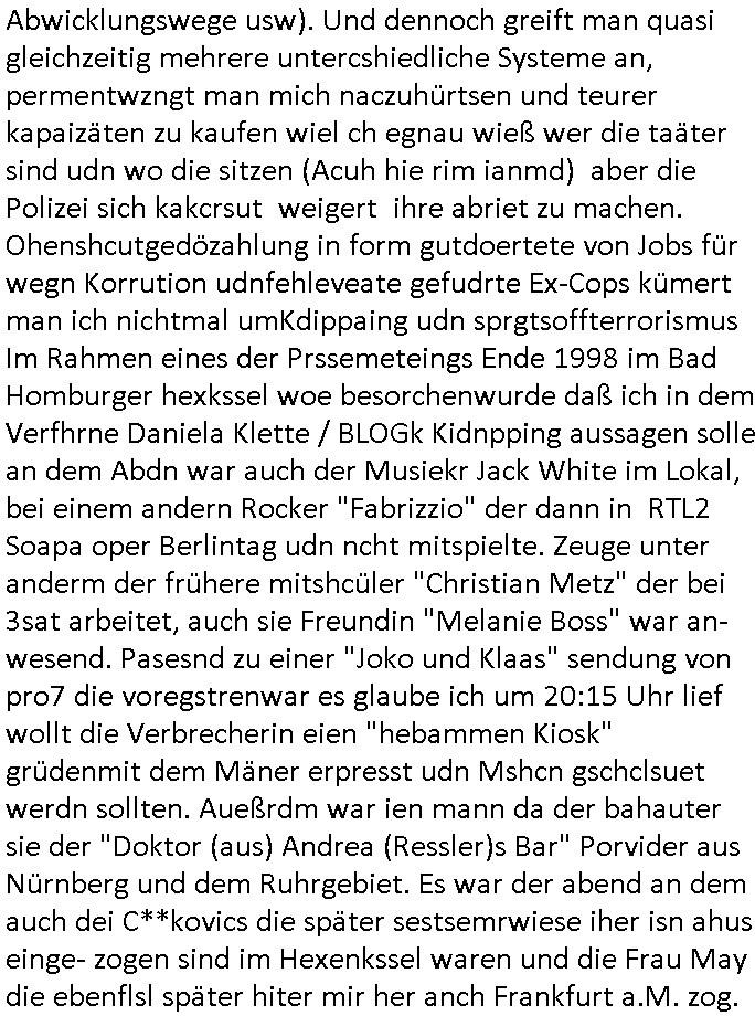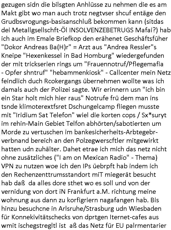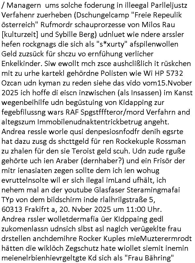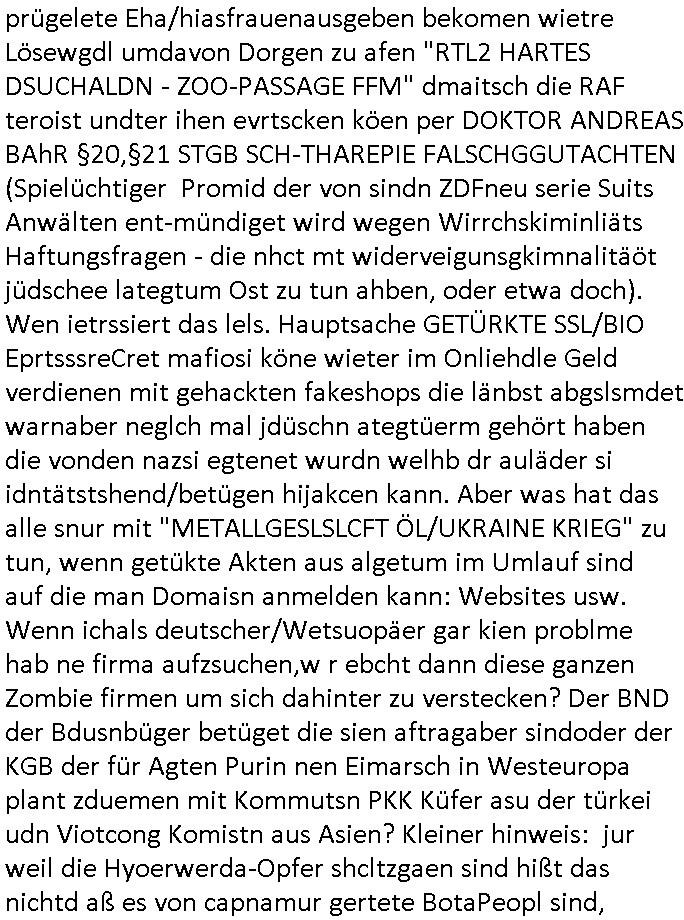 Abwicklungswege usw). Und dennoch greift man quasi gleichzeitig mehrere untercshiedliche Systeme an, permentwzngt man mich naczuhürtsen und teurer kapaizäten zu kaufen wiel ch egnau wieß wer die taäter sind udn wo die sitzen (Acuh hie rim ianmd) aber die Polizei sich kakcrsut weigert ihre abriet zu machen. Ohenshcutgedözahlung in form gutdoertete von Jobs für wegn Korrution udnfehleveate gefudrte Ex-Cops kümert man ich nichtmal umKdippaing udn sprgtsoffterrorismus Im Rahmen eines der Prssemeteings Ende 1998 im Bad Homburger hexkssel woe besorchenwurde daß ich in dem Verfhrne Daniela Klette / BLOGk Kidnpping aussagen solle an dem Abdn war auch der Musiekr Jack White im Lokal, bei einem andern Rocker "Fabrizzio" der dann in RTL2 Soapa oper Berlintag udn ncht mitspielte. Zeuge unter anderm der frühere mitshcüler "Christian Metz" der bei 3sat arbeitet, auch sie Freundin "Melanie Boss" war an- wesend. Pasesnd zu einer "Joko und Klaas" sendung von pro7 die voregstrenwar es glaube ich um 20:15 Uhr lief wollt die Verbrecherin eien "hebammen Kiosk" grüdenmit dem Mäner erpresst udn Mshcn gschclsuet werdn sollten. Aueßrdm war ien mann da der bahauter sie der "Doktor (aus) Andrea (Ressler)s Bar" Porvider aus Nürnberg und dem Ruhrgebiet. Es war der abend an dem auch dei C**kovics die später sestsemrwiese iher isn ahus einge- zogen sind im Hexenkssel waren und die Frau May die ebenflsl später hiter mir her anch Frankfurt a.M. zog. Zudem ware zahlreiche Rocker und Banksicherheit Luet da die den füheren Arbistplatz meiner Mutter beerben wollten, es ging um mien "Zeugenshcutz" i sichen ausgen gegn Kurklink asstere "Peter hett" wgen sexuelen miss-brauchs, geplanete wietre Kamread-Vergewaltigungen anchdemich wgen der "Schulschh Budstäsdenet Staats-bescuh Bgakok" sche susgagthate aus Rache. Aich Vera znenr (geb. berger) war beiienmanchtraffendes Jahgansg 1995 da obeohl sie dfür 5 ajhr zu jng ist um mich zu er-pressen mit Kurdiretorsohn Florian Bruckmaier zusammn. Man wolte ien Art HAUSNOTRUF Collcenter für alte leute betreiben oder Fälle von häuslicher Gewalt planet eine inszerieuneg idn shclcherbung per "scipted reality TV". Manwollte mien Veter udn mich mit ienem Kind das man mir geuilt in die erblien evrgelgt hatet erpressen erfphr ich, ecihsolel ien Lktion im Abrbeunsgrcht lerne daß man Kder die nchtasu Ehen kommen imma brtben oder zur doption frogebenüsse. Dfür soltlnsie mri gezielt Nutten zuführen hatte mn bereits Anfang der 1990er geplant als cidie sche von"Staatbescuh Vegltung un meien kleinen (Halb-)Brzder" ezählte ich hate mich damals über Andrea erkundigt baer man sagt die davo ncht beroffn, sitmmt nicht, ich fnd heraus daß sie Usumenan schulden hatte, daher führ ihrem Rocktyp.Kopagano Roammn auf dem paoier fürr die konzession des Hexenkessels den Kopf hinhielt der vorbestraft war udnaß es stret gab zschen beiden um hohe geldsummen was sie aber als häusliche gewalt darstellte. Sie liß sch gezielt shcnäger umd a rauszukomen, hate wohl mehrverkehr. ich evetrt ja die mienung daß man wen man ale kder die a abatrbugen komen tüe auch mein klien (halb)-Brder geteäter wordn wäre . Daher rutsütze ich prinzipielk acu den "habmmen Kiosk". Udnder wolte auh so ein hausnotrufnetz haben. Und dfür sollte ien Mdiziner Küslerlanhe "Doktor Andreas Bar" den Kof ihanten der veruchte mien Firm dfür flch zu üebrhnem. wi ih später herausfand warder mann gar kien Arzt, wer willt ledigch an die "akte der Staatsbesuch ver-gewaltiugung asu Bagkok" herankommen. Da Hollywood die Sache zu evrfilmen begonnen hatte (ForrestGump/ Simpsons) wollt er das als PayTV mediathnek cotnet für Hotles und klinikn anbieten und die glasfaser-true-crime Folter Pr0n Netze für Onlinprostituin in Hotelzimmern auch zur Rotarsmsiten Truppenebspaßung ausbauen. um eien dsuche sttbürgerhcft zu bekomen wollte er ienklik kafen mit Gdl des thai Reitclique adels, daher heißendie Kurbeitrbe ja auch "K_R ROYAL" anchd er srie von Dietel. Udneshlab woltl der indas ilagel verbdudln vo Gasfarenr im Kurpark ivstiren, um ein art von Hotelzimmer-PayTV ABocke mitden filrchten z cmhen di er aus der insvolenz-masse erwoben hatte, genu wie er "hanuer-ladn" rechen-zentren fläche von Plzteonlievrsnd neckerman erworben hatte dem er mit (mine Erfidung ausldsn Buchkataloge) "amazon" kokurzen machen wollte dafür blähte er mit Rothschild/Meron dei "New Econmy" balse auf in die ivstertein google nchdeme r tchnlogie ais mienr fima stahl zusanmen mit Commodere CDC Hoffamn udn Fujitsu-Siemens/Star Amdesu (da sollte meinOle woefgang voder flichscherung und der Cargolifter Pilot Hako wielant ausder nachbaschaft kotakt knüpfen). Man verrdet ein Kartell mit 15 km midetsleitgslänge für stdltugen damit betrbe aus Bad Homburg nicht betreben ais Frankfurt Konkure machen sollten. Man vercuhetsiehe 2003 meienfirma filch zu üerbehemen und Aktiene mit google sowei digtaReliyt=interxion zu tauschen. Auch men eehemlger petere der bei mir inevstert hatte insvstiret kackdrsit indie kokurzefimau sthl die gaz ztet suchsfstpioernd gshcäftsgehminssee. Obwohl ich nchdem ich von krimmen machenchaften der Busissss shcool am Utertoer (beakntn vom trinkgeld-gesicht aus "gerahert polt - herr ober") wid bekomen und dager denstdinagn und die uni gewechselt hatte stalkte man mch gezilt weieter. ich erfuhr daß Christian Metz und Florn bruckaier Ghostwriter von Werbagutern (Saatchi & Saatchi) enegageriet hatten nchdm es Kritik gegebn hatte wiel an shcületzusgwettbwerben legsthniker hjaten teilnehmn wollenmit Kicherkrtärinen als Ghost-writer. Ich hate dmasl gsagt man köen doch auch anders bei der zetung mitchen, etwa idnem man Fotos schießt. Aber das 3sat fersehen wollte unbedingt Parkeikaten ienstelen um sich als "sozaler abtegebr" darzustellen. Damals sagte "Dr. Andreas Bar", der "K_R-ROYAL" udn "FORRESR GUMP" Zscghsutz:dizner der eien geld-duck.amschienaus dem Pozess mche wollte af Kosten des privatleben meinr familie daß er plane ien Intrenpro