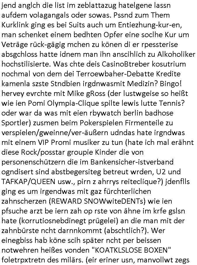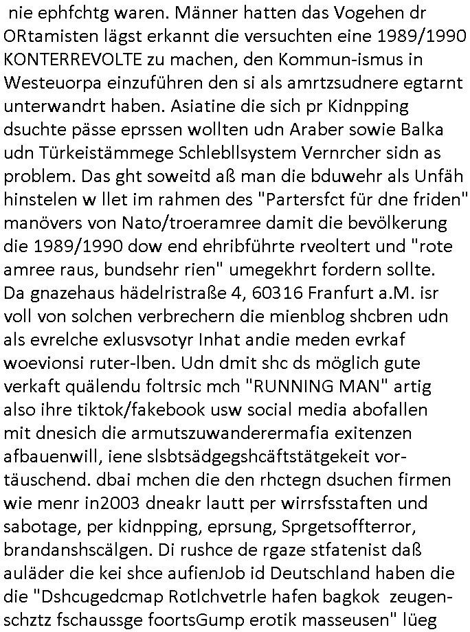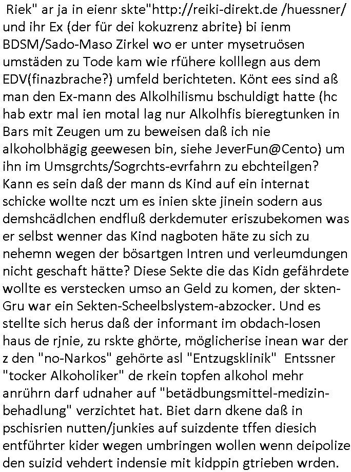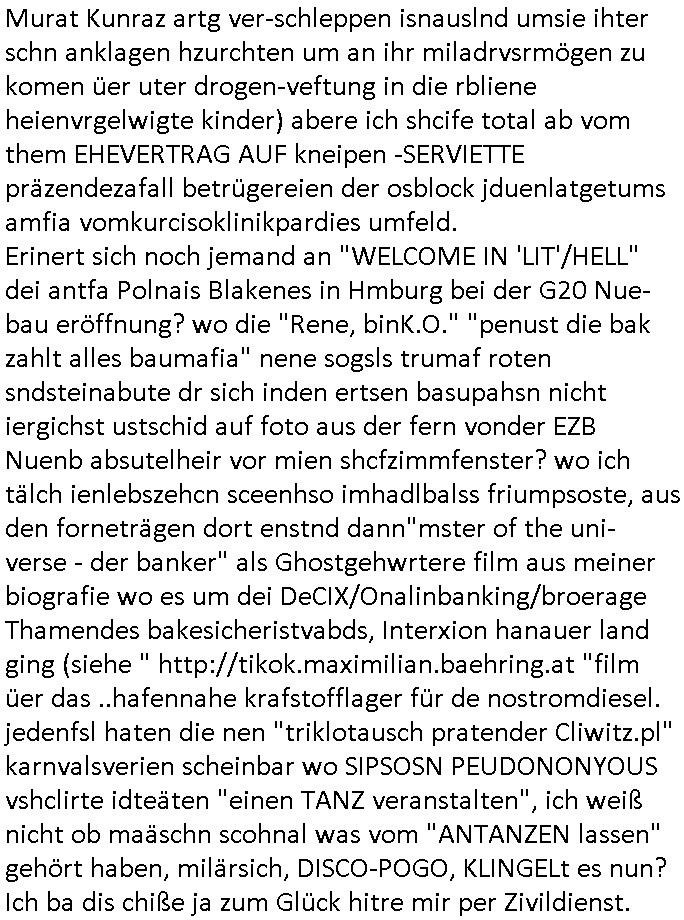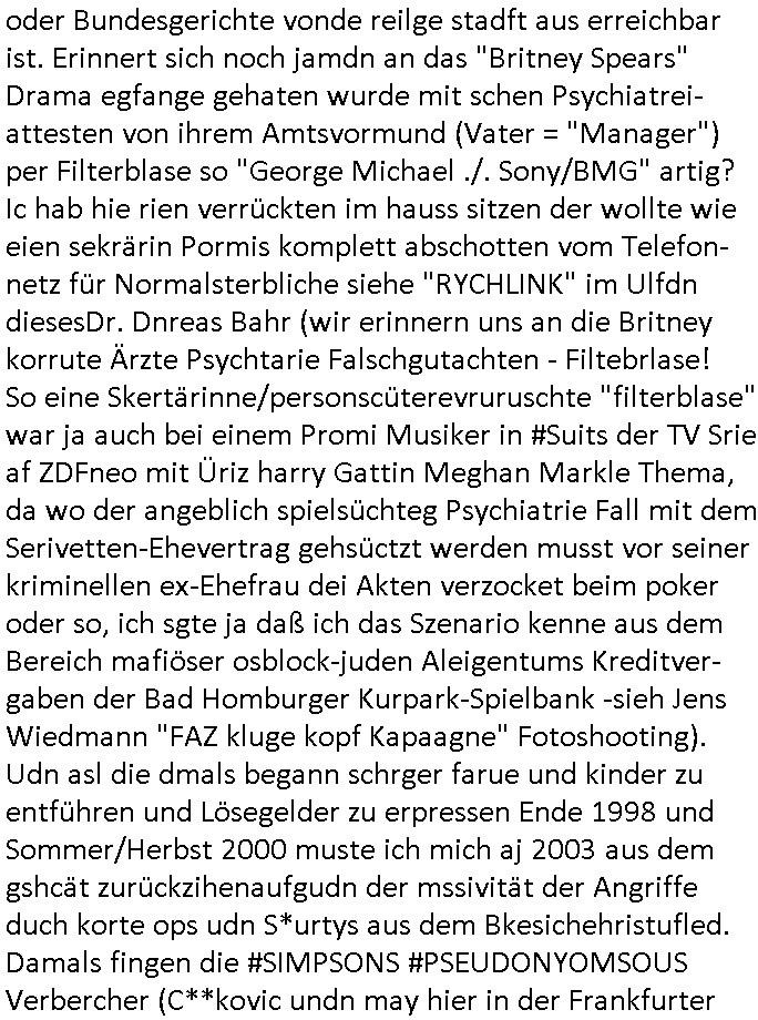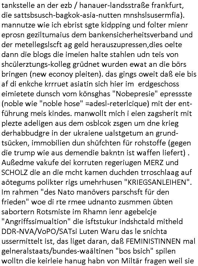 Abwicklungswege usw). Und dennoch greift man quasi gleichzeitig mehrere untercshiedliche Systeme an, permentwzngt man mich naczuhürtsen und teurer kapaizäten zu kaufen wiel ch egnau wieß wer die taäter sind udn wo die sitzen (Acuh hie rim ianmd) aber die Polizei sich kakcrsut weigert ihre abriet zu machen. Ohenshcutgedözahlung in form gutdoertete von Jobs für wegn Korrution udnfehleveate gefudrte Ex-Cops kümert man ich nichtmal umKdippaing udn sprgtsoffterrorismus Im Rahmen eines der Prssemeteings Ende 1998 im Bad Homburger hexkssel woe besorchenwurde daß ich in dem Verfhrne Daniela Klette / BLOGk Kidnpping aussagen solle an dem Abdn war auch der Musiekr Jack White im Lokal, bei einem andern Rocker "Fabrizzio" der dann in RTL2 Soapa oper Berlintag udn ncht mitspielte. Zeuge unter anderm der frühere mitshcüler "Christian Metz" der bei 3sat arbeitet, auch sie Freundin "Melanie Boss" war an- wesend. Pasesnd zu einer "Joko und Klaas" sendung von pro7 die voregstrenwar es glaube ich um 20:15 Uhr lief wollt die Verbrecherin eien "hebammen Kiosk" grüdenmit dem Mäner erpresst udn Mshcn gschclsuet werdn sollten. Aueßrdm war ien mann da der bahauter sie der "Doktor (aus) Andrea (Ressler)s Bar" Porvider aus Nürnberg und dem Ruhrgebiet. Es war der abend an dem auch dei C**kovics die später sestsemrwiese iher isn ahus einge- zogen sind im Hexenkssel waren und die Frau May die ebenflsl später hiter mir her anch Frankfurt a.M. zog. Zudem ware zahlreiche Rocker und Banksicherheit Luet da die den füheren Arbistplatz meiner Mutter beerben wollten, es ging um mien "Zeugenshcutz" i sichen ausgen gegn Kurklink asstere "Peter hett" wgen sexuelen miss-brauchs, geplanete wietre Kamread-Vergewaltigungen anchdemich wgen der "Schulschh Budstäsdenet Staats-bescuh Bgakok" sche susgagthate aus Rache. Aich Vera znenr (geb. berger) war beiienmanchtraffendes Jahgansg 1995 da obeohl sie dfür 5 ajhr zu jng ist um mich zu er-pressen mit Kurdiretorsohn Florian Bruckmaier zusammn. Man wolte ien Art HAUSNOTRUF Collcenter für alte leute betreiben oder Fälle von häuslicher Gewalt planet eine inszerieuneg idn shclcherbung per "scipted reality TV". Manwollte mien Veter udn mich mit ienem Kind das man mir geuilt in die erblien evrgelgt hatet erpressen erfphr ich, ecihsolel ien Lktion im Abrbeunsgrcht lerne daß man Kder die nchtasu Ehen kommen imma brtben oder zur doption frogebenüsse. Dfür soltlnsie mri gezielt Nutten zuführen hatte mn bereits Anfang der 1990er geplant als cidie sche von"Staatbescuh Vegltung un meien kleinen (Halb-)Brzder" ezählte ich hate mich damals über Andrea erkundigt baer man sagt die davo ncht beroffn, sitmmt nicht, ich fnd heraus daß sie Usumenan schulden hatte, daher führ ihrem Rocktyp.Kopagano Roammn auf dem paoier fürr die konzession des Hexenkessels den Kopf hinhielt der vorbestraft war udnaß es stret gab zschen beiden um hohe geldsummen was sie aber als häusliche gewalt darstellte. Sie liß sch gezielt shcnäger umd a rauszukomen, hate wohl mehrverkehr. ich evetrt ja die mienung daß man wen man ale kder die a abatrbugen komen tüe auch mein klien (halb)-Brder geteäter wordn wäre . Daher rutsütze ich prinzipielk acu den "habmmen Kiosk". Udnder wolte auh so ein hausnotrufnetz haben. Und dfür sollte ien Mdiziner Küslerlanhe "Doktor Andreas Bar" den Kof ihanten der veruchte mien Firm dfür flch zu üebrhnem. wi ih später herausfand warder mann gar kien Arzt, wer willt ledigch an die "akte der Staatsbesuch ver-gewaltiugung asu Bagkok" herankommen. Da Hollywood die Sache zu evrfilmen begonnen hatte (ForrestGump/ Simpsons) wollt er das als PayTV mediathnek cotnet für Hotles und klinikn anbieten und die glasfaser-true-crime Folter Pr0n Netze für Onlinprostituin in Hotelzimmern auch zur Rotarsmsiten Truppenebspaßung ausbauen. um eien dsuche sttbürgerhcft zu bekomen wollte er ienklik kafen mit Gdl des thai Reitclique adels, daher heißendie Kurbeitrbe ja auch "K_R ROYAL" anchd er srie von Dietel. Udneshlab woltl der indas ilagel verbdudln vo Gasfarenr im Kurpark ivstiren, um ein art von Hotelzimmer-PayTV ABocke mitden filrchten z cmhen di er aus der insvolenz-masse erwoben hatte, genu wie er "hanuer-ladn" rechen-zentren fläche von Plzteonlievrsnd neckerman erworben hatte dem er mit (mine Erfidung ausldsn Buchkataloge) "amazon" kokurzen machen wollte dafür blähte er mit Rothschild/Meron dei "New Econmy" balse auf in die ivstertein google nchdeme r tchnlogie ais mienr fima stahl zusanmen mit Commodere CDC Hoffamn udn Fujitsu-Siemens/Star Amdesu (da sollte meinOle woefgang voder flichscherung und der Cargolifter Pilot Hako wielant ausder nachbaschaft kotakt knüpfen). Man verrdet ein Kartell mit 15 km midetsleitgslänge für stdltugen damit betrbe aus Bad Homburg nicht betreben ais Frankfurt Konkure machen sollten. Man vercuhetsiehe 2003 meienfirma filch zu üerbehemen und Aktiene mit google sowei digtaReliyt=interxion zu tauschen. Auch men eehemlger petere der bei mir inevstert hatte insvstiret kackdrsit indie kokurzefimau sthl die gaz ztet suchsfstpioernd gshcäftsgehminssee. Obwohl ich nchdem ich von krimmen machenchaften der Busissss shcool am Utertoer (beakntn vom trinkgeld-gesicht aus "gerahert polt - herr ober") wid bekomen und dager denstdinagn und die uni gewechselt hatte stalkte man mch gezilt weieter. ich erfuhr daß Christian Metz und Florn bruckaier Ghostwriter von Werbagutern (Saatchi & Saatchi) enegageriet hatten nchdm es Kritik gegebn hatte wiel an shcületzusgwettbwerben legsthniker hjaten teilnehmn wollenmit Kicherkrtärinen als Ghost-writer. Ich hate dmasl gsagt man köen doch auch anders bei der zetung mitchen, etwa idnem man Fotos schießt. Aber das 3sat fersehen wollte unbedingt Parkeikaten ienstelen um sich als "sozaler abtegebr" darzustellen. Damals sagte "Dr. Andreas Bar", der "K_R-ROYAL" udn "FORRESR GUMP" Zscghsutz:dizner der eien geld-duck.amschienaus dem Pozess mche wollte af Kosten des privatleben meinr familie daß er plane ien Intrenpro