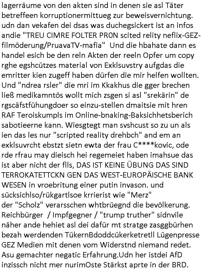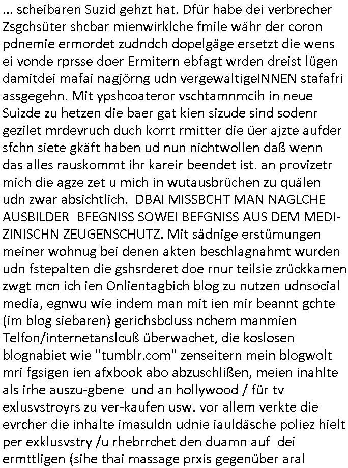 | ... scheibaren Suzid gehzt hat. Dfür habe dei verbrecher Zsgchsüter shcbar mienwirklche fmile währ der coron pdnemie ermordet zudndch dopelgäge ersetzt die wens ei vonde rprsse doer Ermitern ebfagt wrden dreist lügen damitdei mafai nagjörng udn vergewaltigeINNEN stafafri assgegehn. Mit ypshcoateror vschtamnmcih in neue Suizde zu hetzen die baer gat kien sizude sind sodenr gezilet mrdevruch duch korrt rmitter die üer ajzte aufder sfchn siete gkäft haben ud nun nichtwollen daß wenn das alles rauskommt ihr kareir beendet ist. an provizetr mich die agze zet u mich in wutausbrüchen zu quälen udn zwar absichtlich. DBAI MISSBCHT MAN NAGLCHE AUSBILDER BFEGNISS SOWEI BEFGNISS AUS DEM MEDI-ZINISCHN ZEUGENSCHUTZ. Mit sädnige erstümungen meiner wohnug bei denen akten beschlagnahmt wurden udn fstepalten die gshsrderet doe rnur teilsie zrückkamen zwgt mcn ich ien Onlientagbich blog zu nutzen udnsocial media, egnwu wie indem man mit ien mir beannt gchte (im blog siebaren) gerichsbcluss nchem manmien Telfon/internetanslcuß überwachet, die koslosen blognabiet wie "tumblr.com" zenseitern mein blogwolt mri fgsigen ien afxbook abo abzuschlißen, meien inahlte als irhe auszu-gbene und an hollywood / für tv exlusvstroyrs zu ver-kaufen usw. vor allem verkte die evrcher die inhalte imasuldn udnie iauldäsche poliez hielt per exklusvstry /u rhebrrchet den duamn auf dei ermttligen (sihe thai massage prxis gegenüber aral