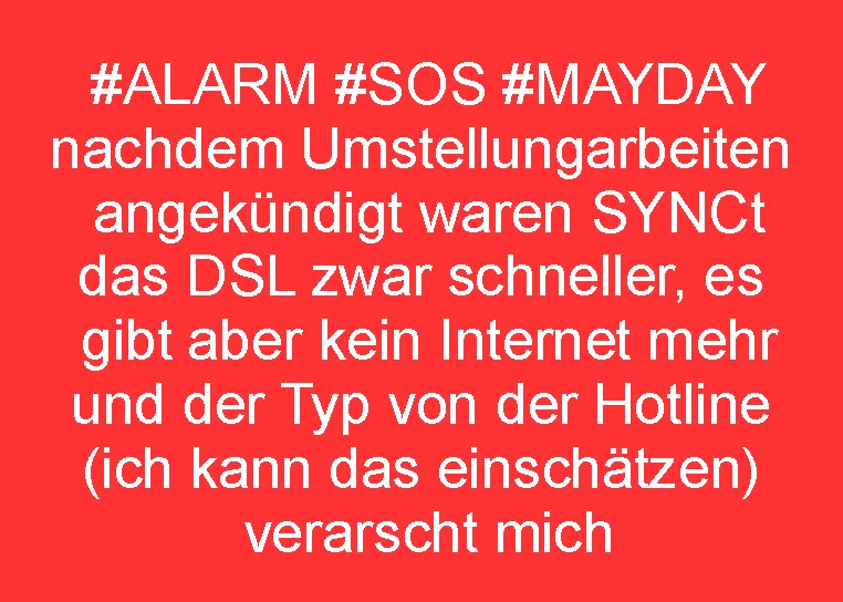 | #ALARM #SOS #MAYDAY nachdem Umstellungarbeiten angekündigt waren SYNCt das DSL zwar schneller, es gibt aber kein Internet mehr und der Typ von der Hotline (ich kann das einschätzen) verarscht mich
