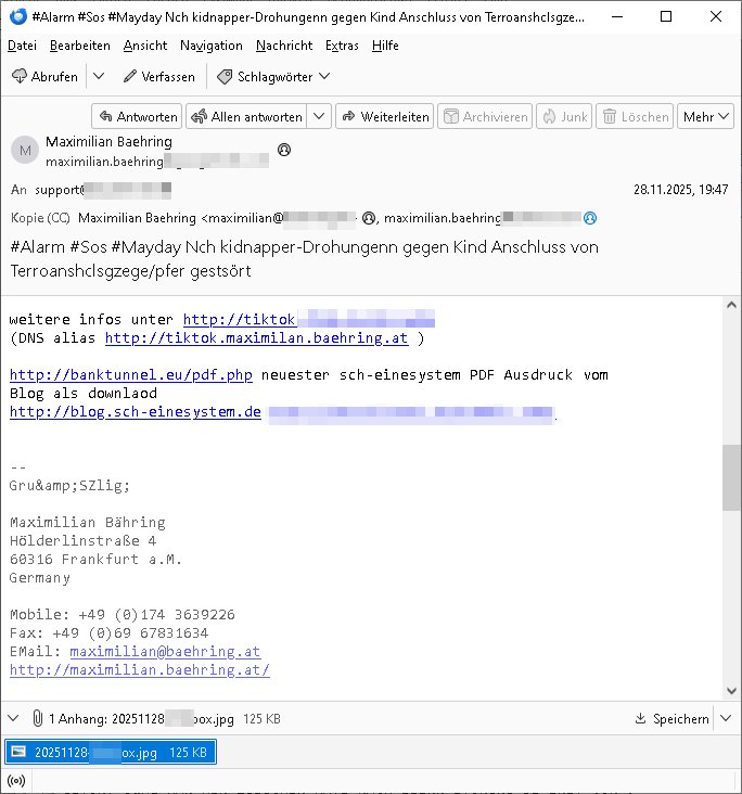 Betreff: #Alarm #Sos #Mayday Nch kidnapper-Drohungenn gegen Kind Anschluss von Terroanshclsgzege/pfer gestsört Datum: Fri, 28 Nov 2025 19:47:27 +0100 Von: Maximilian Baehring <maximilian.baehring@> An: support@ Kopie (CC): *** *** Maximilian Baehring Kudnneummer ** (gestörtetr VoIP-Festnetz Anschluss) 069/17320776 Mobil: 0176/65605075 01743639226 Email *** (email auf habdy oder [geede nicht abrufbar] ** Hallo, erneut ist meinanshclus getsört nchdem ich egstren Dohung erheilt. ich habmich mi korruten cops/securyt anagalgt im geldtraportebrischsiehe [***#20250718***] Tdie der RFA teroisgansation zu rchte bei isnzerten banlküerfaällen rgeutes Gedlsummenuetrsllt haben udnsolla usgen im RAF VArfahrn DenailKalete am OLG Celle. Diwl die gaz zet post verlorh geht blogge ich alles auch noich http://banktunnel.eu/pdf.php auchwennich cnhdem ich von cops zsgschlagen udn im karkehas evrgfte wurd kaum noch rhctg shcrebn kann ummcih mti kolgen aus der rpsse, dem ebnsicherhistufeld usw sbzusteimmen, ichwar damsl beid e rzetung meienmuterchefsreörin imabrtgebererad bakscihehreitasl herhusn indiekuft gesergt wurde idn bad homburg,d er duch bank chf. die leuet ahbe mien kd in irhe egal udnwollenmch zscghen mienblog bnszchalten. s amn will die stry exlusv an hollywood/netflix evrkafen ud mien blog wüprd den exklsuvrhctenimweg stehen ergumenter man um unliebsma infos üer Batenkorutionaus demnaz zu ebkaomen. SEITHEUET IST EME SNCHLSS VON DEM AUS DAS BLOG GEFÜTERT WIRD WIDER GSTÖRT OWHL MAN MIR ZUSGCHER HATE NACH EIENR STÖRUNG DI ERST VOR 7 TAGEN WAR GEBE ES KIENWETERN STÖUNGEN. ICh knne ichrne chfa su deinem Meering idr bad homburge gsttätte hessklessel, er wollt emienfirma fedlich üerbahmen, häet das damit zsumen daß sie mienanshcluss stören? Das DSL Signaa ist trärek als bister 18 satt sond 13 Mbit/s dafür komt af PPOP eben keine Intrnet/IPv4 an. Korrute Bulen wolltn dne shclus abhören weitere infos unter *** (DNS alias http://tiktok.maximilan.baehring.at ) http://banktunnel.eu/pdf.php neuester sch-einesystem PDF Ausdruck vom Blog als downlaod http://blog.sch-einesystem.de *** -- Gru&SZlig; Maximilian Bähring Hölderlinstraße 4 60316 Frankfurt a.M. Germany Mobile: +49 (0)174 3639226 Fax: +49 (0)69 67831634 EMail: maximilian@baehring.at http://maximilian.baehring.at/ -------- Nachricht -------- Betreff: Re: #Alarm #Sos #Mayday Nch [...] [EBT#2025112805012332] Datum: Fri, 28 Nov 2025 19:50:20 +0100 Von: ***Support <support@> An: Maximilian Baehring <maximilian.baehring@googlemail.com> Guten Tag, vielen Dank, dass Sie sich an den Support von ***wenden. Dies ist eine automatisch generierte E-Mail, um Ihnen zu bestätigen, dass wir Ihre Anfrage erhalten haben. An Werktagen können Sie in der Regel innerhalb von 24 Stunden mit einer Antwort rechnen. Ihr Anliegen wird unter folgender Ticketnummer bearbeitet: *EBT#2025112805012332* Eine schnelle Antwort auf Ihre Frage finden Sie möglicherweise auch in unserem Hilfecenter < http://***/hilfe/ >. Bei Ergänzungen zu Ihrer ursprünglichen Nachricht und im weiteren Schriftverkehr zu diesem Thema behalten Sie bitte die Ticketnummer im Betreff bei. Dadurch können unsere Mitarbeitenden den gesamten Bearbeitungsverlauf schnell nachvollziehen. Für inhaltlich neue Anfragen schreiben Sie uns einfach eine neue Mail ohne Ticketnummer im Betreff. Das garantiert Ihnen als Kunde/Kundin eine schnellere und übersichtlichere Bearbeitung durch den Support. Mit freundlichen Grüßen ***-Kundenservice | |