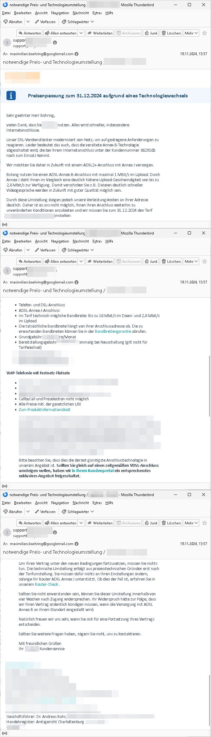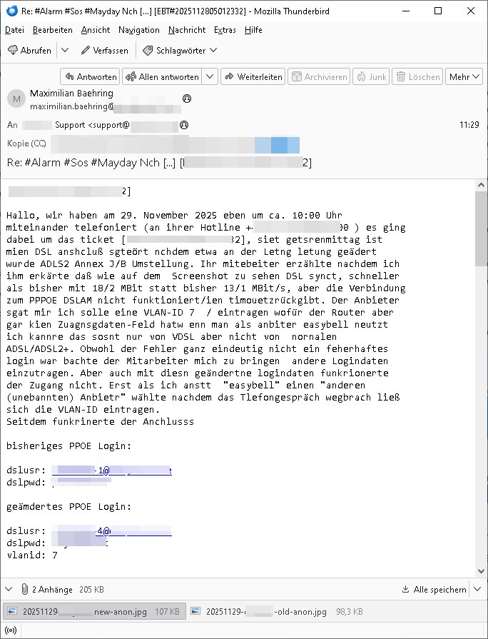 Betreff: Re: #Alarm #Sos #Mayday Nch [...] [***] Datum: Sat, 29 Nov 2025 11:29:52 +0100 Von: Maximilian Baehring <maximilian.baehring@***> An: *** Support <support@***> Kopie (CC): *** [***] Hallo, wir haben am 29. November 2025 eben um ca. 10:00 Uhr miteinander telefoniert (an ihrer Hotline +49/(0)30/80951000 ) es ging dabei um das ticket [***], siet getsrenmittag ist mien DSL anshcluß sgteört nchdem etwa an der Letng letung geädert wurde ADLS2 Annex J/B Umstellung. Ihr mitebeiter erzählte nachdem ich ihm erkärte daß wie auf dem Screenshot zu sehen DSL synct, schneller als bisher mit 18/2 MBit statt bisher 13/1 MBit/s, aber die Verbindung zum PPPOE DSLAM nicht funktioniert/ien timouetzrückgibt. Der Anbieter sgat mir ich solle eine VLAN-ID 7 / eintragen wofür der Router aber gar kien Zuagnsgdaten-Feld hatw enn man als anbiter easybell neutzt ich kannre das sosnt nur von VDSL aber nicht von nornalen ADSL/ADSL2+. Obwohl der Fehler ganz eindeutig nicht ein feherhaftes login war bachte der Mitarbeiter mich zu bringen andere Logindaten einzutragen. Aber auch mit diesn geändertne logindaten funkrionerte der Zugang nicht. Erst als ich anstt "easybell" einen "anderen (unebannten) Anbietr" wählte nachdem das Tlefongespräch wegbrach ließ sich die VLAN-ID eintragen. Seitdem funkrinerte der Anchlusss bisheriges PPOE Login: dslusr: ***-1@*** dslpwd: *** geämdertes PPOE Login: dslusr: ***-4@*** dslpwd: *** vlanid: 7 | |
