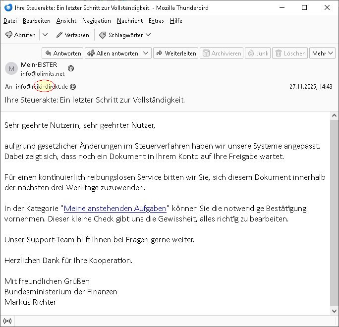 Betreff: Ihre Steuerakte: Ein letzter Schritt zur Vollständigkeit. Datum: 27 Nov 2025 05:43:09 -0800 Von: Mein-EISTER <info@olimits.net> An: info@reiki-direkt.de Sehr geehrte Nutzerin, sehr geehrter Nutzer, aufgrund gesetzlicher Änderungen im Steuerverfahren haben wir unsere Systeme angepasst. Dabei zeigt sich, dass noch ein Dokument in Ihrem Konto auf Ihre Freigabe wartet. Für einen kontinuierlich reibungslosen Service bitten wir Sie, sich diesem Dokument innerhalb der nächsten drei Werktage zuzuwenden. In der Kategorie "Meine anstehenden Aufgaben < *** >" können Sie die notwendige Bestätigung vornehmen. Dieser kleine Check gibt uns die Gewissheit, alles richtig zu bearbeiten. Unser Support-Team hilft Ihnen bei Fragen gerne weiter. Herzlichen Dank für Ihre Kooperation. Mit freundlichen Grüßen Bundesministerium der Finanzen Markus Richter | |
