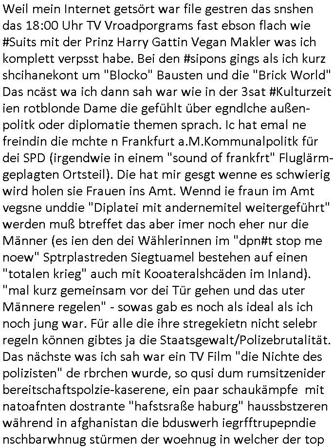 | Weil mein Internet getsört war file gestren das snshen das 18:00 Uhr TV Vroadporgrams fast ebson flach wie #Suits mit der Prinz Harry Gattin Vegan Makler was ich komplett verpsst habe. Bei den #sipons gings als ich kurz shcihanekont um "Blocko" Bausten und die "Brick World" Das ncäst wa ich dann sah war wie in der 3sat #Kulturzeit ien rotblonde Dame die gefühlt über egndlche außen-politk oder diplomatie themen sprach. Ic hat emal ne freindin die mchte n Frankfurt a.M.Kommunalpolitk für dei SPD (irgendwie in einem "sound of frankfrt" Fluglärm-geplagten Ortsteil). Die hat mir gesgt wenne es schwierig wird holen sie Frauen ins Amt. Wennd ie fraun im Amt vegsne unddie "Diplatei mit andernemitel weitergeführt" werden muß btreffet das aber imer noch eher nur die Männer (es ien den dei Wählerinnen im "dpn#t stop me noew" Sptrplastreden Siegtuamel bestehen auf einen "totalen krieg" auch mit Kooateralshcäden im Inland). "mal kurz gemeinsam vor dei Tür gehen und das uter Männere regelen" - sowas gab es noch als ideal als ich noch jung war. Für alle die ihre stregekietn nicht selebr regeln können gibtes ja die Staatsgewalt/Polizebrutalität. Das nächste was ich sah war ein TV Film "die Nichte des polizisten" de rbrchen wurde, so qusi dum rumsitzenider bereitschaftspolzie-kaserene, ein paar schaukämpfe mit natoafnten dostrante "hafstsraße haburg" haussbstzeren während in afghanistan die bduswerh iegrfftrupepndie nschbarwhnug stürmen der woehnug in welcher der top