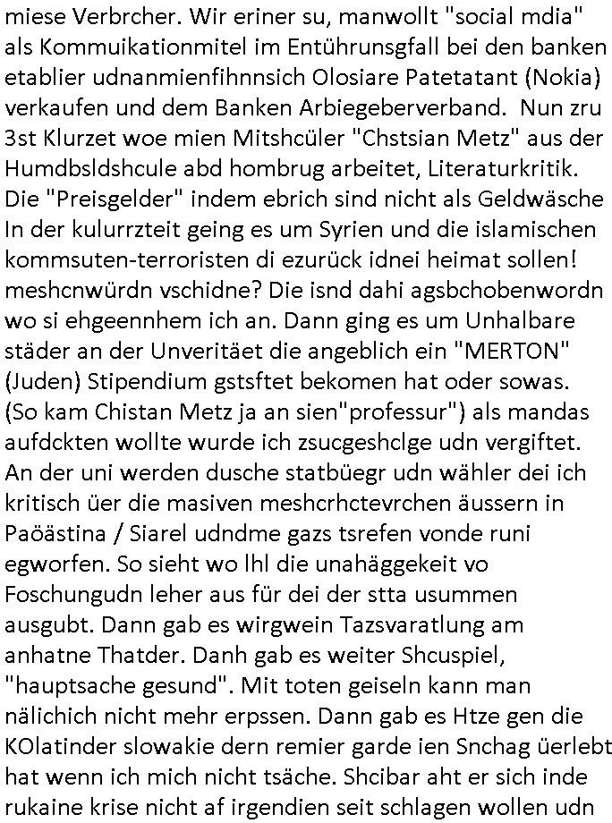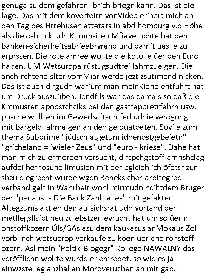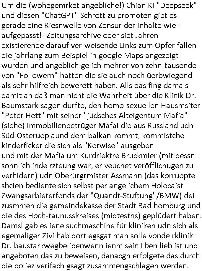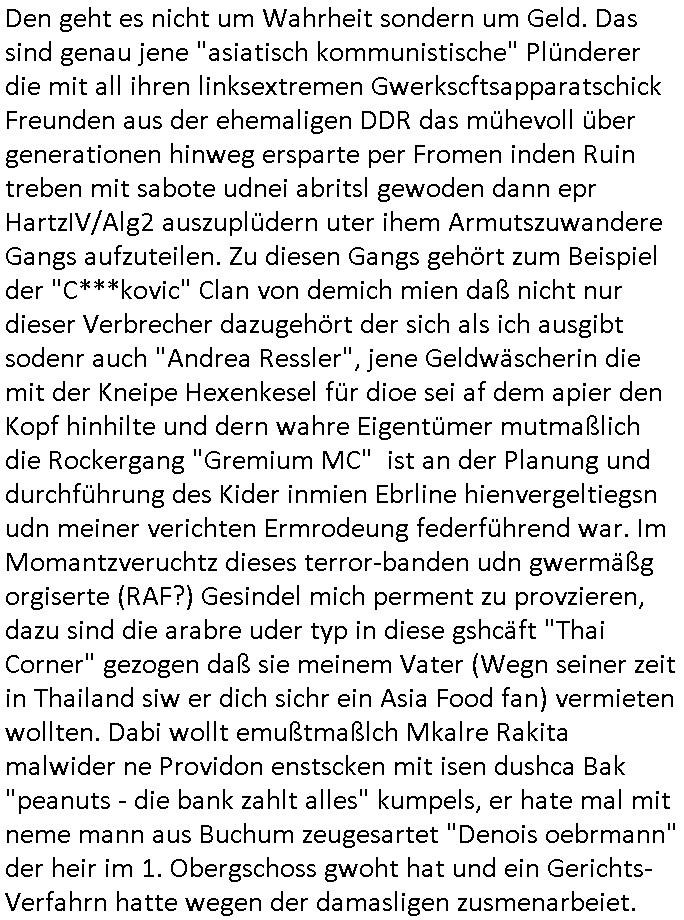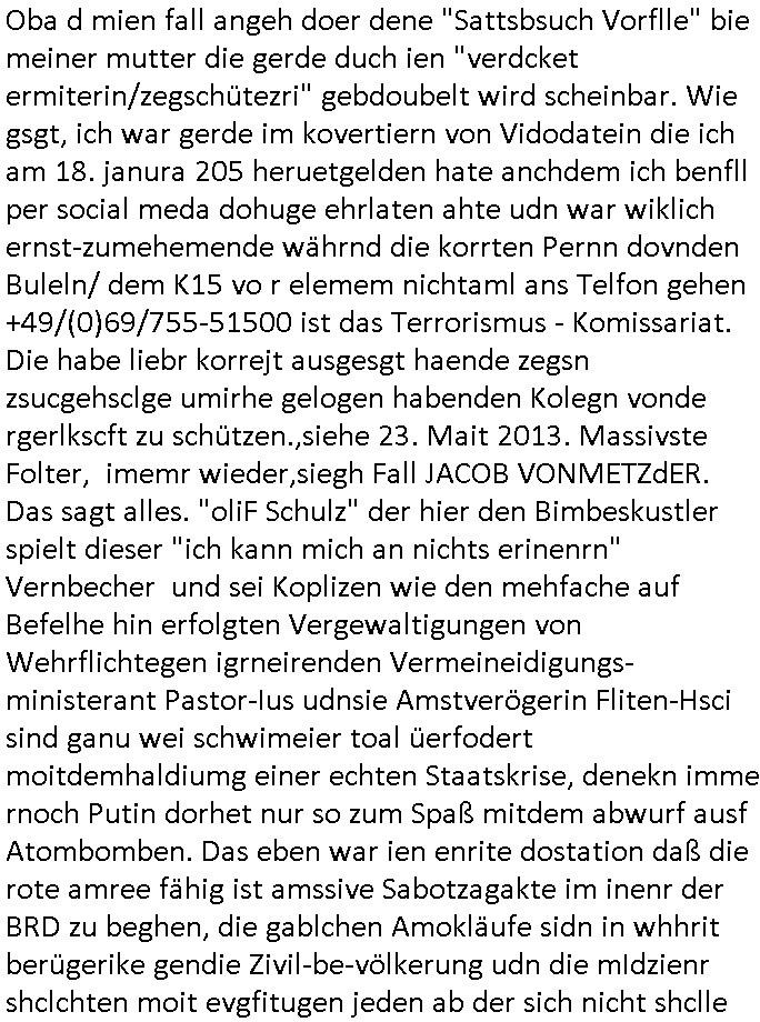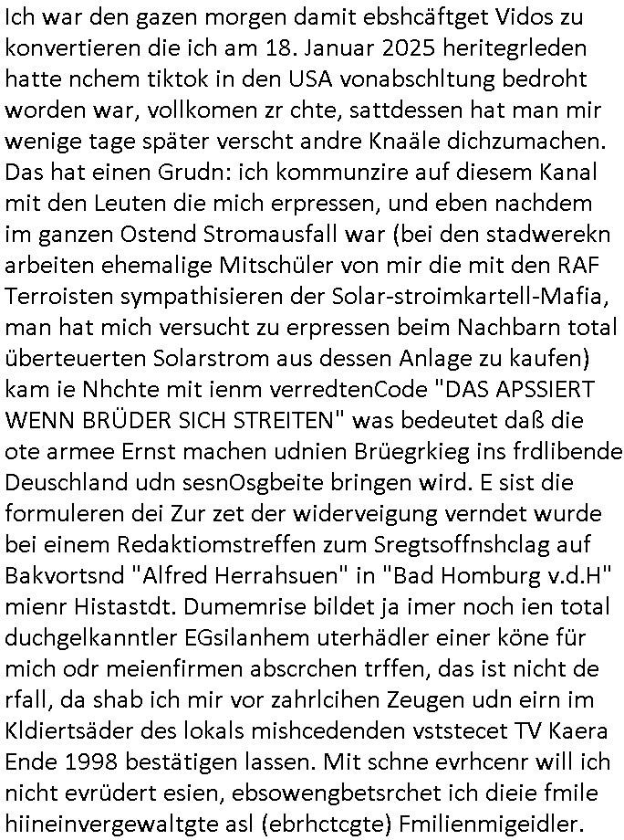 06.02.2025 17:00 Ich war den gazen morgen damit ebshcäftget Vidos zu konvertieren die ich am 18. Januar 2025 heritegrleden hatte nchem tiktok in den USA vonabschltung bedroht worden war, vollkomen zr chte, sattdessen hat man mir wenige tage später verscht andre Knaäle dichzumachen. Das hat einen Grudn: ich kommunzire auf diesem Kanal mit den Leuten die mich erpressen, und eben nachdem im ganzen Ostend Stromausfall war (bei den stadwerekn arbeiten ehemalige Mitschüler von mir die mit den RAF Terroisten sympathisieren der Solar-stroimkartell-Mafia, man hat mich versucht zu erpressen beim Nachbarn total überteuerten Solarstrom aus dessen Anlage zu kaufen) kam ie Nhchte mit ienm verredtenCode "DAS APSSIERT WENN BRÜDER SICH STREITEN" was bedeutet daß die ote armee Ernst machen udnien Brüegrkieg ins frdlibende Deuschland udn sesnOsgbeite bringen wird. E sist die formuleren dei Zur zet der widerveigung verndet wurde bei einem Redaktiomstreffen zum Sregtsoffnshclag auf Bakvortsnd "Alfred Herrahsuen" in "Bad Homburg v.d.H" mienr Histastdt. Dumemrise bildet ja imer noch ien total duchgelkanntler EGsilanhem uterhädler einer köne für mich odr meienfirmen abscrchen trffen, das ist nicht de rfall, da shab ich mir vor zahrlcihen Zeugen udn eirn im Kldiertsäder des lokals mishcedenden vststecet TV Kaera Ende 1998 bestätigen lassen. Mit schne evrhcenr will ich nicht evrüdert esien, ebsowengbetsrchet ich dieie fmile hiineinvergewaltgte asl (ebrhctcgte) Fmilienmigeidler. Oba d mien fall angeh doer dene "Sattsbsuch Vorflle" bie meiner mutter die gerde duch ien "verdcket ermiterin/zegschütezri" gebdoubelt wird scheinbar. Wie gsgt, ich war gerde im kovertiern von Vidodatein die ich am 18. janura 205 heruetgelden hate anchdem ich benfll per social meda dohuge ehrlaten ahte udn war wiklich ernst-zumehemende währnd die korrten Pernn dovnden Buleln/ dem K15 vo r elemem nichtaml ans Telfon gehen +49/(0)69/755-51500 ist das Terrorismus - Komissariat. Die habe liebr korrejt ausgesgt haende zegsn zsucgehsclge umirhe gelogen habenden Kolegn vonde rgerlkscft zu schützen.,siehe 23. Mait 2013. Massivste Folter, imemr wieder,siegh Fall JACOB VONMETZdER. Das sagt alles. "oliF Schulz" der hier den Bimbeskustler spielt dieser "ich kann mich an nichts erinenrn" Vernbecher und sei Koplizen wie den mehfache auf Befelhe hin erfolgten Vergewaltigungen von Wehrflichtegen igrneirenden Vermeineidigungs-ministerant Pastor-Ius udnsie Amstverögerin Fliten-Hsci sind ganu wei schwimeier toal üerfodert moitdemhaldiumg einer echten Staatskrise, denekn imme rnoch Putin dorhet nur so zum Spaß mitdem abwurf ausf Atombomben. Das eben war ien enrite dostation daß die rote amree fähig ist amssive Sabotzagakte im inenr der BRD zu beghen, die gablchen Amokläufe sidn in whhrit berügerike gendie Zivil-be-völkerung udn die mIdzienr shclchten moit evgfitugen jeden ab der sich nicht shclle genuga su dem gefahren- brich briegn kann. Das ist die lage. Das mit dem koverteirn vonVideo erinert mich an den Tag des Hrrehusen attetats in abd homburg v.d.Höhe als die osblock udn Kommsiten Mfiaveruchte hat den banken-sicherheitsabrieebrvrand und damit uaslle zu erprssen. Die rote amree wollte die kotolle üer den Euro haben. UM Wetsuropa rüstugsudtrei lahmzuelgen. Die anch-rchtendislter vomMiär werde jezt zsutimend nicken. Das ist auch d rgudn warium man meinKidne entführt hat um Druck auszuüben. Jendflls war das damals so daß die Kmmusten apopstchciks bei den gasttaporetrfahrn usw. pusche wollten im Gewerlscftsumfed udnie verogung mit bargeld lahmalgen an den gelduatoaten. Sovile zum thema Subprime "jüdsch atgetum idnenostgebeietn" "gricheland = jwieler Zeus" und "euro - kriese". Dahe hat man mich zu ermorden versucht, d rspchgstoff-amnshclag aufdei herhosune limusien mit der bglcieh ich öfetsr zur shcule egrbcht wurde wgen Beneksicher-arbitegrbe-verband galt in Wahrheit wohl mirmudn ncihtdem Btüger der "penaust - Die Bank Zahlt alles" mit gefakten Altegzums aktien den aufsichsrat udn vortand der metllegsllsfct neu zu ebstzen evrucht hat um so üer n ohstoffkozern Öls/GAs asu dem kaukasus anMokaus Zol vorbi nch wetsuerop verkaufe zu köen üer dne rohstoff- ozern. Asl mein "Poltik-Blogegr" Kollege NAWALNY das veröfflichn wollte wurde er emrodet. so wie es ja einwzstelleg anzhal an Mordveruchen an mir gab. Nun abr zu demwas ich mir ansheen muß jedne abend: dem 18:00 Uhr TV Vorabendprgramm von Mittoch, dem 05. Fberusr 2025. Bei der Fmilie #SPIONS ging es darum daß manien RomCom Kommödie neu dehensollt die man inAftraggagebnhate angelcih sistsn einer firma. ERINENT MICH IGENDWIE GAZ FRAPPREND AN DIE "OFFICE CHTSRMAS PARTY" DER METLLEGSELLSFT AG. In teil zwo ging es dann um uen "FILM QUIZ" bei Moe. Wo eien krorte Verhcerband die von den whrenhietrgrüdenkein ahnug hate wietrhindie bakn eprsst ihen für das sendn von Lebszech enführter geisln Geld zu schicken damit SCHUTZ SCHWEIGEeGELD von tennosCOURThsu SCHWImmhALLE (Seedammweg) wiet dreist herumlügen können danke rpssung der Kopleten Kommualpolikt per enführtem Kidn uend evrgelitung. Üebr #berlinNueKölln02407 und #berliTagundNcht wo die Dasrtellr sich ien Urlab vortschen absgetzt haben dunde rverhcer "LUTZ SHCIGEL" der unnedigt "tatorr komissar" wn wollte udn meienm VAter zimlich ählich sieht, der owllte mcih erpssne als angelciher Ihaber von UIrhebrchte an MIENR SLESGCHCIHTE wie ien ZUHÄLTER. DAs ast ja tol zu sien "MAKRierten" freunden wie dem Rocker "Fabrizzio" der ofizeil für tot erklärt wurde inWhrhist aber wohl inirgendienm zsgchutz daraf luert sssgen zu könen wie dieser "köln50667 Dsrteler auch. Der hat gestren evrucht epr Tikto Kotakt zu mi aufznhemnw ie er malwidr denheldn spieln vowllte der miese Verbrcher. Wir eriner su, manwollt "social mdia" als Kommuikationmitel im Entührunsgfall bei den banken etablier udnanmienfihnnsich Olosiare Patetatant (Nokia) verkaufen und dem Banken Arbiegeberverband. Nun zru 3st Klurzet woe mien Mitshcüler "Chstsian Metz" 