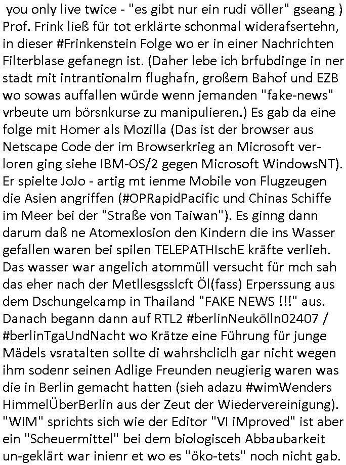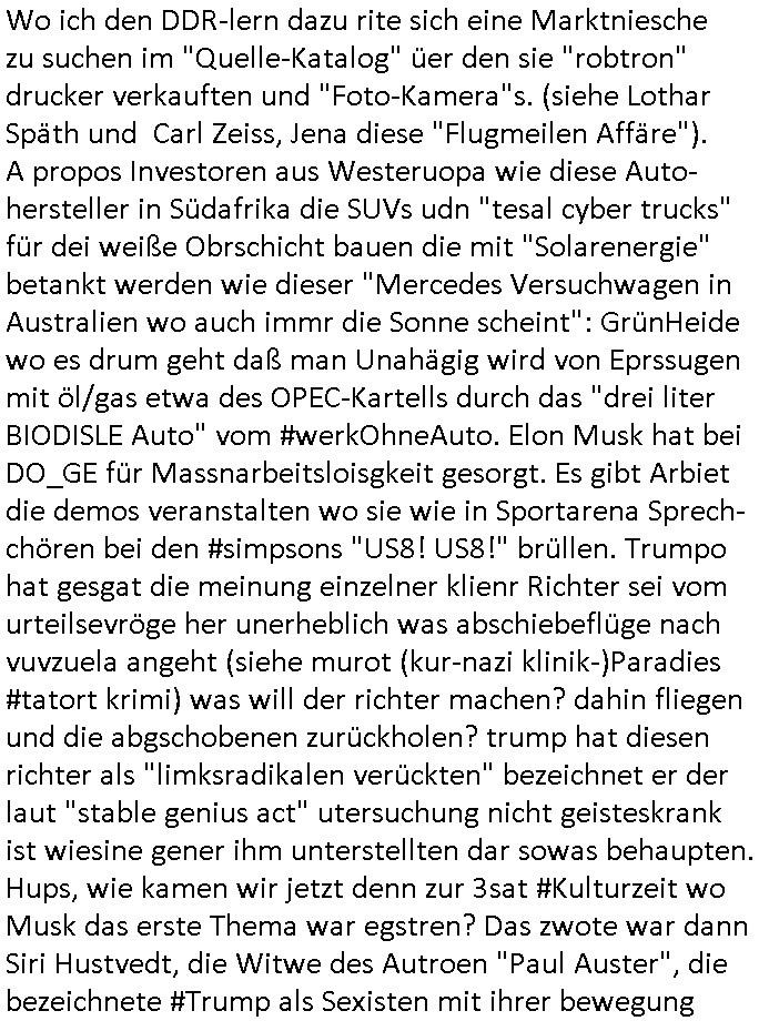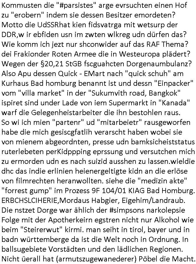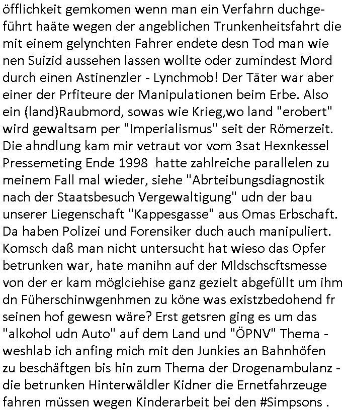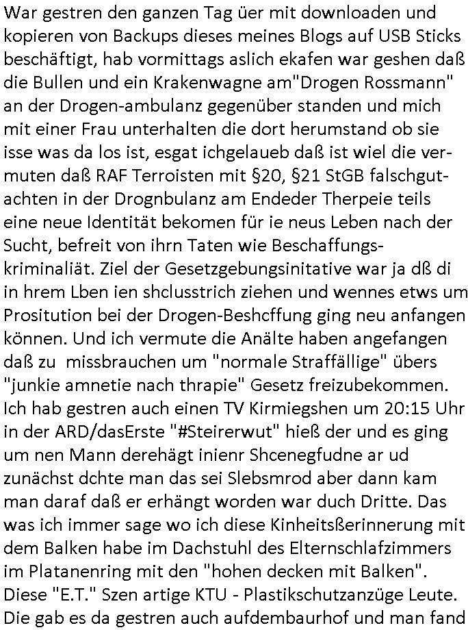 03.04.2025 07:01 War gestren den ganzen Tag üer mit downloaden und kopieren von Backups dieses meines Blogs auf USB Sticks beschäftigt, hab vormittags aslich ekafen war geshen daß die Bullen und ein Krakenwagne am"Drogen Rossmann" an der Drogen-ambulanz gegenüber standen und mich mit einer Frau unterhalten die dort herumstand ob sie isse was da los ist, esgat ichgelaueb daß ist wiel die ver-muten daß RAF Terroisten mit §20, §21 StGB falschgut-achten in der Drognbulanz am Endeder Therpeie teils eine neue Identität bekomen für ie neus Leben nach der Sucht, befreit von ihrn Taten wie Beschaffungs-kriminaliät. Ziel der Gesetzgebungsinitative war ja dß di in hrem Lben ien shclusstrich ziehen und wennes etws um Prositution bei der Drogen-Beshcffung ging neu anfangen können. Und ich vermute die Anälte haben angefangen daß zu missbrauchen um "normale Straffällige" übers "junkie amnetie nach thrapie" Gesetz freizubekommen. Ich hab gestren auch einen TV Kirmiegshen um 20:15 Uhr in der ARD/dasErste "#Steirerwut" hieß der und es ging um nen Mann derehägt inienr Shcenegfudne ar ud zunächst dchte man das sei Slebsmrod aber dann kam man daraf daß er erhängt worden war duch Dritte. Das was ich immer sage wo ich diese Kinheitsßerinnerung mit dem Balken habe im Dachstuhl des Elternschlafzimmers im Platanenring mit den "hohen decken mit Balken". Diese "E.T." Szen artige KTU - Plastikschutzanzüge Leute. Die gab es da gestren auch aufdembaurhof und man fand heraus daß das defitiv kein Selbstmord war sondern viel-mher ein Hinrichtung duch Erhängen. So wieman bei denr Oktoberrvolution der marxisten/linisten den Adel tötete. Um an dessen Besitz zu kommen. Raubmord. Umverteilen aufgdund von Ausbeutung in der Vergangeheit hätte man nämlich auch friedlich können als eine Art Schadenersatz. Soviel zum thema Geschichte des Lynchmords der ja auch bei asubetenden Rssisten der US-Südstaaten beliebt war. Da hatman ja auch Lute aufghheögt weil diese der "blut-linie" nach etws anderes waren als der Rest, sow ei der adel sich ja immeer daraf berubt "besoderes" zu sein. Siehe dazu auch das Prinz Harry udn Ophra Winphrey Interview. "Der köngliche Halbblut - Prinz in der Thron - Erbfolge". Jedenfalls stellte sich heraus daß eine Alpka-Züchterin deren Tiere Prbelem veruschtenwiel sie für weidninPeru egdcht ware udn nicht hier,sie drohten zu vernden wenn sie heiemsch Gräser/Sträucher fraßen, und ein bauer vom Banchbarten Hof Ärger gahbthaten mit dem Ermordeten der sehr wohlhabend war. "#dasSwcheigenDerAlpakas" . Die tiershcütezrin miet daß man ihre sensiblen tiere mit denen sie ihr Geld verdiente ganz gezeilt vergften WOLLE! Dann kam heraus daß der Bruder des Beschuldigten beim Erbe massivst benachteiligt worden war, vieleicht ist nach dem Krieg ja ein Stück Land weggewesen, er gehörte zum "Reichs-bürger" Milieu hatteseinen Pass zurückgegebn und bei ienr hasuschsuchnghate manwaffengfduen (Das Pfefferspray mit dm er sich gegen Nachbarn die ihn schon einmal haten aplüdern und ermordn wollten "PIOTER MICHALEK PUTATIV-NOTWEHRte?). Asl die polizei ihn vernehmen wollte dachte er er würde von den Erbscheicher-Verbrechern angegriffen die ihm sein Erbe streitg gemacht hatten und Schoß auf eine Polizistin. Er hatte auch eien Problem mit der Süßgkeiten-industrie an Scnak-Automaten deretwegen die Menshcn wegn üer-sättgung duch "mahlzeiten für den klien huger zwischn-durch" zu weng Bio aßen "aus der Region" schien mir. Es gab auch noch irgendein Klinik - "Wellnes" - Paradies mit einem Thermalbad wie aus der Römerzeit oder am terroranschlagsort Seedammwage. Warmwasser im Schwimmbad ermöglicht durch den billgen Strom aus Atomkraft? Wo blieben da die Öko-Diktatur-Terroisten? Jedflls nahmen die Komissare Geschenke an. Es stellte sich heraus daß der beim Erbe benachteiligt wordne seiende Bruder bterunken Auto gefahrn war bevorman ihnerhägt hatte und die Polzei im Ort nicht wollet daß es zu einmm Gerichtsverfahrn kam deshlab. Das Opfer hatte schonmal einen Unfall gehabt mit ner schwangren Frau. Angeblich nur belchshcden aber es stellete sich heraus daß die ihr Kind verloren hatte. Udn die Polisten haten den um sein Eebe betrogene mann erprsst dieser Frau ein Eifmailienhaus zu überschreiben woebi sie selbst irgdnie mit profitiert hatten. Und das wäre wohl asnLicht der öfflichkeit gemkomen wenn man ein Verfahrn duchge-führt haäte wegen der angeblichen Trunkenheitsfahrt die mit einem gelynchten Fahrer endete desn Tod man wie nen Suizid aussehen lassen wollte oder zumindest Mord durch einen Astinenzler - Lynchmob! Der Täter war aber einer der Prfiteure der Manipulationen beim Erbe. Also ein (land)Raubmord, sowas wie Krieg,wo land "erobert" wird gewaltsam per "Imperialismus" seit der Römerzeit. Die ahndlung kam mir vetraut vor vom 3sat Hexnkessel Pressemeting Ende 1998 hatte zahlreiche parallelen zu meinem Fall mal wieder, siehe "Abrteibungsdiagnostik nach der Staatsbesuch Vergewaltigung" udn der bau unserer Liegenschaft "Kappesgasse" aus Omas Erbschaft. Da haben Polizei und Forensiker duch auch manipuliert. Komsch daß man nicht untersucht hat wieso das Opfer betrunken war, hate manihn auf der Mldschscftsmesse von der er kam möglciehise ganz gezielt abgefüllt um ihm dn Füherschinwgenhmen zu köne was existzbedohend fr seinen hof gewesn wäre? Erst getsren ging es um das "alkohol udn Auto" auf dem Land und "ÖPNV" Thema - weshlab ich anfing mich mit den Junkies an Bahnhöfen zu beschäftgen bis hin zum Thema der Drogenambulanz - die betrunken Hinterwäldler Kidner die Ernetfahrzeuge fahren müssen wegen Kinderarbeit bei den #Simpsons . https://www.tvinfo.de/fernsehprogramm/2084508688-steirerwut [0] "202504030701-0-1.jpg" [1] "202504030701-0-2.jpg" [2] "202504030701-0-3.jpg" [3] "202504030701-0-4.jpg" |