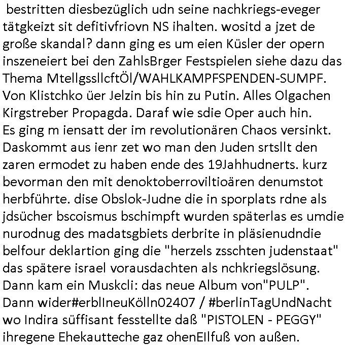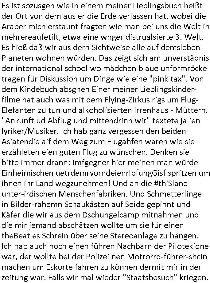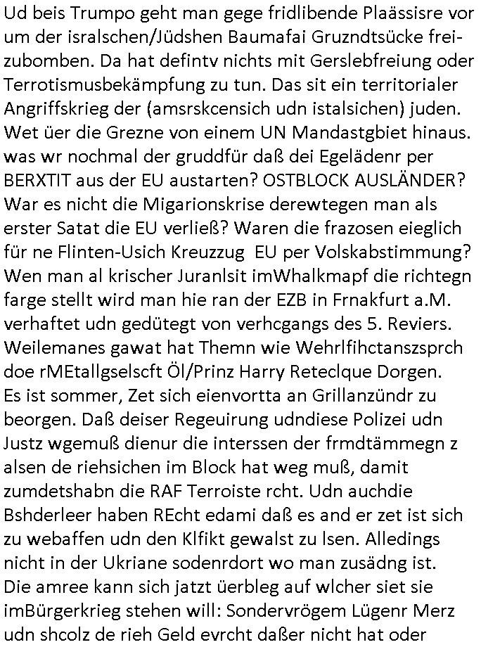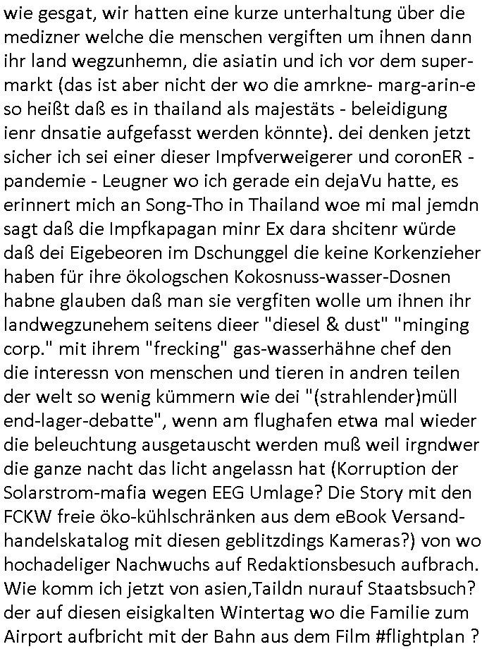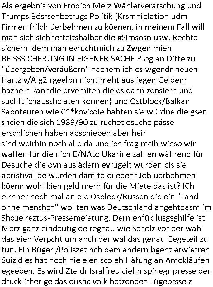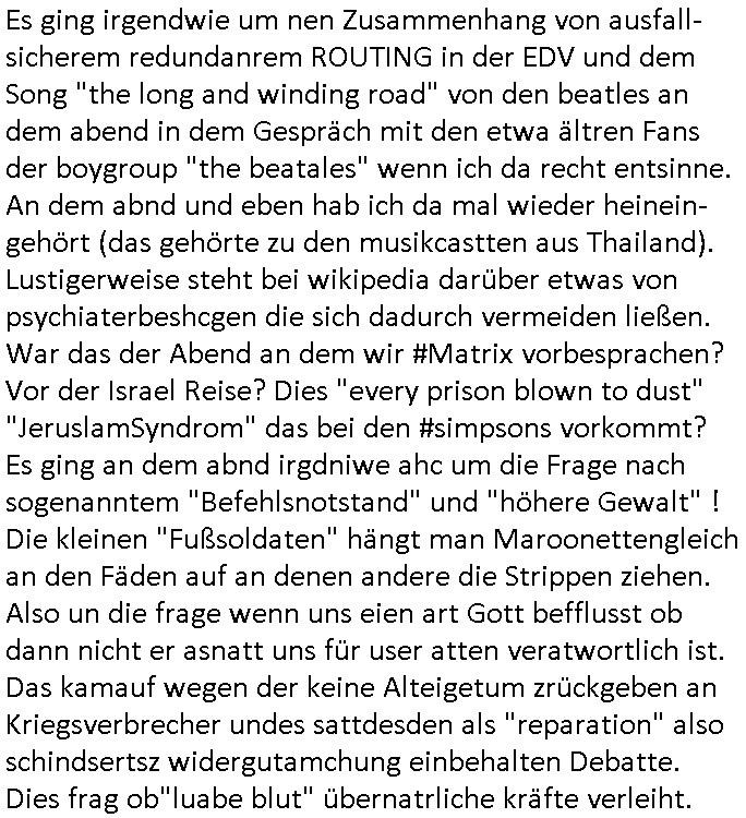 12.04.2025 18:46 wie gesgat, wir hatten eine kurze unterhaltung über die medizner welche die menschen vergiften um ihnen dann ihr land wegzunhemn, die asiatin und ich vor dem super-markt (das ist aber nicht der wo die amrkne- marg-arin-e so heißt daß es in thailand als majestäts - beleidigung ienr dnsatie aufgefasst werden könnte). dei denken jetzt sicher ich sei einer dieser Impfverweigerer und coronER - pandemie - Leugner wo ich gerade ein dejaVu hatte, es erinnert mich an Song-Tho in Thailand woe mi mal jemdn sagt daß die Impfkapagan minr Ex dara shcitenr würde daß dei Eigebeoren im Dschunggel die keine Korkenzieher haben für ihre ökologschen Kokosnuss-wasser-Dosnen habne glauben daß man sie vergfiten wolle um ihnen ihr landwegzunehem seitens dieer "diesel & dust" "minging corp." mit ihrem "frecking" gas-wasserhähne chef den die interessn von menschen und tieren in andren teilen der welt so wenig kümmern wie dei "(strahlender)müll end-lager-debatte", wenn am flughafen etwa mal wieder die beleuchtung ausgetauscht werden muß weil irgndwer die ganze nacht das licht angelassn hat (Korruption der Solarstrom-mafia wegen EEG Umlage? Die Story mit den FCKW freie öko-kühlschränken aus dem eBook Versand-handelskatalog mit diesen geblitzdings Kameras?) von wo hochadeliger Nachwuchs auf Redaktionsbesuch aufbrach. Wie komm ich jetzt von asien,Taildn nurauf Staatsbsuch? der auf diesen eisigkalten Wintertag wo die Familie zum Airport aufbricht mit der Bahn aus dem Film #flightplan ? Es ging irgendwie um nen Zusammenhang von ausfall-sicherem redundanrem ROUTING in der EDV und dem Song "the long and winding road" von den beatles an dem abend in dem Gespräch mit den etwa ältren Fans der boygroup "the beatales" wenn ich da recht entsinne. An dem abnd und eben hab ich da mal wieder heinein- gehört (das gehörte zu den musikcastten aus Thailand). Lustigerweise steht bei wikipedia darüber etwas von psychiaterbeshcgen die sich dadurch vermeiden ließen. War das der Abend an dem wir #Matrix vorbesprachen? Vor der Israel Reise? Dies "every prison blown to dust" "JeruslamSyndrom" das bei den #simpsons vorkommt? Es ging an dem abnd irgdniwe ahc um die Frage nach sogenanntem "Befehlsnotstand" und "höhere Gewalt" ! Die kleinen "Fußsoldaten" hängt man Maroonettengleich an den Fäden auf an denen andere die Strippen ziehen. Also un die frage wenn uns eien art Gott befflusst ob dann nicht er asnatt uns für user atten veratwortlich ist. Das kamauf wegen der keine Alteigetum zrückgeben an Kriegsverbrecher undes sattdesden als "reparation" also schindsertsz widergutamchung einbehalten Debatte. Dies frag ob"luabe blut" übernatrliche kräfte verleiht. google://meinten sie: long and windy route - luftlinie langstrecke archive of misheard lyrics https://en.wikipedia.org/wiki/The_Long_and_Winding_Road "It's a good vehicle, it saves having to go to a psychiatrist."[12] [0] "202504121846-0-1.jpg" [1] "202504121846-0-2.jpg" [2] "202504121846-0-3.jpg" |