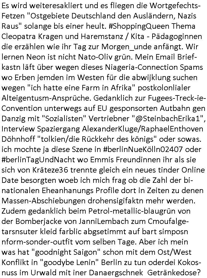 12.04.2025 15:30 Es wird weiteresakliert und es fliegen die Wortgefechts- Fetzen "Ostgebiete Deutschland den Ausländern, Nazis Raus" solange bis einer heult. #ShoppingQueen Thema Cleopatra Kragen und Haremstanz / Kita - Pädagoginnen die erzählen wie ihr Tag zur Morgen_unde anfängt. Wir lernen Neon ist nicht Nato-Oliv grün. Mein Email Brief-kastn läft über wegen dieses Niageria-Connection Spams wo Erben jemden im Westen für die abwijklung suchen wegen "ich hatte eine Farm in Afrika" postkolonlialer Alteigentusm-Ansprüche. Gedanklich zur Fugees-Treck-ie-Convention unterwegs auf EU gesponsorten Autbahn gen Danzig mit "Sozialisten" Vertriebner "@SteinbachErika1", Interview Spaziergang AlexanderKluge/RaphaelEnthoven Döhnhoff "tolkien/die Rückkehr des königs" oder sowas. ich mochte ja diese Szene in #berlinNueKölln02407 oder #berlinTagUndNacht wo Emmis Freundinnen ihr als sie sich von Kräteze36 trennte gleich ein neues tinder Online Date besorgten woeb ich mich frag ob die Zahl der bi-nationalen Eheanhanungs Profile dort in Zeiten zu denen Massen-Abschiebungen drohensigifaktn mehr werden. Zudem gedanklich beim Petrol-metallic-blaugrün von der Bomberjacke von JanniLembach zum Cmoufalge- tarsnsuter kleid farblic abgsetimmt auf bart simposn nform-sonder-outfit vom selben Tage. Aber ich mein was hat "goodnight Saigon" schon mit dem Ost/West Konflikt in "goodybe Lenin" Berlin zu tun oderdei Kokos-nuss im Urwald mit iner Danaergschnek Getränkedose? https://www.tvinfo.de/fernsehprogramm/2106125894-shopping-queen [0] "202504121530-0-1.jpg" |
