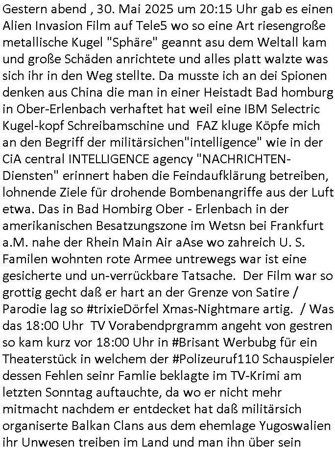 Gestern abend , 30. Mai 2025 um 20:15 Uhr gab es einen Alien Invasion Film auf Tele5 wo so eine Art riesengroße metallische Kugel "Sphäre" geannt asu dem Weltall kam und große Schäden anrichtete und alles platt walzte was sich ihr in den Weg stellte. Da musste ich an dei Spionen denken aus China die man in einer Heistadt Bad homburg in Ober-Erlenbach verhaftet hat weil eine IBM Selectric Kugel-kopf Schreibamschine und FAZ kluge Köpfe mich an den Begriff der militärsichen"intelligence" wie in der CiA central INTELLIGENCE agency "NACHRICHTEN-Diensten" erinnert haben die Feindaufklärung betreiben, lohnende Ziele für drohende Bombenangriffe aus der Luft etwa. Das in Bad Hombirg Ober - Erlenbach in der amerikanischen Besatzungszone im Wetsn bei Frankfurt a.M. nahe der Rhein Main Air aAse wo zahreich U. S. Familen wohnten rote Armee untrewegs war ist eine gesicherte und un-verrückbare Tatsache. Der Film war so grottig gecht daß er hart an der Grenze von Satire / Parodie lag so #trixieDörfel Xmas-Nightmare artig. / Was das 18:00 Uhr TV Vorabendprgramm angeht von gestren so kam kurz vor 18:00 Uhr in #Brisant Werbubg für ein Theaterstück in welchem der #Polizeuruf110 Schauspieler dessen Fehlen seinr Famlie beklagte im TV-Krimi am letzten Sonntag auftauchte, da wo er nicht mehr mitmacht nachdem er entdecket hat daß militärsich organiserte Balkan Clans aus dem ehemlage Yugoswalien ihr Unwesen treiben im Land und man ihn über sein