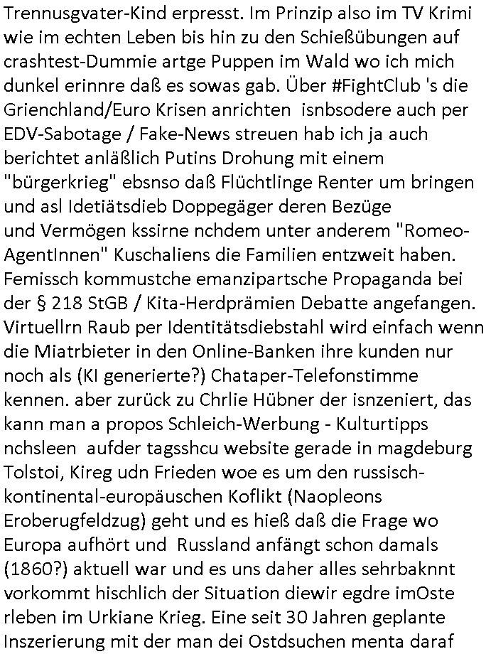 Trennusgvater-Kind erpresst. Im Prinzip also im TV Krimi wie im echten Leben bis hin zu den Schießübungen auf crashtest-Dummie artge Puppen im Wald wo ich mich dunkel erinnre daß es sowas gab. Über #FightClub 's die Grienchland/Euro Krisen anrichten isnbsodere auch per EDV-Sabotage / Fake-News streuen hab ich ja auch berichtet anläßlich Putins Drohung mit einem "bürgerkrieg" ebsnso daß Flüchtlinge Renter um bringen und asl Idetiätsdieb Doppegäger deren Bezüge und Vermögen kssirne nchdem unter anderem "Romeo-AgentInnen" Kuschaliens die Familien entzweit haben. Femissch kommustche emanzipartsche Propaganda bei der § 218 StGB / Kita-Herdprämien Debatte angefangen. Virtuellrn Raub per Identitätsdiebstahl wird einfach wenn die Miatrbieter in den Online-Banken ihre kunden nur noch als (KI generierte?) Chataper-Telefonstimme kennen. aber zurück zu Chrlie Hübner der isnzeniert, das kann man a propos Schleich-Werbung - Kulturtipps nchsleen aufder tagsshcu website gerade in magdeburg Tolstoi, Kireg udn Frieden woe es um den russisch-kontinental-europäuschen Koflikt (Naopleons Eroberugfeldzug) geht und es hieß daß die Frage wo Europa aufhört und Russland anfängt schon damals (1860?) aktuell war und es uns daher alles sehrbaknnt vorkommt hischlich der Situation diewir egdre imOste rleben im Urkiane Krieg. Eine seit 30 Jahren geplante Inszerierung mit der man dei Ostdsuchen menta daraf