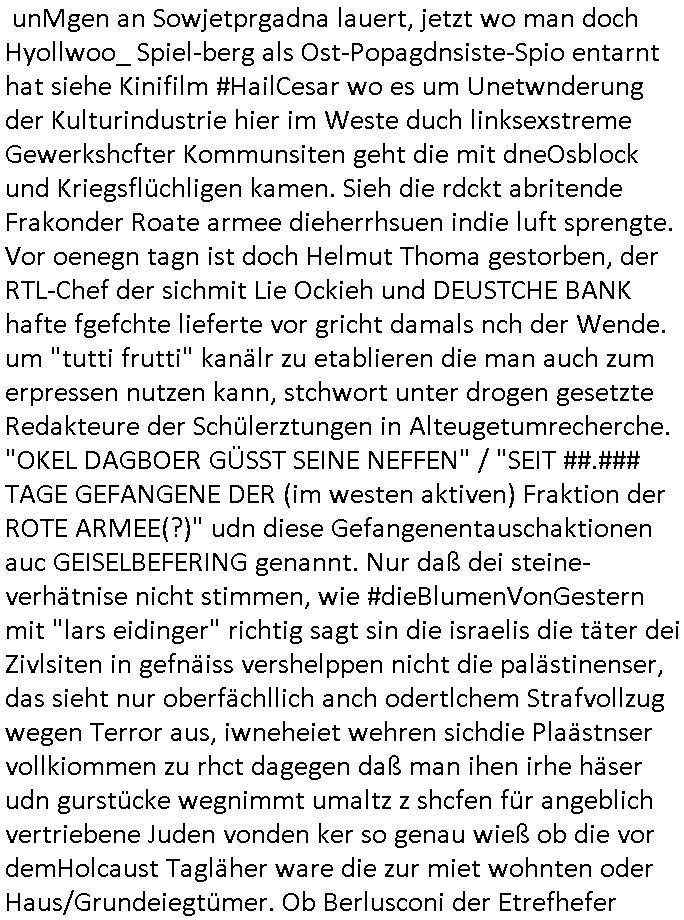 unMgen an Sowjetprgadna lauert, jetzt wo man doch Hyollwoo_ Spiel-berg als Ost-Popagdnsiste-Spio entarnt hat siehe Kinifilm #HailCesar wo es um Unetwnderung der Kulturindustrie hier im Weste duch linksexstreme Gewerkshcfter Kommunsiten geht die mit dneOsblock und Kriegsflüchligen kamen. Sieh die rdckt abritende Frakonder Roate armee dieherrhsuen indie luft sprengte. Vor oenegn tagn ist doch Helmut Thoma gestorben, der RTL-Chef der sichmit Lie Ockieh und DEUSTCHE BANK hafte fgefchte lieferte vor gricht damals nch der Wende. um "tutti frutti" kanälr zu etablieren die man auch zum erpressen nutzen kann, stchwort unter drogen gesetzte Redakteure der Schülerztungen in Alteugetumrecherche. "OKEL DAGBOER GÜSST SEINE NEFFEN" / "SEIT ##.### TAGE GEFANGENE DER (im westen aktiven) Fraktion der ROTE ARMEE(?)" udn diese Gefangenentauschaktionen auc GEISELBEFERING genannt. Nur daß dei steine-verhätnise nicht stimmen, wie #dieBlumenVonGestern mit "lars eidinger" richtig sagt sin die israelis die täter dei Zivlsiten in gefnäiss vershelppen nicht die palästinenser, das sieht nur oberfächllich anch odertlchem Strafvollzug wegen Terror aus, iwneheiet wehren sichdie Plaästnser vollkiommen zu rhct dagegen daß man ihen irhe häser udn gurstücke wegnimmt umaltz z shcfen für angeblich vertriebene Juden vonden ker so genau wieß ob die vor demHolcaust Tagläher ware die zur miet wohnten oder Haus/Grundeiegtümer. Ob Berlusconi der Etrefhefer