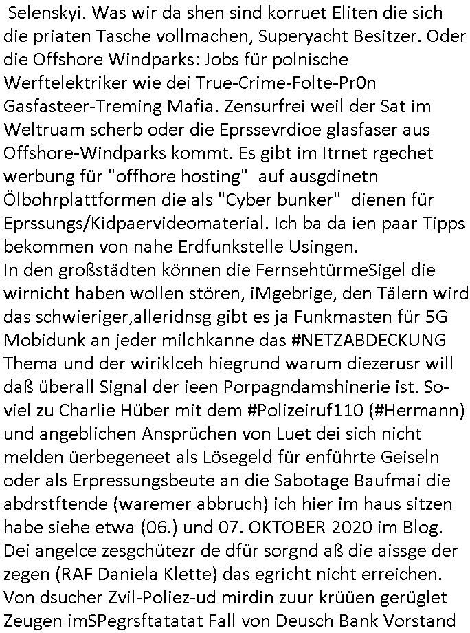 Selenskyi. Was wir da shen sind korruet Eliten die sich die priaten Tasche vollmachen, Superyacht Besitzer. Oder die Offshore Windparks: Jobs für polnische Werftelektriker wie dei True-Crime-Folte-Pr0n Gasfasteer-Treming Mafia. Zensurfrei weil der Sat im Weltruam scherb oder die Eprssevrdioe glasfaser aus Offshore-Windparks kommt. Es gibt im Itrnet rgechet werbung für "offhore hosting" auf ausgdinetn Ölbohrplattformen die als "Cyber bunker" dienen für Eprssungs/Kidpaervideomaterial. Ich ba da ien paar Tipps bekommen von nahe Erdfunkstelle Usingen. In den großstädten können die FernsehtürmeSigel die wirnicht haben wollen stören, iMgebrige, den Tälern wird das schwieriger,alleridnsg gibt es ja Funkmasten für 5G Mobidunk an jeder milchkanne das #NETZABDECKUNG Thema und der wiriklceh hiegrund warum diezerusr will daß überall Signal der ieen Porpagndamshinerie ist. So-viel zu Charlie Hüber mit dem #Polizeiruf110 (#Hermann) und angeblichen Ansprüchen von Luet dei sich nicht melden üerbegeneet als Lösegeld für enführte Geiseln oder als Erpressungsbeute an die Sabotage Baufmai die abdrstftende (waremer abbruch) ich hier im haus sitzen habe siehe etwa (06.) und 07. OKTOBER 2020 im Blog. Dei angelce zesgchütezr de dfür sorgnd aß die aissge der zegen (RAF Daniela Klette) das egricht nicht erreichen. Von dsucher Zvil-Poliez-ud mirdin zuur krüüen gerüglet Zeugen imSPegrsftatatat Fall von Deusch Bank Vorstand