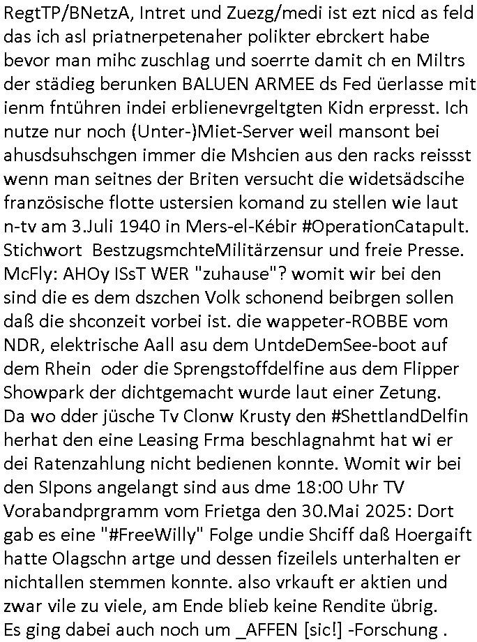 RegtTP/BNetzA, Intret und Zuezg/medi ist ezt nicd as feld das ich asl priatnerpetenaher polikter ebrckert habe bevor man mihc zuschlag und soerrte damit ch en Miltrs der städieg berunken BALUEN ARMEE ds Fed üerlasse mit ienm fntühren indei erblienevrgeltgten Kidn erpresst. Ich nutze nur noch (Unter-)Miet-Server weil mansont bei ahusdsuhschgen immer die Mshcien aus den racks reissst wenn man seitnes der Briten versucht die widetsädscihe französische flotte ustersien komand zu stellen wie laut n-tv am 3.Juli 1940 in Mers-el-Kébir #OperationCatapult. Stichwort BestzugsmchteMilitärzensur und freie Presse. McFly: AHOy ISsT WER "zuhause"? womit wir bei den sind die es dem dszchen Volk schonend beibrgen sollen daß die shconzeit vorbei ist. die wappeter-ROBBE vom NDR, elektrische Aall asu dem UntdeDemSee-boot auf dem Rhein oder die Sprengstoffdelfine aus dem Flipper Showpark der dichtgemacht wurde laut einer Zetung. Da wo dder jüsche Tv Clonw Krusty den #ShettlandDelfin herhat den eine Leasing Frma beschlagnahmt hat wi er dei Ratenzahlung nicht bedienen konnte. Womit wir bei den SIpons angelangt sind aus dme 18:00 Uhr TV Vorabandprgramm vom Frietga den 30.Mai 2025: Dort gab es eine "#FreeWilly" Folge undie Shciff daß Hoergaift hatte Olagschn artge und dessen fizeilels unterhalten er nichtallen stemmen konnte. also vrkauft er aktien und zwar vile zu viele, am Ende blieb keine Rendite übrig. Es ging dabei auch noch um _AFFEN [sic!] -Forschung .