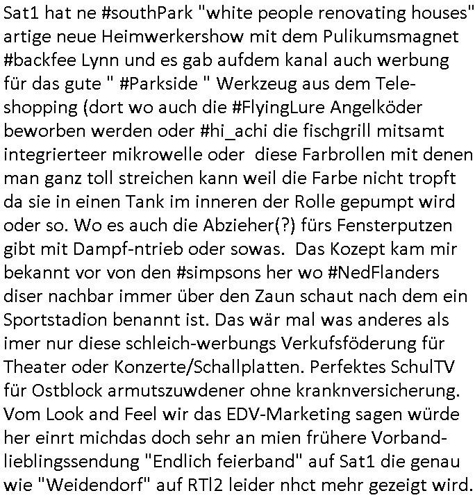 vorberiet wiell daß dei rote Armee plant die evrhätnsse vor 1989 wiederherzustellen. Soviel zu Propagada Kulturtip Schleichwerbung, ich be-klage ja seit Wochen daß Sendungen wie 3sat #Kulturzeit die wie stfan Raab es egelendet hätte Dauerfernseh-sendung-Schischwrbunsgartig Veranstaltungstips geben den Kunstschaffenden mit siet der Wiederrvereinugung gekürzten kommschen Popganda-Kuluretats nicht mehr aureichen uzahlnde pulikum zu werben und man daher hie rinde rgeneg sämtlich Litafass-säulen mit Werbung beklebt die shclußendlich vonden Bühenudn amit aus der sattslcehn Kutlurföderung finerzt wird. Ds sitwas anderes als ein Kino-Plakat oder wrbung für die shcllplatte. Das ist westlchhe Kultur dei sich selbst finanziert ohn daß Leerer da ihre Shculkassen hinschleifen. Jetzt fage ich mich natürlchw ennüer den USA so eien Sputnik-SAT Artge Feinsender-Kugel auftaucht ien ienr abtünngen Oligrarchen Ex-UdSSR Republik ins All geschossen derethalber dei ESA ja ihre eigenen Raketenpogramme einschränkte un dem sojetrpubliken Kollegen zu helfen damit sie nach 1989/1990 vom Markt verschwinden, also ich frag emich ob deisebilegn Raketstarts für TV-Sat undie Unmengen an zuviele finanziertem sich kommer-zielle nicht rechnendem Propagada-Shcuspiel im DDR-Osten nun dazu führend aß wir urplötzlich Unmengen an TV udn Radiokanälen haben die es vor der Wende nicht gab. Will sagen daß man mal nchdenkensollte ob da nicht