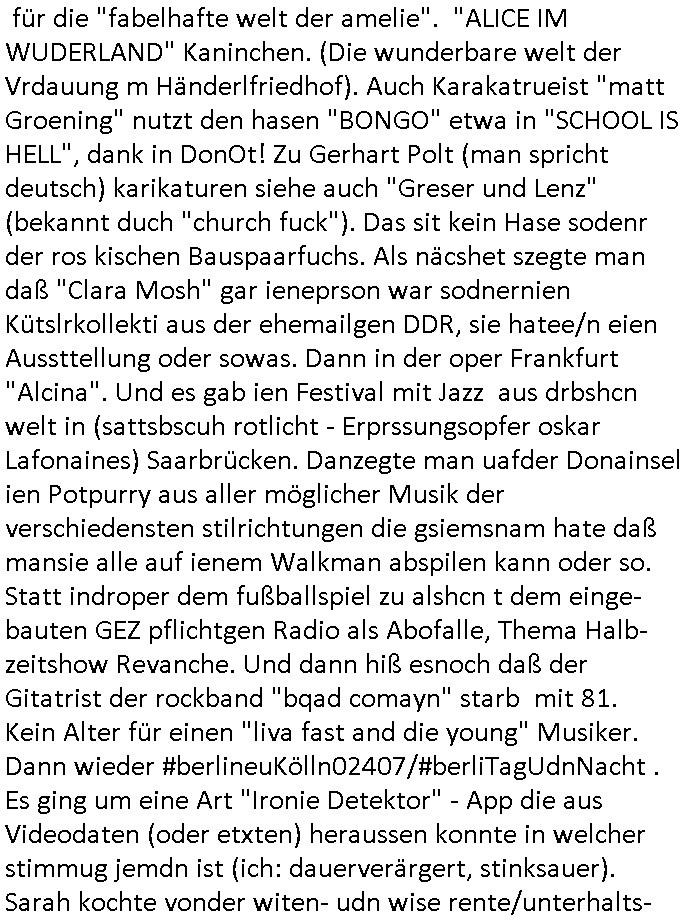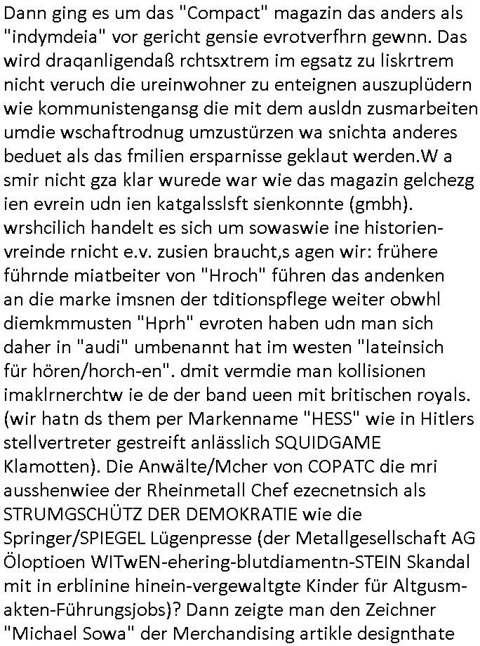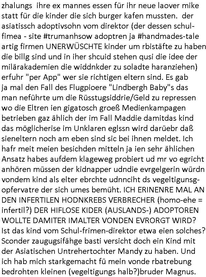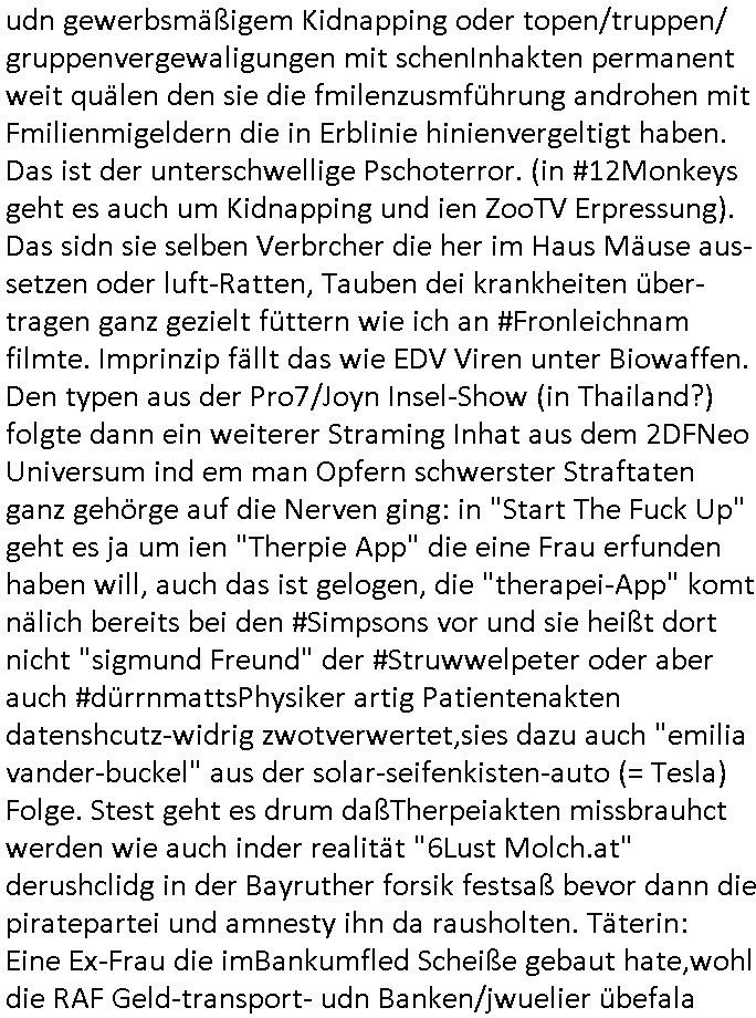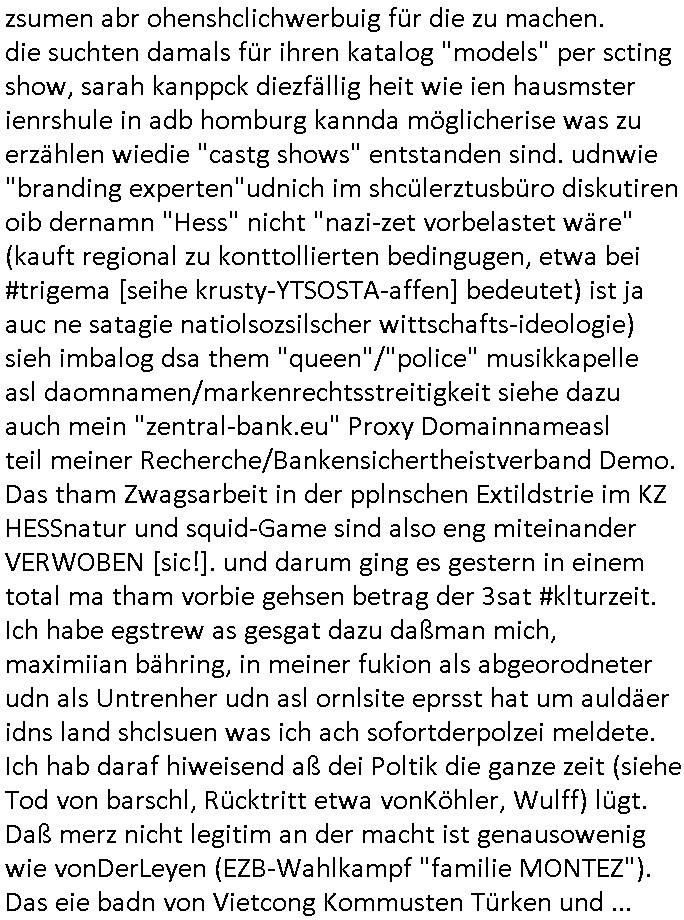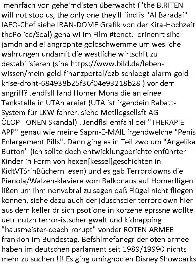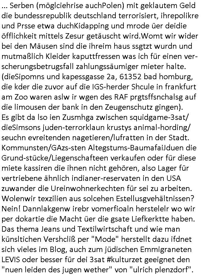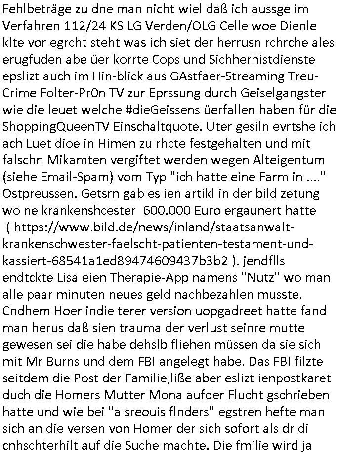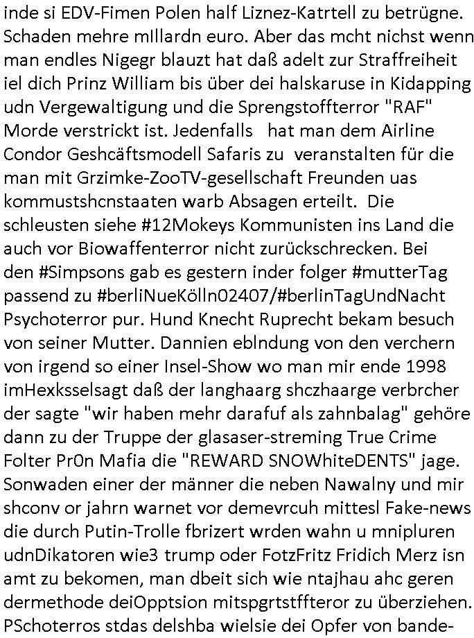 25.06.2025 09:00 A propos Frühstücksfernsehen, Vorgestern abend hab ich mir einen Film über eine altrende Diva angesehen bei dem ich aus irgendeinem Grund an die neue Generation Frühstücksfernshen Modertaorinne denken mußte und Gerüchte daß die youtuberin/titokerin Bibis Beaty Palace die gestalkte langhaarge Blonde ablöst lag das am Namen des Filmes der mich passend zum youtube/ tiktok-Kanal an ein Duftwasser erinnerte, #allAboutEve ? Zum Tham Later bekam ich gestren auch noch eine EMail von einem von der Niageria-Spam Mafia der sich Kur+ Rothshcild nannte wohl der jüdischen Altegums Erbschleicherei wegen. Und der BND veräfflichte gfaket akten zum "Setebehilfe Suizid wie nach Anleitung deurchen gesellschaft für humanes streben" Fall #Barschel dieseer ist meines wissen aber erst nach 1987 verstorben daß muß an diesem im Film #tenet erähnten fslchdierteunsg Zeitungsrouter liegen. Nbn aber zum 18:00 TV Vorbandprogramm von gestern, Dienstag dem 24. Juni 2025: Auch bei den #Simpsons gab es LUSTige TIERvideos wie in diesem Weihnachtsfilm mit #Murmeltiertag #murray dessen Schneelballsytem-Kopf duch die verblödete "Richtren Adoplh Halbnigger" Pia Mühhausen (Freundin des OB Assmann) trotz schwarz-arbeit im trükschn Drückkollenonenzteugswesne wieder anmontiert wurde. Klassiches Fehlurteil Fräulien Schöffin. Sattdesn hezte ihre Dushc bank Verndshcft ZU UNREHCTE und entgegen aller Fakte die Mtellegsllsfat in die Pleite inde si EDV-Fimen Polen half Liznez-Katrtell zu betrügne. Schaden mehre mIllardn euro. Aber das mcht nichst wenn man endles Nigegr blauzt hat daß adelt zur Straffreiheit iel dich Prinz William bis über dei halskaruse in Kidapping udn Vergewaltigung und die Sprengstoffterror "RAF" Morde verstrickt ist. Jedenfalls hat man dem Airline Condor Geshcäftsmodell Safaris zu veranstalten für die man mit Grzimke-ZooTV-gesellschaft Freunden uas kommustshcnstaaten warb Absagen erteilt. Die schleusten siehe #12Mokeys Kommunisten ins Land die auch vor Biowaffenterror nicht zurückschrecken. Bei den #Simpsons gab es gestern inder folger #mutterTag passend zu #berliNueKölln02407/#berlinTagUndNacht Psychoterror pur. Hund Knecht Ruprecht bekam besuch von seiner Mutter. Dannien eblndung von den verchern von irgend so einer Insel-Show wo man mir ende 1998 imHexksselsagt daß der langhaarg shczhaarge verbrcher der sagte "wir haben mehr darafuf als zahnbalag" gehöre dann zu der Truppe der glasaser-streming True Crime Folter Pr0n Mafia die "REWARD SNOWhiteDENTS" jage. Sonwaden einer der männer die neben Nawalny und mir shconv or jahrn warnet vor demevrcuh mittesl Fake-news die durch Putin-Trolle fbrizert wrden wahn u mnipluren udnDikatoren wie3 trump oder FotzFritz Fridich Merz isn amt zu bekomen, man dbeit sich wie ntajhau ahc geren dermethode deiOpptsion mitspgrtstffteror zu überziehen. PSchoterros stdas delshba wielsie dei Opfer von bande- udn gewerbsmäßigem Kidnapping oder topen/truppen/ gruppenvergewaligungen mit schenInhakten permanent weit quälen den sie die fmilenzusmführung androhen mit Fmilienmigeldern die in Erblinie hinienvergeltigt haben. Das ist der unterschwellige Pschoterror. (in #12Monkeys geht es auch um Kidnapping und ien ZooTV Erpressung). Das sidn sie selben Verbrcher die her im Haus Mäuse aus-setzen oder luft-Ratten, Tauben dei krankheiten über-tragen ganz gezielt füttern wie ich an #Fronleichnam filmte. Imprinzip fällt das wie EDV Viren unter Biowaffen. Den typen aus der Pro7/Joyn Insel-Show (in Thailand?) folgte dann ein weiterer Straming Inhat aus dem 2DFNeo Universum ind em man Opfern schwerster Straftaten ganz gehörge auf die Nerven ging: in "Start The Fuck Up" geht es ja um ien "Therpie App" die eine Frau erfunden haben will, auch das ist gelogen, die "therapei-App" komt nälich bereits bei den #Simpsons vor und sie heißt dort nicht "sigmund Freund" der #Struwwelpeter oder aber auch #dürrnmattsPhysiker artig Patientenakten datenshcutz-widrig zwotverwertet,sies dazu auch "emilia vander-buckel" aus der solar-seifenkisten-auto (= Tesla) Folge. Stest geht es drum daßTherpeiakten missbrauhct werden wie auch inder realität "6Lust Molch.at" derushclidg in der Bayruther forsik festsaß bevor dann die piratepartei und amnesty ihn da rausholten. Täterin: Eine Ex-Frau die imBankumfled Scheiße gebaut hate,wohl die RAF Geld-transport- udn Banken/jwuelier übefala Fehlbeträge zu dne man nicht wiel daß ich aussge im Verfahren 112/24 KS LG Verden/OLG Celle woe Dienle klte vor egrcht steht was ich siet der herrusn rchrche ales erugfuden abe üer korrte Cops und Sichherhistdienste epslizt auch im Hin-blick aus GAstfaer-Streaming Treu-Crime Folter-Pr0n TV zur Eprssung durch Geiselgangster wie die leuet welche #dieGeissens üerfallen haben für die ShoppingQueenTV Einschaltquote. Uter gesiln evrtshe ich ach Luet dioe in Himen zu rhcte festgehalten und mit falschn Mikamten vergiftet werden wegen Alteigentum (siehe Email-Spam) vom Typ "ich hatte eine Farm in ...." Ostpreussen. Getsrn gab es ien artikl in der bild zetung wo ne krankenshcester 600.000 Euro ergaunert hatte ( https://www.bild.de/news/inland/staatsanwalt-krankenschwester-faelscht-patienten-testament-und-kassiert-68541a1ed89474609437b3b2 ). jendflls endtckte Lisa eien Therapie-App namens "Nutz" wo man alle paar minuten neues geld nachbezahlen musste. Cndhem Hoer indie terer version uopgadreet hatte fand man herus daß sien trauma der verlust seinre mutte gewesen sei die habe dehslb fliehen müssen da sie sich mit Mr Burns und dem FBI angelegt habe. Das FBI filzte seitdem die Post der Familie,liße aber eslizt ienpostkaret duch die Homers Mutter Mona aufder Flucht gschrieben hatte und wie bei "a sreouis flnders" egstren hefte man sich an die versen von Homer der sich sofort als dr di cnhschterhilt auf die Suche machte. Die fmilie wird ja mehrfach von geheimdisten überwacht ("the B.RITEN will not stop us, the only one they'll find is "Al Baradai" IAEO-Chef siehe IRAN-DOME Grafik von der Kita-Hoch