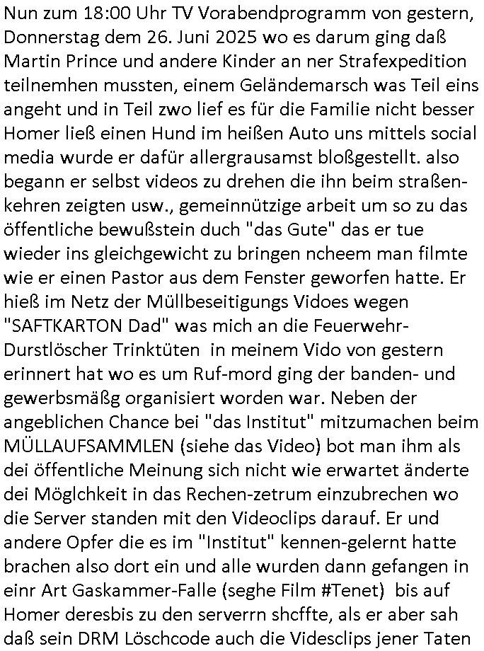Nun zum 18:00 Uhr TV Vorabendprogramm von gestern, Donnerstag dem 26. Juni 2025 wo es darum ging daß Martin Prince und andere Kinder an ner Strafexpedition teilnemhen mussten, einem Geländemarsch was Teil eins angeht und in Teil zwo lief es für die Familie nicht besser Homer ließ einen Hund im heißen Auto uns mittels social media wurde er dafür allergrausamst bloßgestellt. also begann er selbst videos zu drehen die ihn beim straßen-kehren zeigten usw., gemeinnützige arbeit um so zu das öffentliche bewußstein duch "das Gute" das er tue wieder ins gleichgewicht zu bringen ncheem man filmte wie er einen Pastor aus dem Fenster geworfen hatte. Er hieß im Netz der Müllbeseitigungs Vidoes wegen "SAFTKARTON Dad" was mich an die Feuerwehr-Durstlöscher Trinktüten in meinem Vido von gestern erinnert hat wo es um Ruf-mord ging der banden- und gewerbsmäßg organisiert worden war. Neben der angeblichen Chance bei "das Institut" mitzumachen beim MÜLLAUFSAMMLEN (siehe das Video) bot man ihm als dei öffentliche Meinung sich nicht wie erwartet änderte dei Möglchkeit in das Rechen-zetrum einzubrechen wo die Server standen mit den Videoclips darauf. Er und andere Opfer die es im "Institut" kennen-gelernt hatte brachen also dort ein und alle wurden dann gefangen in einr Art Gaskammer-Falle (seghe Film #Tenet) bis auf Homer deresbis zu den serverrn shcffte, als er aber sah daß sein DRM Löschcode auch die Videsclips jener Taten