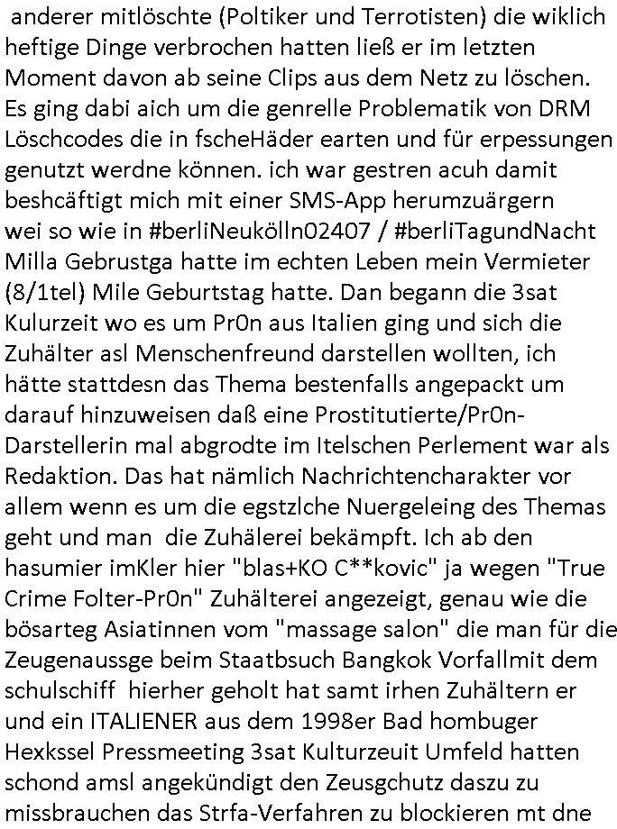 anderer mitlöschte (Poltiker und Terrotisten) die wiklich heftige Dinge verbrochen hatten ließ er im letzten Moment davon ab seine Clips aus dem Netz zu löschen. Es ging dabi aich um die genrelle Problematik von DRM Löschcodes die in fscheHäder earten und für erpessungen genutzt werdne können. ich war gestren acuh damit beshcäftigt mich mit einer SMS-App herumzuärgern wei so wie in #berliNeukölln02407 / #berliTagundNacht Milla Gebrustga hatte im echten Leben mein Vermieter (8/1tel) Mile Geburtstag hatte. Dan begann die 3sat Kulurzeit wo es um Pr0n aus Italien ging und sich die Zuhälter asl Menschenfreund darstellen wollten, ich hätte stattdesn das Thema bestenfalls angepackt um darauf hinzuweisen daß eine Prostitutierte/Pr0n-Darstellerin mal abgrodte im Itelschen Perlement war als Redaktion. Das hat nämlich Nachrichtencharakter vor allem wenn es um die egstzlche Nuergeleing des Themas geht und man die Zuhälerei bekämpft. Ich ab den hasumier imKler hier "blas+KO C**kovic" ja wegen "True Crime Folter-Pr0n" Zuhälterei angezeigt, genau wie die bösarteg Asiatinnen vom "massage salon" die man für die Zeugenaussge beim Staatbsuch Bangkok Vorfallmit dem schulschiff hierher geholt hat samt irhen Zuhältern er und ein ITALIENER aus dem 1998er Bad hombuger Hexkssel Pressmeeting 3sat Kulturzeuit Umfeld hatten schond amsl angekündigt den Zeusgchutz daszu zu missbrauchen das Strfa-Verfahren zu blockieren mt dne