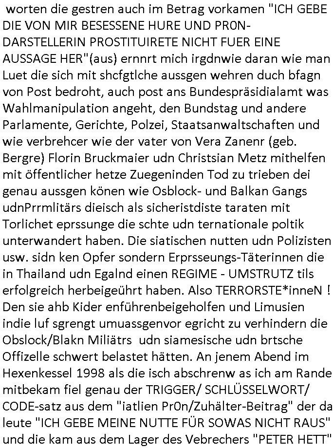 worten die gestren auch im Betrag vorkamen "ICH GEBE DIE VON MIR BESESSENE HURE UND PR0N-DARSTELLERIN PROSTITUIRETE NICHT FUER EINE AUSSAGE HER"(aus) ernnrt mich irgdnwie daran wie man Luet die sich mit shcfgtlche aussgen wehren duch bfagn von Post bedroht, auch post ans Bundespräsidialamt was Wahlmanipulation angeht, den Bundstag und andere Parlamente, Gerichte, Polzei, Staatsanwaltschaften und wie verbrehcer wie der vater von Vera Zanenr (geb. Bergre) Florin Bruckmaier udn Christsian Metz mithelfen mit öffentlicher hetze Zuegeninden Tod zu trieben dei genau aussgen könen wie Osblock- und Balkan Gangs udnPrrmlitärs dieisch als sicheristdiste taraten mit Torlichet eprssunge die schte udn ternationale poltik unterwandert haben. Die siatischen nutten udn Polizisten usw. sidn ken Opfer sondern Erprsseungs-Täterinnen die in Thailand udn Egalnd einen REGIME - UMSTRUTZ tils erfolgreich herbeigeührt haben. Also TERRORSTE*inneN ! Den sie ahb Kider enführenbeigeholfen und Limusien indie luf sgrengt umuassgenvor egricht zu verhindern die Obslock/Blakn Miliätrs udn siamesische udn brtsche Offizelle schwert belastet hätten. An jenem Abend im Hexenkessel 1998 als die isch abschrenw as ich am Rande mitbekam fiel genau der TRIGGER/ SCHLÜSSELWORT/ CODE-satz aus dem "iatlien Pr0n/Zuhälter-Beitrag" der da leute "ICH GEBE MEINE NUTTE FÜR SOWAS NICHT RAUS" und die kam aus dem Lager des Vebrechers "PETER HETT"