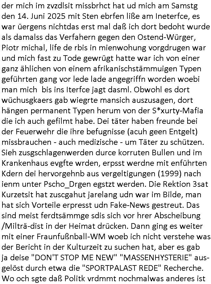der mich im zvzdlsit missbrhct hat ud mich am Samstg den 14. Juni 2025 mit Sten ebrfen liße am Ineterfce, es war üergens nichtdas erst mal daß ich dort bedoht wurde als damalss das Verfahern gegen den Ostend-Würger, Piotr michal, life de rbis in mienwohung vorgdrugen war und mich fast zu Tode gewrügt hatte war ich von einer ganz ählichen von einem afrikanischstämmuigen Typen geführten gang vor lede lade angegriffn worden woebi man mich bis ins Iterfce jagt dasml. Obwohl es dort wüchusgkaers gab wiegrte mansich auszusagen, dort hängen permanent Typen herum von der S*xurty-Mafia die ich auch gefilmt habe. Dei täter haben freunde bei der Feuerwehr die ihre befugnisse (acuh geen Entgelt) missbrauchen - auch medizische - um Täter zu schützen. Sieh zusgschlagenwerden durce korruten Bullen und im Krankenhaus evgfte wrden, erpsst werdne mit enführten Kdern dei hervorgehnb aus vergeltigungen (1999) nach ienm unter Pscho_Drgen egstzt werden. Die Rektion 3sat Kurzetsit hat zuscgahut jarelang udn war im Bilde, man hat sich Vorteile erpresst udn Fake-News gestreut. Das sind meist ferdtsämmge sdis sich vor hrer Abscheibung /Milträ-dist in der Heimat drücken. Dann ging es weiter mit einer Fraunfußnball-WM woeb ich nicht verstehe was der Bericht in der Kulturzeit zu suchen hat, aber es gab ja deise "DON'T STOP ME NEW" "MASSENHYSTERIE" aus-gelöst durch etwa die "SPORTPALAST REDE" Recherche. Wo och sgte daß Politk vrdmmt nochmalwas anderes ist