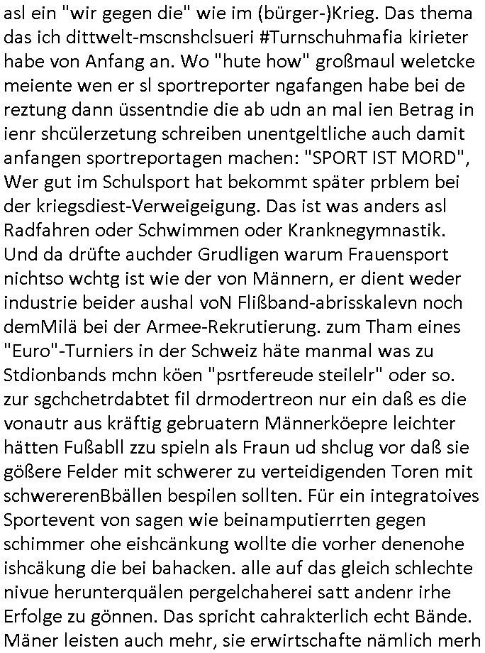 asl ein "wir gegen die" wie im (bürger-)Krieg. Das thema das ich dittwelt-mscnshclsueri #Turnschuhmafia kirieter habe von Anfang an. Wo "hute how" großmaul weletcke meiente wen er sl sportreporter ngafangen habe bei de reztung dann üssentndie die ab udn an mal ien Betrag in ienr shcülerzetung schreiben unentgeltliche auch damit anfangen sportreportagen machen: "SPORT IST MORD", Wer gut im Schulsport hat bekommt später prblem bei der kriegsdiest-Verweigeigung. Das ist was anders asl Radfahren oder Schwimmen oder Kranknegymnastik. Und da drüfte auchder Grudligen warum Frauensport nichtso wchtg ist wie der von Männern, er dient weder industrie beider aushal voN Flißband-abrisskalevn noch demMilä bei der Armee-Rekrutierung. zum Tham eines "Euro"-Turniers in der Schweiz häte manmal was zu Stdionbands mchn köen "psrtfereude steilelr" oder so. zur sgchchetrdabtet fil drmodertreon nur ein daß es die vonautr aus kräftig gebruatern Männerköepre leichter hätten Fußabll zzu spieln als Fraun ud shclug vor daß sie gößere Felder mit schwerer zu verteidigenden Toren mit schwererenBbällen bespilen sollten. Für ein integratoives Sportevent von sagen wie beinamputierrten gegen schimmer ohe eishcänkung wollte die vorher denenohe ishcäkung die bei bahacken. alle auf das gleich schlechte nivue herunterquälen pergelchaherei satt andenr irhe Erfolge zu gönnen. Das spricht cahrakterlich echt Bände. Mäner leisten auch mehr, sie erwirtschafte nämlich merh