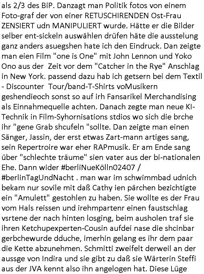 als 2/3 des BiP. Danzagt man Politik fotos von einem Foto-graf der von einer RETUSCHIRENDEN Ost-Frau ZENSIERT udn MANIPULIERT wurde. Hätte er die Bilder selber ent-sickeln auswählen drüfen häte die ausstelung ganz anders asuegshen hate ich den Eindruck. Dan zeigte man eien Film "one is One" mit John Lennon und Yoko Ono aus der Zeit vor dem "Catcher in the Rye" Anschlag in New York. passend dazu hab ich getsern bei dem Textil - Discounter Tour/band-T-Shirts voMusikern geshendieoch sonst so auf irh Fansarikel Merchandising als Einnahmequelle achten. Danach zegte man neue KI-Technik in Film-Syhornisations stdios wo sich die brche ihr "gene Grab shcufeln "sollte. Dan zeigte man einen Sänger, Jassin, der erst etwas Zart-mann artiges sang, sein Repertroire war eher RAPmusik. Er am Ende sang über "schlechte träume" sien vater aus der bi-nationalen Ehe. Dann wider #berliNueKölln02407 / #berlinTagUndNacht . man war im schwimmbad udnich bekam nur sovile mit daß Cathy ien pärchen bezichtigte ein "Amulett" gestohlen zu haben. Sie wollte es der Frau vom Hals reissen und irehmpartenr einen faustschlag vsrtene der nach hinten losging, beim ausholen traf sie ihren Ketchupexperten-Cousin aufdei nase die shcinbar gerbchewurde dduche, imerhin gelang es ihr dem paar die Kette abzunehmen. Schmitti zweifelt derweil an der aussge von Indira und sie gibt zu daß sie Wärterin Steffi aus der JVA kennt also ihn angelogen hat. Diese Lüge