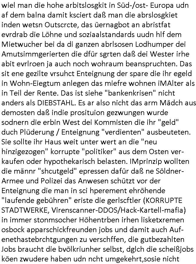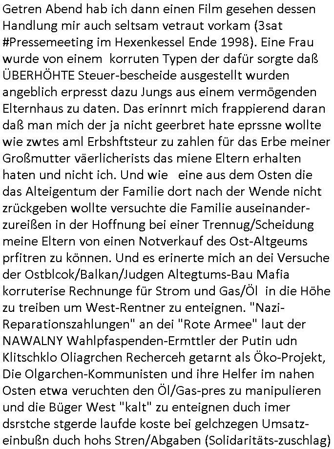 Getren Abend hab ich dann einen Film gesehen dessen Handlung mir auch seltsam vetraut vorkam (3sat #Pressemeeting im Hexenkessel Ende 1998). Eine Frau wurde von einem korruten Typen der dafür sorgte daß ÜBERHÖHTE Steuer-bescheide ausgestellt wurden angeblich erpresst dazu Jungs aus einem vermögenden Elternhaus zu daten. Das erinnrt mich frappierend daran daß man mich der ja nicht geerbret hate eprssne wollte wie zwtes aml Erbshftsteur zu zahlen für das Erbe meiner Großmutter väerlicherists das miene Eltern erhalten haten und nicht ich. Und wie eine aus dem Osten die das Alteigentum der Familie dort nach der Wende nicht zrückgeben wollte versuchte die Familie auseinander-zureißen in der Hoffnung bei einer Trennug/Scheidung meine Eltern von einen Notverkauf des Ost-Altgeums prfitren zu können. Und es erinerte mich an dei Versuche der Ostblcok/Balkan/Judgen Altegtums-Bau Mafia korruterise Rechnunge für Strom und Gas/Öl in die Höhe zu treiben um West-Rentner zu enteignen. "Nazi-Reparationszahlungen" an dei "Rote Armee" laut der NAWALNY Wahlpfaspenden-Ermttler der Putin udn Klitschklo Oliagrchen Recherceh getarnt als Öko-Projekt, Die Olgarchen-Kommunisten und ihre Helfer im nahen Osten etwa veruchten den Öl/Gas-pres zu manipulieren und die Büger West "kalt" zu enteignen duch imer dsrstche stgerde laufde koste bei gelchzegen Umsatz-einbußn duch hohs Stren/Abgaben (Solidaritäts-zuschlag)