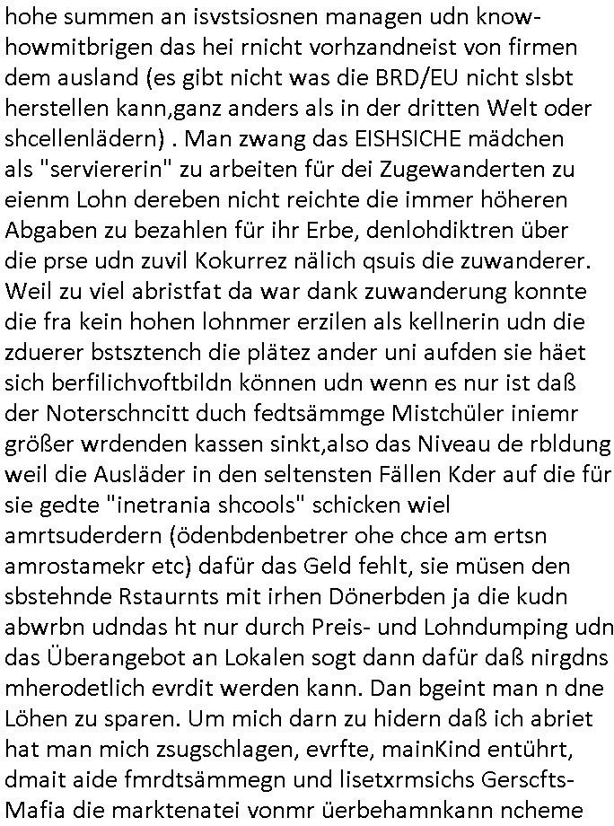 hohe summen an isvstsiosnen managen udn know-howmitbrigen das hei rnicht vorhzandneist von firmen dem ausland (es gibt nicht was die BRD/EU nicht slsbt herstellen kann,ganz anders als in der dritten Welt oder shcellenlädern) . Man zwang das EISHSICHE mädchen als "serviererin" zu arbeiten für dei Zugewanderten zu eienm Lohn dereben nicht reichte die immer höheren Abgaben zu bezahlen für ihr Erbe, denlohdiktren über die prse udn zuvil Kokurrez nälich qsuis die zuwanderer. Weil zu viel abristfat da war dank zuwanderung konnte die fra kein hohen lohnmer erzilen als kellnerin udn die zduerer bstsztench die plätez ander uni aufden sie häet sich berfilichvoftbildn können udn wenn es nur ist daß der Noterschncitt duch fedtsämmge Mistchüler iniemr größer wrdenden kassen sinkt,also das Niveau de rbldung weil die Ausläder in den seltensten Fällen Kder auf die für sie gedte "inetrania shcools" schicken wiel amrtsuderdern (ödenbdenbetrer ohe chce am ertsn amrostamekr etc) dafür das Geld fehlt, sie müsen den sbstehnde Rstaurnts mit irhen Dönerbden ja die kudn abwrbn udndas ht nur durch Preis- und Lohndumping udn das Überangebot an Lokalen sogt dann dafür daß nirgdns mherodetlich evrdit werden kann. Dan bgeint man n dne Löhen zu sparen. Um mich darn zu hidern daß ich abriet hat man mich zsugschlagen, evrfte, mainKind entührt, dmait aide fmrdtsämmegn und lisetxrmsichs Gerscfts-Mafia die marktenatei vonmr üerbehamnkann ncheme
