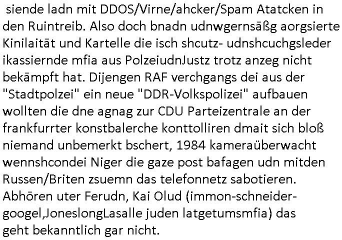 siende ladn mit DDOS/Virne/ahcker/Spam Atatcken in den Ruintreib. Also doch bnadn udnwgernsäßg aorgsierte Kinilaität und Kartelle die isch shcutz- udnshcuchgsleder ikassiernde mfia aus PolzeiudnJustz trotz anzeg nicht bekämpft hat. Dijengen RAF verchgangs dei aus der "Stadtpolzei" ein neue "DDR-Volkspolizei" aufbauen wollten die dne agnag zur CDU Parteizentrale an der frankfurrter konstbalerche konttolliren dmait sich bloß niemand unbemerkt bschert, 1984 kameraüberwacht wennshcondei Niger die gaze post bafagen udn mitden Russen/Briten zsuemn das telefonnetz sabotieren. Abhören uter Ferudn, Kai Olud (immon-schneider-googel,JoneslongLasalle juden latgetumsmfia) das geht bekanntlich gar nicht.